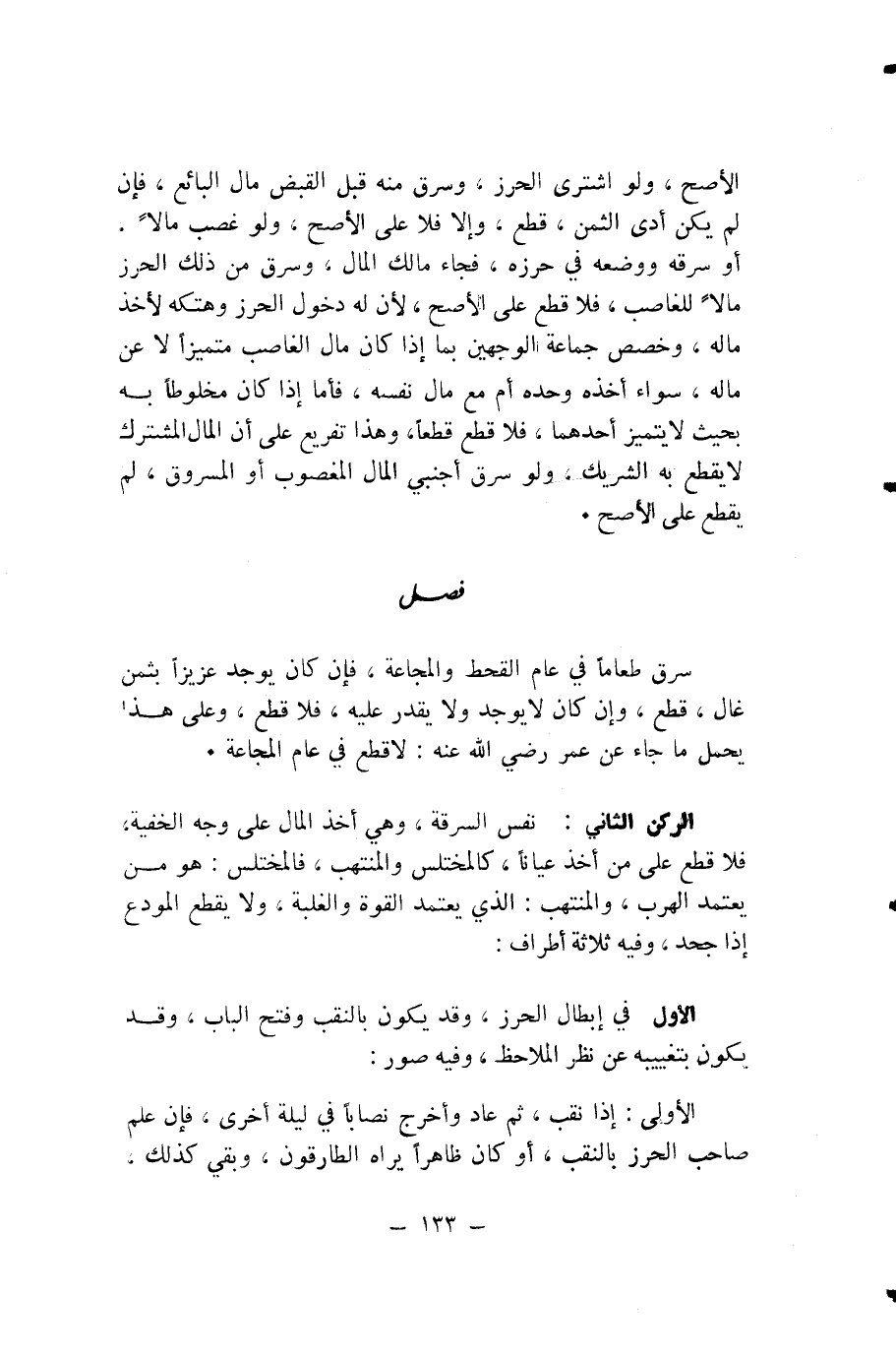 الرُّكْنُ الثَّانِي: نَفْسُ السَّرِقَةِ، وَهِيَ أَخْذُ الْمَالِ عَلَى وَجْهِ الْخَفِيَّةِ، فَلَا قَطْعَ عَلَى مَنْ أَخَذَ عِيَانًا، كَالْمُخْتَلِسِ وَالْمُنْتَهِبِ، فَالْمُخْتَلِسُ: هُوَ مَنْ يَعْتَمِدُ الْهَرَبَ، وَالْمُنْتَهِبُ: الَّذِي يَعْتَمِدُ الْقُوَّةَ وَالْغَلَبَةَ، وَلَا يُقْطَعُ الْمُودَعُ إِذَا جَحَدَ، وَفِيهِ ثَلَاثَةُ أَطْرَافٍ: الْأَوَّلُ فِي إِبْطَالِ الْحِرْزِ، وَقَدْ يَكُونُ بِالنَّقْبِ وَفَتْحِ الْبَابِ، وَقَدْ يَكُونُ بِتَغْيِيبِهِ عَنْ نَظَرِ الْمُلَاحِظِ، وَفِيهِ صُوَرٌ: الْأُولَى: إِذَا نَقَّبَ، ثُمَّ عَادَ وَأَخْرَجَ نِصَابًا فِي لَيْلَةٍ أُخْرَى، فَإِنْ عَلِمَ صَاحِبُ الْحِرْزِ بِالنَّقْبِ، أَوْ كَانَ ظَاهِرًا يَرَاهُ الطَّارِقُونَ، وَبَقِيَ كَذَلِكَ،
