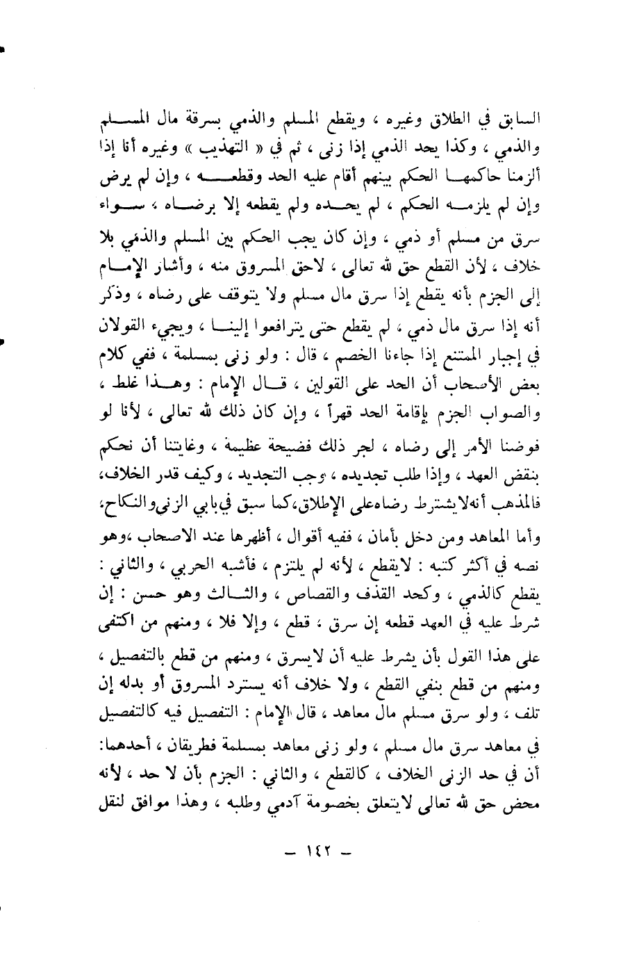 السَّابِقُ فِي الطَّلَاقِ وَغَيْرِهِ، وَيُقْطَعُ الْمُسْلِمُ وَالذِّمِّيُّ بِسَرِقَةِ مَالِ الْمُسْلِمِ وَالذِّمِّيِّ، وَكَذَا يُحَدُّ الذِّمِّيُّ إِذَا زَنَى، ثُمَّ فِي «التَّهْذِيبِ» وَغَيْرِهِ أَنَّا إِذَا أَلْزَمْنَا حَاكِمَهَا الْحُكْمَ بَيْنَهُمْ أَقَامَ عَلَيْهِ الْحَدَّ وَقَطَعَهُ، وَإِنْ لَمْ يَرْضَ وَإِنْ لَمْ يَلْزَمْهُ الْحُكْمُ، لَمْ يَحُدَّهُ وَلَمْ يَقْطَعْهُ إِلَّا بِرِضَاهُ، سَوَاءٌ مِنْ مُسْلِمٍ أَوْ ذِمِّيٍّ، وَإِنْ كَانَ يَجِبُ الْحُكْمُ بَيْنَ الْمُسْلِمِ وَالذِّمِّيِّ بِلَا خِلَافٍ؛ لِأَنَّ الْقَطْعَ حَقُّ اللَّهِ تَعَالَى، لَا حَقُّ الْمَسْرُوقِ مِنْهُ، وَأَشَارَ الْإِمَامُ إِلَى الْجَزْمِ بِأَنَّهُ يُقْطَعُ إِذَا سَرَقَ مَالَ مُسْلِمٍ وَلَا يَتَوَقَّفُ عَلَى رِضَاهُ، وَذَكَرَ أَنَّهُ إِذَا سَرَقَ مَالَ ذِمِّيٍّ، لَمْ يُقْطَعْ حَتَّى يَتَرَافَعُوا إِلَيْنَا، وَيَجِيءُ الْقَوْلَانِ فِي إِجْبَارِ الْمُمْتَنِعِ إِذَا جَاءَنَا الْخَصْمُ، قَالَ: وَلَوْ زَنَى بِمُسْلِمَةٍ، فَفِي كَلَامِ بَعْضِ الْأَصْحَابِ أَنَّ الْحَدَّ عَلَى الْقَوْلَيْنِ، قَالَ الْإِمَامُ: هَذَا غَلَطٌ، وَالصَّوَابُ الْجَزْمُ بِإِقَامَةِ الْحَدِّ قَهْرًا، وَإِنْ كَانَ ذَلِكَ لِلَّهِ تَعَالَى؛ لِأَنَّا لَوْ فَوَّضْنَا الْأَمْرَ إِلَى رِضَاهُ، لَجَرَّ ذَلِكَ فَضِيحَةً عَظِيمَةً، وَغَايَتُنَا أَنْ نَحْكُمَ بِنَقْضِ الْعَهْدِ، وَإِذَا طَلَبَ تَجْدِيدَهُ، وَجَبَ التَّجْدِيدُ، وَكَيْفَ قُدِّرَ الْخِلَافُ، فَالْمَذْهَبُ أَنَّهُ لَا يُشْتَرَطُ رِضَاهُ عَلَى الْإِطْلَاقِ، كَمَا سَبَقَ فِي بَابَيِ الزِّنَى وَالنِّكَاحِ، وَأَمَّا الْمُعَاهِدُ وَمَنْ دَخَلَ بِأَمَانٍ، فَفِيهِ أَقْوَالٌ، أَظْهَرُهَا عِنْدَ الْأَصْحَابِ، وَهُوَ نَصُّهُ فِي أَكْثَرِ كُتُبِهِ: لَا يُقْطَعُ؛ لِأَنَّهُ لَمْ يَلْتَزِمْ، فَأَشْبَهَ الْحَرْبِيَّ، وَالثَّانِي: يُقْطَعُ كَالذِّمِّيِّ، وَكَحَدِّ الْقَذْفِ وَالْقِصَاصِ. وَالثَّالِثُ وَهُوَ حَسَنٌ: إِنْ شَرَطَ عَلَيْهِ فِي الْعَهْدِ قَطَعَهُ إِنْ سَرَقَ، قُطِعَ، وَإِلَّا فَلَا، وَمِنْهُمْ مَنِ اكْتَفَى عَلَى هَذَا الْقَوْلِ بِأَنْ يَشْرُطَ عَلَيْهِ أَنْ لَا يَسْرِقَ، وَمِنْهُمْ مَنْ قَطَعَ بِالتَّفْصِيلِ، وَمِنْهُمْ مَنْ قَطَعَ بِنَفْيِ الْقَطْعِ، وَلَا خِلَافَ أَنَّهُ يَسْتَرِدُّ الْمَسْرُوقَ أَوْ بَدَلَهُ إِنْ تَلَفَ، وَلَوْ سَرَقَ مُسْلِمٌ مَالَ مُعَاهِدٍ، قَالَ الْإِمَامُ: التَّفْصِيلُ فِيهِ كَالتَّفْصِيلِ فِي مُعَاهِدٍ سَرَقَ مَالَ مُسْلِمٍ، وَلَوْ زَنَى مُعَاهِدٌ بِمُسْلِمَةٍ فَطَرِيقَانِ، أَحَدُهُمَا: أَنَّ فِي حَدِّ الزِّنَى الْخِلَافَ، كَالْقَطْعِ، وَالثَّانِي: الْجَزْمُ بِأَنْ لَا حَدَّ؛ لِأَنَّهُ مَحْضُ حَقِّ اللَّهِ تَعَالَى لَا يَتَعَلَّقُ بِخُصُومَةِ آدَمِيٍّ وَطَلَبِهِ، وَهَذَا مُوَافِقٌ لِنَقْلِ