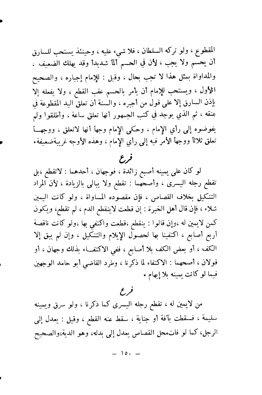 الْمَقْطُوعِ، وَلَوْ تَرَكَهُ السُّلْطَانُ، فَلَا شَيْءَ عَلَيْهِ، وَحِينَئِذٍ يُسْتَحَبُّ لِلسَّارِقِ أَنْ يُحْسَمَ وَلَا يَجَبَ، لِأَنَّ فِي الْحَسْمِ أَلَمًا شَدِيدًا وَقَدْ يَهْلَكُ الضَّعِيفُ، وَالْمُدَاوَاةُ بِمِثْلِ هَذَا لَا تَجِبُ بِحَالٍ، وَقِيلَ: لِلْإِمَامِ إِجْبَارُهُ وَالصَّحِيحُ الْأَوَّلُ، وَيُسْتَحَبُّ لِلْإِمَامِ أَنْ يَأْمُرَ بِالْحَسْمِ عَقِبَ الْقَطْعِ، وَلَا يَفْعَلْهُ إِلَّا بِإِذْنِ السَّارِقِ إِلَّا عَلَى قَوْلِ مَنْ أَجْبَرَهُ، وَالسُّنَّةُ أَنْ تُعَلَّقَ الْيَدُ الْمَقْطُوعَةُ فِي عُنُقِهِ، ثُمَّ الَّذِي يُوجَدُ فِي كُتُبِ الْجُمْهُورِ أَنَّهَا تُعَلَّقُ سَاعَةً، وَأَطْلَقُوا وَلَمْ يُفَوِّضُوهُ إِلَى رَأْيِ الْإِمَامِ، وَحَكَى الْإِمَامُ وَجْهًا أَنَّهَا لَا تُعَلَّقُ، وَوَجْهًا تُعَلَّقُ ثَلَاثًا، وَوَجْهًا الْأَمْرُ فِيهِ إِلَى رَأْيِ الْإِمَامِ، وَهَذِهِ الْأَوْجُهُ غَرِيبَةٌ ضَعِيفَةٌ.