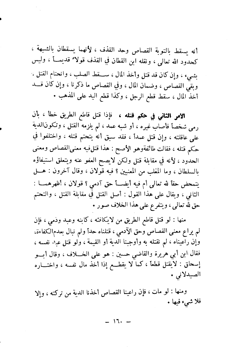 الْأَمْرُ الثَّانِي فِي حُكْمِ قَتْلِهِ، فَإِذَا قَتَلَ قَاطِعُ الطَّرِيقِ خَطَأً، بِأَنْ رَمَى شَخْصًا فَأَصَابَ غَيْرَهُ، أَوْ شِبْهَ عَمْدٍ، لَمْ يَلْزَمْهُ الْقَتْلُ، وَتَكُونُ الدِّيَةُ عَلَى عَاقِلَتِهِ، وَإِنْ قَتَلَ عَمْدًا، فَقَدْ سَبَقَ أَنَّهُ يَتَحَتَّمُ قَتْلُهُ، وَاخْتَلَفُوا فِي حُكْمِ قَتْلِهِ، فَقَالَتْ طَائِفَةٌ وَهُوَ الْأَصَحُّ: هَذَا قَتْلٌ فِيهِ مَعْنَى الْقِصَاصِ وَمَعْنَى الْحُدُودِ؛ لِأَنَّهُ فِي مُقَابَلَةِ قَتْلٍ، وَلَكِنْ لَا يَصِحُّ الْعَفْوُ عَنْهُ وَيَتَعَلَّقُ اسْتِيفَاؤُهُ بِالسُّلْطَانِ، وَمَا الْمُغَلَّبُ مِنَ الْمَعْنَيَيْنِ؟ فِيهِ قَوْلَانِ، وَقَالَ آخَرُونَ: هَلْ يَتَمَحَّضُ حَقًّا لِلَّهِ تَعَالَى أَمْ فِيهِ أَيْضًا حَقُّ آدَمِيٍّ؟ قَوْلَانِ، أَظْهَرُهُمَا: الثَّانِي، وَيُقَالُ عَلَى هَذَا الْقَوْلِ: أَصْلُ الْقَتْلِ فِي مُقَابَلَةِ الْقَتْلِ، وَالتَّحَتُّمُ حَقٌّ لِلَّهِ تَعَالَى، وَيَتَفَرَّعُ عَلَى هَذَا الْخِلَافِ صُوَرٌ.