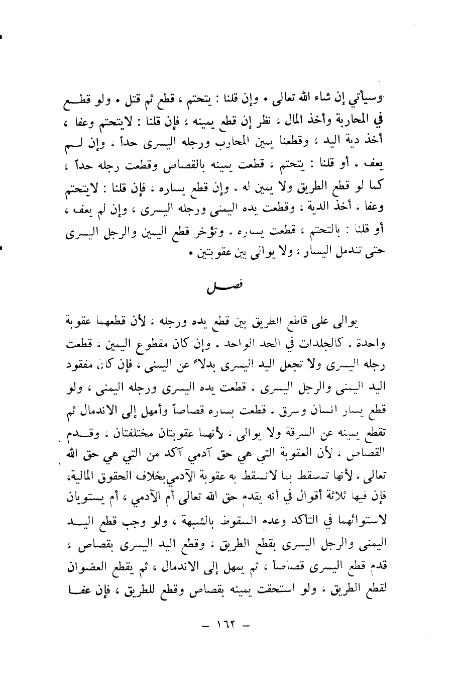 يُوَالَى عَلَى قَاطِعِ الطَّرِيقِ بَيْنَ قَطْعِ يَدِهِ وَرَجْلِهِ؛ لِأَنَّ قَطْعَهُمَا عُقُوبَةٌ وَاحِدَةٌ، كَالْجَلَدَاتِ فِي الْحَدِّ الْوَاحِدِ، وَإِنْ كَانَ مَقْطُوعَ الْيَمِينِ، قُطِعَتْ رِجْلُهُ الْيُسْرَى وَلَا تُجْعَلْ الْيَدُ الْيُسْرَى بَدَلًا عَنِ الْيُمْنَى، فَإِنْ كَانَ مَفْقُودَ الْيَدِ الْيُمْنَى وَالرِّجْلِ الْيُسْرَى، قُطِعَتْ يَدُهُ الْيُسْرَى وَرِجْلُهُ الْيُمْنَى، وَلَوْ قَطَعَ يَسَارَ إِنْسَانٍ وَسَرَقَ، قُطِعَتْ يَسَارُهُ قِصَاصًا وَأُمْهِلَ إِلَى الِانْدِمَالِ ثُمَّ تُقْطَعُ يَمِينُهُ عَنِ السَّرِقَةِ وَلَا يُوَالَى؛ لِأَنَّهُمَا عُقُوبَتَانِ مُخْتَلِفَتَانِ، وَقُدِّمَ الْقِصَاصُ؛ لِأَنَّ الْعُقُوبَةَ الَّتِي هِيَ حَقُّ آدَمِيٍّ آكِدٌ مِنَ الَّتِي هِيَ حَقُّ اللَّهِ تَعَالَى؛ لِأَنَّهَا تُسْقَطُ بِمَا لَا تَسْقُطُ بِهِ عُقُوبَةُ الْآدَمِيِّ بِخِلَافِ الْحُقُوقِ الْمَالِيَّةِ، فَإِنَّ فِيهَا ثَلَاثَةَ أَقْوَالٍ فِي أَنَّهُ يُقَدِّمُ حَقَّ اللَّهِ تَعَالَى أَمِ الْآدَمِيِّ، أَمْ يَسْتَوِيَانِ لِاسْتِوَائِهِمَا فِي التَّأَكُّدِ وَعَدَمِ السُّقُوطِ بِالشُّبْهَةِ، وَلَوْ وَجَبَ قَطْعُ الْيَدِ الْيُمْنَى وَالرِّجْلِ الْيُسْرَى بِقَطْعِ الطَّرِيقِ، وَقَطْعُ الْيَدِ الْيُسْرَى بِقِصَاصٍ، قُدِّمَ قَطْعُ الْيُسْرَى قِصَاصًا، ثُمَّ يُمْهَلُ إِلَى الِانْدِمَالِ، ثُمَّ يُقْطَعُ الْعُضْوَانِ لِقَطْعِ الطَّرِيقِ، وَلَوِ اسْتَحَقَّتْ يَمِينُهُ بِقِصَاصٍ وَقَطْعٍ لِلطَّرِيقِ، فَإِنْ عَفَا