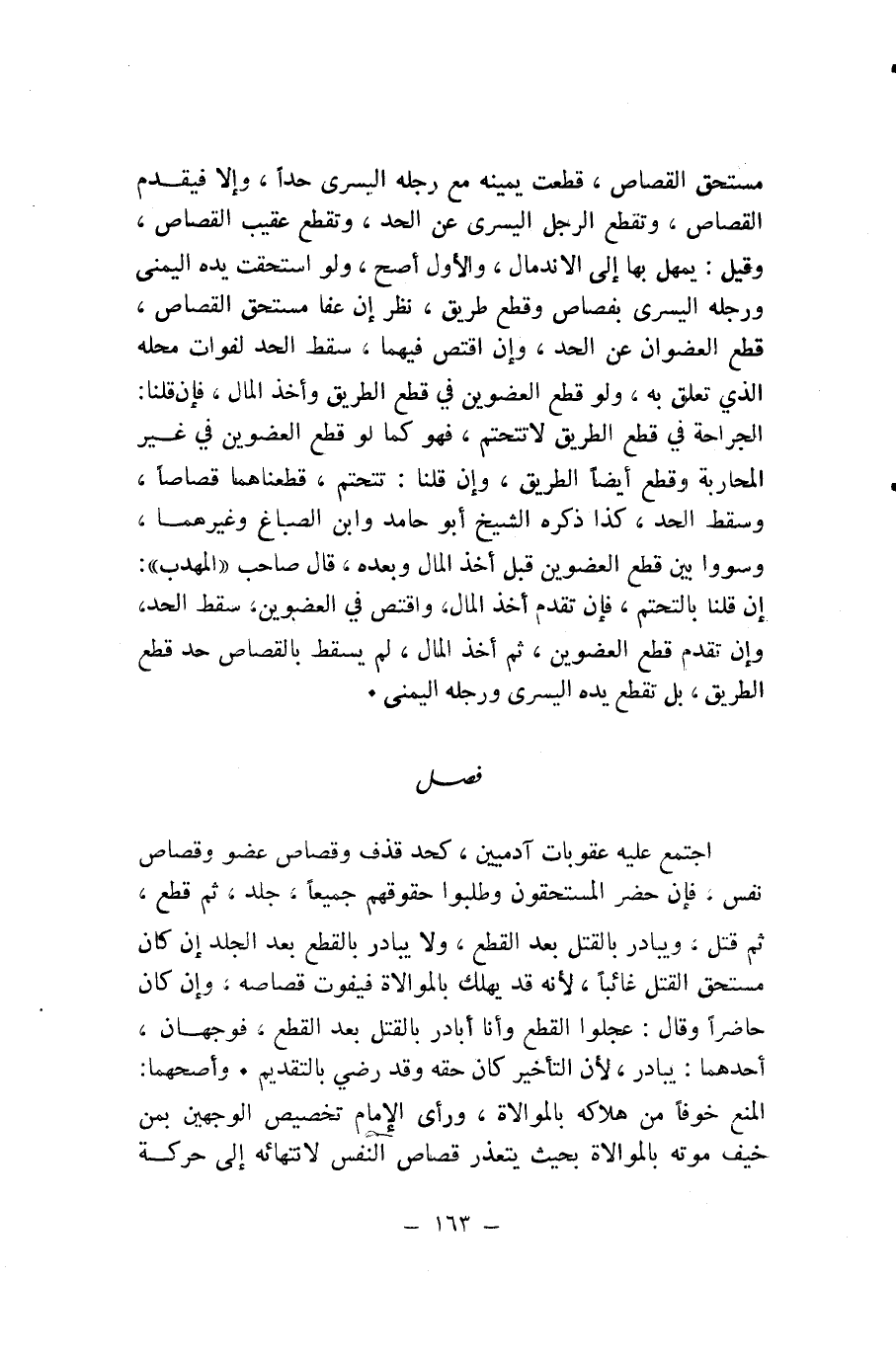 مُسْتَحِقُّ الْقِصَاصِ، قُطِعَتْ يَمِينُهُ مَعَ رِجْلِهِ الْيُسْرَى حَدًّا، وَإِلَّا فَيُقَدَّمُ الْقِصَاصُ، وَتُقْطَعُ الرِّجْلُ الْيُسْرَى عَنِ الْحَدِّ، وَتُقْطَعُ عُقَيْبَ الْقِصَاصِ، وَقِيلَ: يُمْهَلُ بِهَا إِلَى الِانْدِمَالِ، وَالْأَوَّلُ أَصَحُّ، وَلَوِ اسْتَحَقَّتْ يَدُهُ الْيُمْنَى وَرِجْلُهُ الْيُسْرَى بِقِصَاصٍ وَقَطْعِ طَرِيقٍ، نُظِرَ إِنْ عَفَا مُسْتَحِقُّ الْقِصَاصِ، قُطِعَ الْعُضْوَانِ عَنِ الْحَدِّ، وَإِنِ اقْتَصَّ فِيهِمَا، سَقَطَ الْحَدُّ لِفَوَاتِ مَحَلِّهِ الَّذِي تَعَلَّقَ بِهِ، وَلَوْ قَطَعَ الْعُضْوَيْنِ فِي قَطْعِ الطَّرِيقِ وَأَخَذَ الْمَالَ، فَإِنْ قُلْنَا: الْجِرَاحَةُ فِي قَطْعِ الطَّرِيقِ لَا تَتَحَتَّمُ، فَهُوَ كَمَا لَوْ قَطَعَ الْعُضْوَيْنِ فِي غَيْرِ الْمُحَارَبَةِ وَقَطَعَ أَيْضًا الطَّرِيقَ، وَإِنْ قُلْنَا: تَتَحَتَّمُ، قَطَعْنَاهُمَا قِصَاصًا، وَسَقَطَ الْحَدُّ، كَذَا ذَكَرَهُ الشَّيْخُ أَبُو حَامِدٍ وَابْنُ الصَّبَّاغِ وَغَيْرُهُمَا، وَسَوَّوْا بَيْنَ قَطْعِ الْعُضْوَيْنِ قَبْلَ أَخْذِ الْمَالِ وَبَعْدَهُ، قَالَ صَاحِبُ «الْمُهَذَّبِ» : إِنْ قُلْنَا بِالتَّحَتُّمِ، فَإِنْ تَقَدَّمَ أَخْذُ الْمَالِ، وَاقْتُصَّ فِي الْعُضْوَيْنِ، سَقَطَ الْحَدُّ، وَإِنْ تَقَدَّمَ قَطْعُ الْعُضْوَيْنِ، ثُمَّ أَخَذَ الْمَالَ، لَمْ يَسْقُطْ بِالْقِصَاصِ حَدُّ قَطْعِ الطَّرِيقِ، بَلْ تُقْطَعُ يَدُهُ الْيُسْرَى وَرِجْلُهُ الْيُمْنَى.