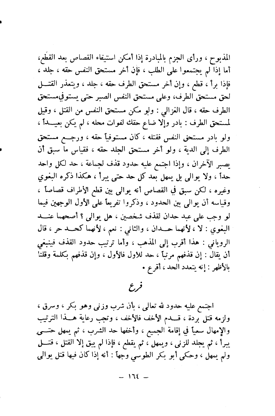 الْمَذْبُوحِ، وَرَأَى الْجَزْمَ بِالْمُبَادَرَةِ إِذَا أَمْكَنَ اسْتِيفَاءُ الْقِصَاصِ بَعْدَ الْقَطْعِ، أَمَّا إِذَا لَمْ يَجْتَمِعُوا عَلَى الطَّلَبِ، فَإِنْ أَخَّرَ مُسْتَحِقُّ النَّفْسِ حَقَّهُ، جُلِدَ، فَإِذَا بَرِأَ، قُطِعَ، وَإِنْ أَخَّرَ مُسْتَحِقُّ الطَّرْفِ حَقَّهُ، جُلِدَ، وَيَتَعَذَّرُ الْقَتْلُ لِحَقِّ مُسْتَحِقِّ الطَّرْفِ، وَعَلَى مُسْتَحِقِّ النَّفْسِ الصَّبْرُ حَتَّى يَسْتَوْفِيَ مُسْتَحِقُّ الطَّرْفِ حَقَّهُ، قَالَ الْغَزَالِيُّ: وَلَوْ مُكِّنَ مُسْتَحِقُّ النَّفْسِ مِنَ الْقَتْلِ، وَقِيلَ لِمُسْتَحِقِّ الطَّرْفِ: بَادِرْ وَإِلَّا ضَاعَ حَقُّكَ لِفَوَاتِ مَحَلِّهِ، لَمْ يَكُنْ بَعِيدًا، وَلَوْ بَادَرَ مُسْتَحِقُّ النَّفْسِ فَقَتَلَهُ، كَانَ مُسْتَوْفِيًا حَقَّهُ، وَرَجَعَ مُسْتَحِقُّ الطَّرْفِ إِلَى الدِّيَةِ، وَلَوْ أَخَّرَ مُسْتَحِقُّ الْجَلْدِ حَقَّهُ، فَقِيَاسُ مَا سَبَقَ أَنْ يَصْبِرَ الْآخَرَانِ، وَإِذَا اجْتَمَعَ عَلَيْهِ حُدُودُ قَذْفٍ لِجَمَاعَةٍ، حُدَّ لِكُلِّ وَاحِدٍ حَدًّا، وَلَا يُوَالَى بَلْ يُمْهَلُ بَعْدَ كُلِّ حَدٍّ حَتَّى يَبْرَأَ، هَكَذَا ذَكَرَهُ الْبَغَوِيُّ وَغَيْرُهُ، لَكِنَّهُ سَبَقَ فِي الْقِصَاصِ أَنَّهُ يُوَالَى بَيْنَ قَطْعِ الْأَطْرَافِ قِصَاصًا، وَقِيَاسُهُ أَنْ يُوَالَى بَيْنَ الْحُدُودِ، وَذَكَرُوا تَفْرِيعًا عَلَى الْأَوَّلِ الْوَجْهَيْنِ فِيمَا لَوْ وَجَبَ عَلَى عَبْدٍ حَدَّانِ لَقَذْفِ شَخْصَيْنِ، هَلْ يُوَالَى؟ أَصَحُّهُمَا عِنْدَ الْبَغَوِيِّ: لَا؛ لِأَنَّهُمَا حَدَّانِ، وَالثَّانِي: نَعَمْ؛ لِأَنَّهُمَا كَحَدِّ حُرٍّ، قَالَ الرُّويَانِيُّ: هَذَا أَقْرَبُ إِلَى الْمَذْهَبِ، وَأَمَّا تَرْتِيبُ حُدُودِ الْقَذْفِ فَيَنْبَغِي أَنْ يُقَالَ: إِنْ قَذَفَهُمْ مُرَتِّبًا، حُدَّ لِلْأَوَّلِ فَالْأَوَّلِ، وَإِنْ قَذْفَهُمْ بِكَلِمَةٍ وَقُلْنَا بِالْأَظْهَرِ: إِنَّهُ يَتَعَدَّدُ الْحَدُّ، أُقْرِعَ.