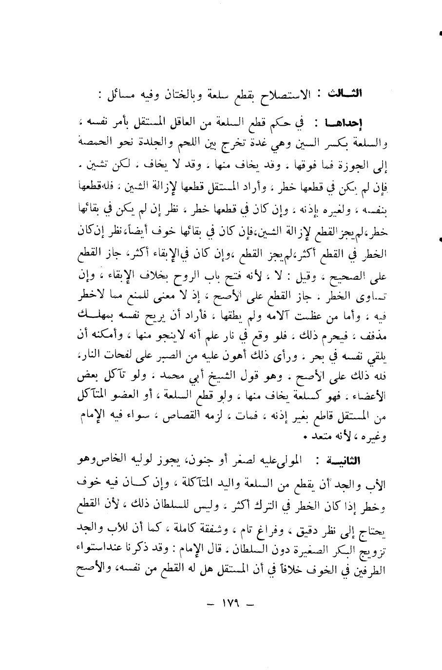 الثَّالِثُ: الِاسْتِصْلَاحُ بِقَطْعِ سِلْعَةٍ وَبِالْخِتَانِ وَفِيهِ مَسَائِلُ: إِحْدَاهَا: فِي حُكْمِ قَطْعِ السِّلْعَةِ مِنَ الْعَاقِلِ الْمُسْتَقِلِّ بِأَمْرِ نَفْسِهِ، وَالسِّلْعَةُ بِكَسْرِ السِّينِ وَهِيَ غُدَّةٌ تَخْرُجُ بَيْنَ اللَّحْمِ وَالْجِلْدَةِ نَحْوُ الْحِمْصَةِ إِلَى الْجَوْزَةِ فَمَا فَوْقَهَا، وَقَدْ يُخَافُ مِنْهَا، وَقَدْ لَا يُخَافُ، لَكِنْ تُشِينُ، فَإِنْ لَمْ يَكُنْ فِي قَطْعِهَا خَطْرٌ، وَأَرَادَ الْمُسْتَقِلُّ قَطْعَهَا لِإِزَالَةِ الشَّيْنِ، فَلَهُ قَطْعُهَا بِنَفْسِهِ، وَلِغَيْرِهِ بِإِذْنِهِ، وَإِنْ كَانَ فِي قَطْعِهَا خَطْرٌ، نُظِرَ إِنْ لَمْ يَكُنْ فِي بَقَائِهَا خَطَرٌ، لَمْ يَجُزِ الْقَطْعُ لِإِزَالَةِ الشَّيْنِ، فَإِنْ كَانَ فِي بَقَائِهَا خَوْفٌ أَيْضًا، نُظِرَ إِنْ كَانَ الْخَطَرُ فِي الْقَطْعِ أَكْثَرَ، لَمْ يَجُزِ الْقَطْعُ، وَإِنْ كَانَ فِي الْإِبْقَاءِ أَكْثَرَ، جَازَ الْقَطْعُ عَلَى الصَّحِيحِ، وَقِيلَ: لَا؛ لِأَنَّهُ فَتْحُ بَابِ الرُّوحِ بِخِلَافِ الْإِبْقَاءِ، وَإِنْ تَسَاوَى الْخَطَرُ، جَازَ الْقَطْعُ عَلَى الْأَصَحِّ؛ إِذْ لَا مَعْنَى لِلْمَنْعِ مِمَّا لَا خَطَرَ فِيهِ، وَأَمَّا مَنْ عَظُمَتْ آلَامُهُ وَلَمْ يُطِقْهَا، فَأَرَادَ أَنْ يُرِيحَ نَفْسَهُ بِمُهْلِكٍ مُذَفَّفٍ، فَيَحْرُمُ ذَلِكَ، فَلَوْ وَقَعَ فِي نَارٍ عَلِمَ أَنَّهُ لَا يَنْجُو مِنْهَا، وَأَمْكَنَهُ أَنْ يُلْقِيَ نَفْسَهُ فِي بَحْرٍ، وَرَأَى ذَلِكَ أَهْوَنَ عَلَيْهِ مِنَ الصَّبْرِ عَلَى لَفَحَاتِ النَّارِ، فَلَهُ ذَلِكَ عَلَى الْأَصَحِّ، وَهُوَ قَوْلُ الشَّيْخِ أَبِي مُحَمَّدٍ، وَلَوْ تَآكَلَ بَعْضُ الْأَعْضَاءِ، فَهُوَ كَسِلْعَةٍ يَخَافُ مِنْهَا، وَلَوْ قَطَعَ السِّلْعَةَ، أَوِ الْعُضْوَ الْمُتَآكِلَ مِنَ الْمُسْتَقِلِّ قَاطِعٌ بِغَيْرِ إِذْنِهِ، فَمَاتَ، لَزِمَهُ الْقِصَاصُ، سَوَاءٌ فِيهِ الْإِمَامُ وَغَيْرُهُ؛ لِأَنَّهُ مُتَعَدٍّ.