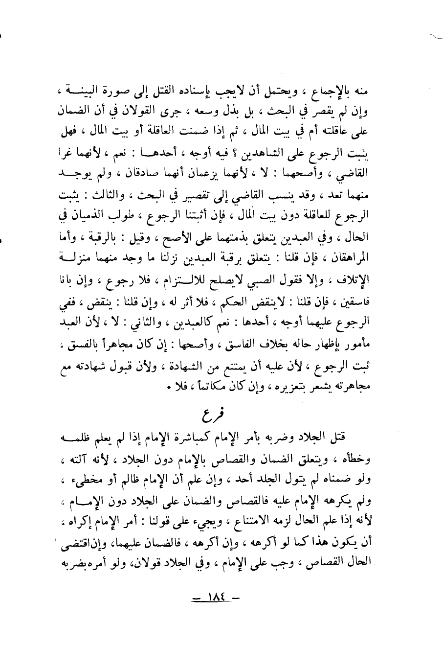 مِنْهُ بِالْإِجْمَاعِ، وَيُحْتَمَلُ أَنْ لَا يَجِبَ بِإِسْنَادِهِ الْقَتْلُ إِلَى صُورَةِ الْبَيِّنَةِ، وَإِنْ لَمْ يُقَصِّرْ فِي الْبَحْثِ، بَلْ بَذَلَ وُسْعَهُ، جَرَى الْقَوْلَانِ فِي أَنَّ الضَّمَانَ عَلَى عَاقِلَتِهِ أَمْ فِي بَيْتِ الْمَالِ ثُمَّ إِذَا ضَمِنَتِ الْعَاقِلَةُ أَوْ بَيْتُ الْمَالِ، فَهَلْ يَثْبُتُ الرُّجُوعُ عَلَى الشَّاهِدَيْنِ؟ فِيهِ أَوْجُهٌ، أَحَدُهَا: نَعَمْ؛ لِأَنَّهُمَا غَرَّا الْقَاضِيَ، وَأَصَحُّهُمَا: لَا؛ لِأَنَّهُمَا يَزْعُمَانِ أَنَّهُمَا صَادِقَانِ، وَلَمْ يُوجَدْ مِنْهُمَا تَعَدٍّ، وَقَدْ يُنْسَبُ الْقَاضِي إِلَى تَقْصِيرٍ فِي الْبَحْثِ. وَالثَّالِثُ: يَثْبُتُ الرُّجُوعُ لِلْعَاقِلَةِ دُونَ بَيْتِ الْمَالِ، فَإِنْ أَثْبَتْنَا الرُّجُوعَ، طُولِبَ الذِّمِّيَّانِ فِي الْحَالِ، وَفِي الْعَبْدَيْنِ يَتَعَلَّقُ بِذِمَّتِهِمَا عَلَى الْأَصَحِّ، وَقِيلَ: بِالرَّقَبَةِ، وَأَمَّا الْمُرَاهِقَانِ، فَإِنْ قُلْنَا: يَتَعَلَّقُ بِرَقَبَةِ الْعَبْدَيْنِ نَزَّلْنَا مَا وُجِدَ مِنْهُمَا مَنْزِلَةَ الْإِتْلَافِ، وَإِلَّا فَقَوْلُ الصَّبِيِّ لَا يَصْلُحُ لِلِالْتِزَامِ، فَلَا رُجُوعَ، وَإِنْ بَانَا فَاسِقَيْنِ، فَإِنْ قُلْنَا: لَا يَنْقُضُ الْحُكْمَ، فَلَا أَثَرَ لَهُ، وَإِنْ قُلْنَا: يَنْقُضُ، فَفِي الرُّجُوعِ عَلَيْهِمَا أَوْجُهٌ، أَحَدُهَا: نَعَمْ كَالْعَبْدَيْنِ، وَالثَّانِي: لَا؛ لِأَنَّ الْعَبْدَ مَأْمُورٌ بِإِظْهَارِ حَالِهِ بِخِلَافِ الْفَاسِقِ، وَأَصَحُّهَا: إِنْ كَانَ مُجَاهِرًا بِالْفِسْقِ، ثَبَتَ الرُّجُوعُ؛ لِأَنَّ عَلَيْهِ أَنْ يَمْتَنِعَ مِنَ الشَّهَادَةِ، وَلِأَنَّ قَبُولَ شَهَادَتِهِ مَعَ مُجَاهَرَتِهِ يُشْعِرُ بِتَعْزِيرِهِ، وَإِنْ كَانَ مُكَاتِمًا، فَلَا.