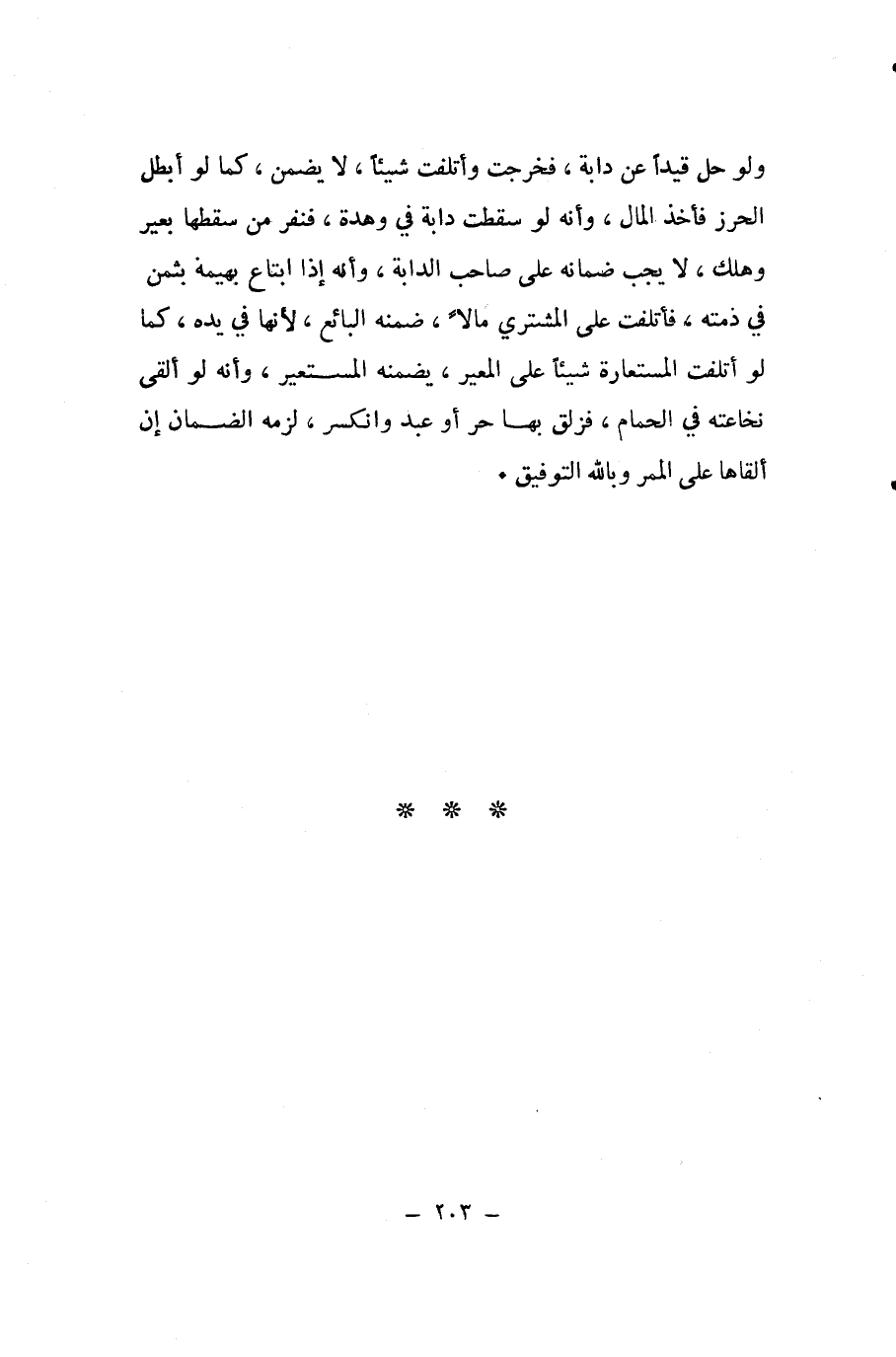 وَلَوْ حَلَّ قَيْدًا عَنْ دَابَّةٍ، فَخَرَجَتْ وَأَتْلَفَتْ شَيْئًا، لَا يَضْمَنُ، كَمَا لَوْ أَبْطَلَ الْحِرْزَ فَأَخَذَ الْمَالَ، وَأَنَّهُ لَوْ سَقَطَتْ دَابَّةٌ فِي وَهْدَةٍ، فَنَفَرَ مِنْ سَقْطِهَا بَعِيرٌ وَهَلَكَ، لَا يَجِبُ ضَمَانُهُ عَلَى صَاحِبِ الدَّابَّةِ، وَأَنَّهُ إِذَا ابْتَاعَ بَهِيمَةً بِثَمَنٍ فِي ذِمَّتِهِ، فَأَتْلَفَتْ عَلَى الْمُشْتَرِي مَالًا، ضَمِنَهُ الْبَائِعُ؛ لِأَنَّهَا فِي يَدِهِ، كَمَا لَوْ أَتْلَفَتِ الْمُسْتَعَارَةُ شَيْئًا عَلَى الْمُعِيرِ، يَضْمَنُهُ الْمُسْتَعِيرُ، وَأَنَّهُ لَوْ أَلْقَى نُخَاعَتَهُ فِي الْحَمَّامِ، فَزَلَقَ بِهَا حُرٌّ أَوْ عَبْدٌ وَانْكَسَرَ، لَزِمَهُ الضَّمَانُ إِنْ أَلْقَاهَا عَلَى الْمَمَرِّ وَبِاللَّهِ التَّوْفِيقُ.
