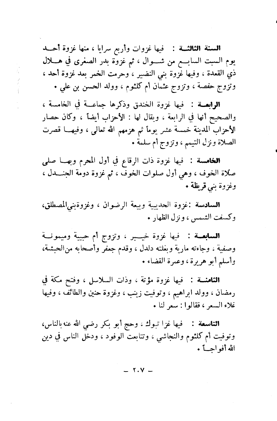 السَّابِعَةُ: فِيهَا غَزْوَةُ خَيْبَرَ، وَتَزَوَّجَ أُمَّ حَبِيبَةَ وَمَيْمُونَةَ وَصْفِيَّةَ، وَجَاءَتْهُ مَارِيَةُ وَبَغْلَتُهُ دُلْدُلُ، وَقَدِمَ جَعْفَرٌ وَأَصْحَابُهُ مِنَ الْحَبَشَةِ، وَأَسْلَمَ أَبُو هُرَيْرَةَ، وَعُمْرَةُ الْقَضَاءِ.