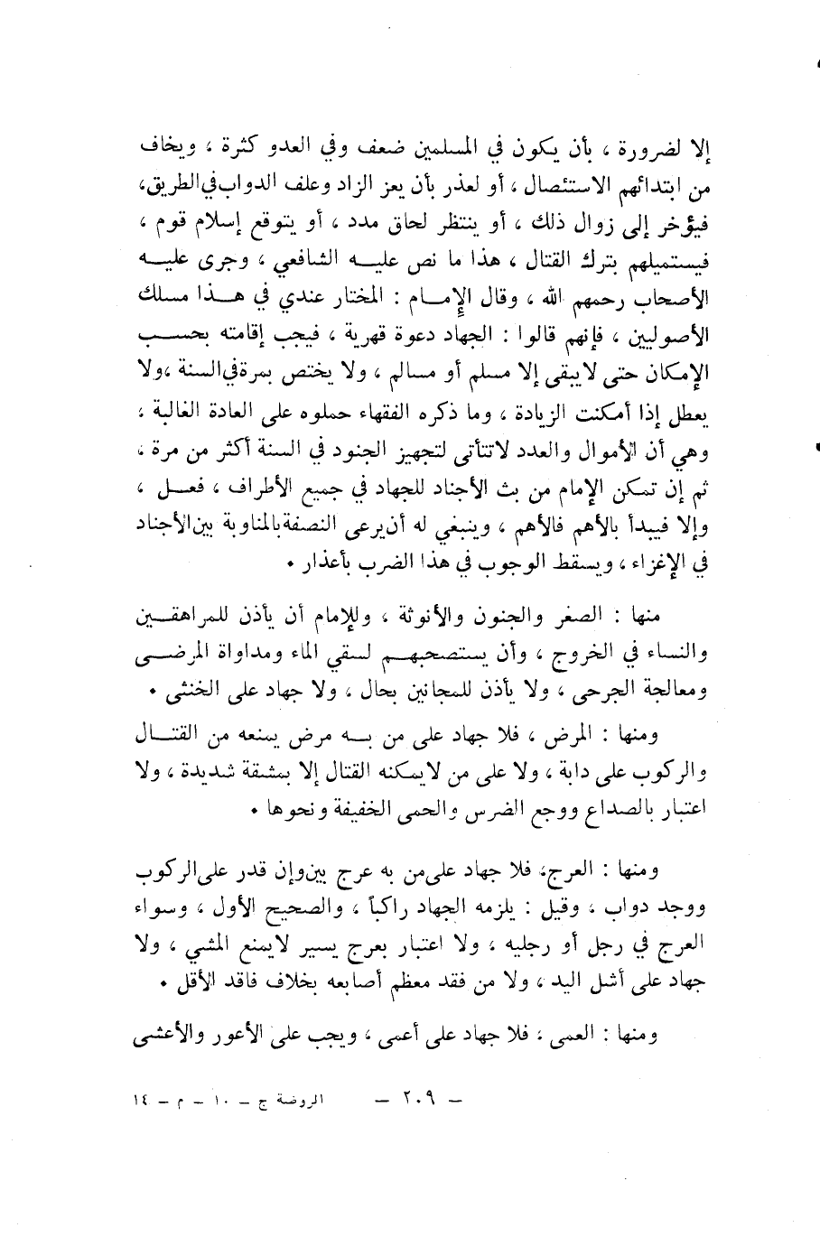 وَمِنْهَا: الْعَرَجُ، فَلَا جِهَادَ عَلَى مَنْ بِهِ عَرَجٌ بَيِّنٌ وَإِنْ قَدَرَ عَلَى الرُّكُوبِ وَوَجَدَ دَوَابَّ، وَقِيلَ: يَلْزَمُهُ الْجِهَادُ رَاكِبًا، وَالصَّحِيحُ الْأَوَّلُ، وَسَوَاءٌ الْعَرَجُ فِي رِجْلٍ أَوْ رِجْلَيْهِ، وَلَا اعْتِبَارَ بِعَرَجٍ يَسِيرٍ لَا يَمْنَعُ الْمَشْيَ، وَلَا جِهَادَ عَلَى أَشَلِّ الْيَدِ، وَلَا مَنْ فَقَدَ مُعْظَمَ أَصَابِعِهِ بِخِلَافِ فَاقِدِ الْأَقَلِّ.