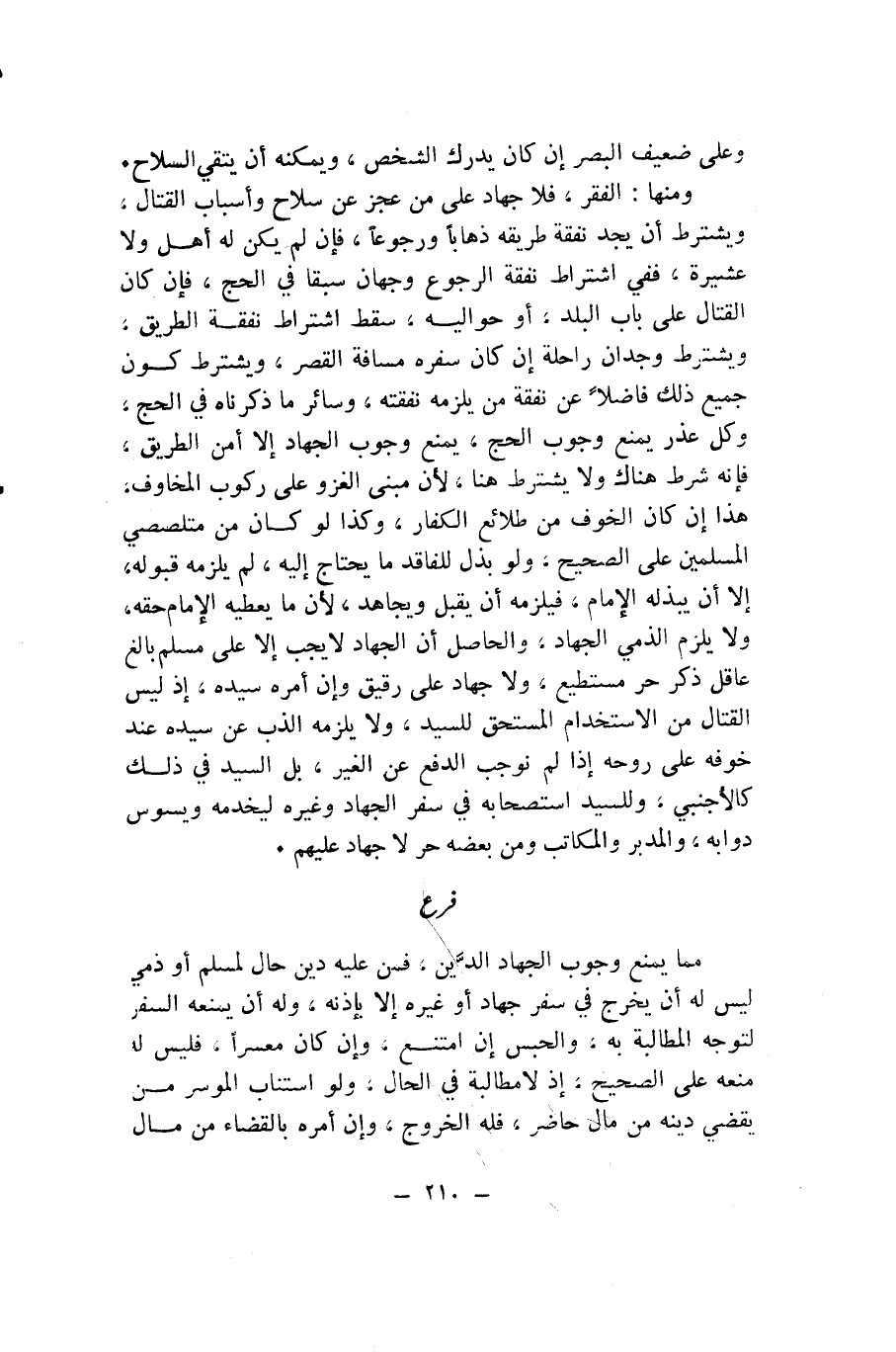 وَمِنْهَا: الْفَقْرُ، فَلَا جِهَادَ عَلَى مَنْ عَجَزَ عَنْ سِلَاحٍ وَأَسْبَابِ الْقِتَالِ، وَيُشْتَرَطُ أَنْ يَجِدَ نَفَقَةَ طَرِيقِهِ ذِهَابًا وَرُجُوعًا، فَإِنْ لَمْ يَكُنْ لَهُ أَهْلٌ وَلَا عَشِيرَةٌ، فَفِي اشْتِرَاطِ نَفَقَةِ الرُّجُوعِ وَجْهَانِ سَبَقَا فِي الْحَجِّ، فَإِنْ كَانَ الْقِتَالُ عَلَى بَابِ الْبَلَدِ، أَوْ حَوَالَيْهِ، سَقَطَ اشْتِرَاطُ نَفَقَةِ الطَّرِيقِ، وَيُشْتَرَطُ وِجْدَانُ رَاحِلَةٍ إِنْ كَانَ سَفَرُهُ مَسَافَةَ الْقَصْرِ، وَيُشْتَرَطُ كَوْنُ جَمِيعِ ذَلِكَ فَاضِلًا عَنْ نَفَقَةِ مَنْ يَلْزَمُهُ نَفَقَتُهُ، وَسَائِرُ مَا ذَكَرْنَاهُ فِي الْحَجِّ، وَكُلُّ عُذْرٍ يَمْنَعُ وُجُوبَ الْحَجِّ، يَمْنَعُ وُجُوبَ الْجِهَادِ إِلَّا أَمْنَ الطَّرِيقِ، فَإِنَّهُ شُرِطَ هُنَاكَ وَلَا يُشْتَرَطُ هُنَا؛ لِأَنَّ مَبْنَى الْغَزْوِ عَلَى رُكُوبِ الْمَخَاوِفِ، هَذَا إِنْ كَانَ الْخَوْفُ مِنْ طَلَائِعِ الْكُفَّارِ، وَكَذَا لَوْ كَانَ مِنْ مُتَلَصِّصِي الْمُسْلِمِينَ عَلَى الصَّحِيحِ، وَلَوْ بَذَلَ لِلْفَاقِدِ مَا يَحْتَاجُ إِلَيْهِ، لَمْ يَلْزَمْهُ قَبُولُهُ، إِلَّا أَنْ يَبْذُلَهُ الْإِمَامُ، فَيَلْزَمُهُ أَنْ يَقْبَلَ وَيُجَاهِدَ؛ لِأَنَّ مَا يُعْطِيهِ الْإِمَامُ حَقَّهُ، وَلَا يَلْزَمُ الذِّمِّيَّ الْجِهَادُ، وَالْحَاصِلُ أَنَّ الْجِهَادَ لَا يَجِبُ إِلَّا عَلَى مُسْلِمٍ بَالِغٍ عَاقِلٍ ذَكَرٍ حُرٍّ مُسْتَطِيعٍ، وَلَا جِهَادَ عَلَى رَقِيقٍ وَإِنْ أَمْرَهُ سَيِّدُهُ؛ إِذْ لَيْسَ الْقِتَالُ مِنَ الِاسْتِخْدَامِ الْمُسْتَحَقِّ لِلسَّيِّدِ، وَلَا يَلْزَمُهُ الذَّبُّ عَنْ سَيِّدِهِ عِنْدَ خَوْفِهِ عَلَى رُوحِهِ إِذَا لَمْ نُوجِبُ الدَّفْعَ عَنِ الْغَيْرِ، بَلِ السَّيِّدُ فِي ذَلِكَ كَالْأَجْنَبِيِّ، وَلِلسَّيِّدِ اسْتِصْحَابُهُ فِي سِفْرِ الْجِهَادِ وَغَيْرِهِ لِيَخْدِمَهُ وَيَسُوسَ دَوَابَّهُ، وَالْمُدَبَّرُ وَالْمُكَاتَبُ وَمَنْ بَعْضُهُ حُرٌّ لَا جِهَادَ عَلَيْهِمْ.