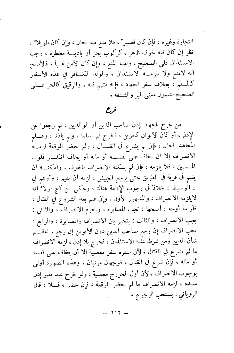 مَنْ خَرَجَ لِلْجِهَادِ بِإِذْنِ صَاحِبِ الدَّيْنِ أَوِ الْوَالِدَيْنِ، ثُمَّ رَجَعُوا عَنِ الْإِذْنِ، أَوْ كَانَ الْأَبَوَانِ كَافِرَيْنِ، فَخَرَجَ ثُمَّ أَسْلَمَا، وَلَمْ يَأْذَنَا، وَعَلِمَ الْمُجَاهِدُ الْحَالَ، فَإِنْ لَمْ يَشْرَعْ فِي الْقِتَالِ، وَلَمْ يَحْضُرِ الْوَقْعَةَ لَزِمَهُ الِانْصِرَافُ إِلَّا أَنْ يَخَافَ عَلَى نَفْسِهِ أَوْ مَالِهِ أَوْ يَخَافَ انْكِسَارَ قُلُوبِ الْمُسْلِمِينَ، فَلَا يَلْزَمُهُ، فَإِنْ لَمْ يُمْكِنْهُ الِانْصِرَافُ لِلْخَوْفِ، وَأَمْكَنَهُ أَنْ يُقِيمَ فِي قَرْيَةٍ فِي الطَّرِيقِ حَتَّى يَرْجِعَ الْجَيْشُ، لَزِمَهُ أَنْ يُقِيمَ، وَأَوْهَمَ فِي «الْوَسِيطِ» خِلَافًا فِي وُجُوبِ الْإِقَامَةِ هُنَاكَ، وَحَكَى ابْنُ كَجٍّ قَوْلًا أَنَّهُ لَا يَلْزَمُهُ الِانْصِرَافُ، وَالْمَشْهُورُ الْأَوَّلُ، وَإِنْ عَلِمَ بَعْدَ الشُّرُوعِ فِي الْقِتَالِ، فَأَرْبَعَةُ أَوْجُهٍ، أَصَحُّهَا: تَجِبُ الْمُصَابَرَةُ، وَيَحْرُمُ الِانْصِرَافُ، وَالثَّانِي: يَجِبُ الِانْصِرَافُ، وَالثَّالِثُ: يَتَخَيَّرُ بَيْنَ الِانْصِرَافِ وَالْمُصَابَرَةِ، وَالرَّابِعُ: يَجِبُ الِانْصِرَافُ إِنْ رَجَعَ صَاحِبُ الدَّيْنِ دُونَ الْأَبَوَيْنِ إِنْ رَجَعَ، لِعَظْمِ شَأْنِ الدَّيْنِ وَمَنْ شُرِطَ عَلَيْهِ الِاسْتِئْذَانُ، فَخَرَجَ بِلَا إِذْنٍ، لَزِمَهُ الِانْصِرَافُ مَا لَمْ يَشْرَعْ فِي الْقِتَالِ؛ لِأَنَّ سَفَرَهُ سَفَرُ مَعْصِيَةٍ إِلَّا أَنْ يَخَافَ عَلَى نَفْسِهِ أَوْ مَالِهِ، فَإِنْ شَرَعَ فِي الْقِتَالِ، فَوَجْهَانِ مُرَتَّبَانِ، وَهَذِهِ الصُّورَةُ أَوْلَى بِوُجُوبِ الِانْصِرَافِ؛ لِأَنَّ أَوَّلَ الْخُرُوجِ مَعْصِيَةٌ، وَلَوْ خَرَجَ عَبْدٌ بِغَيْرِ إِذْنِ سَيِّدِهِ، لَزِمَهُ الِانْصِرَافُ مَا لَمْ يَحْضُرِ الْوَقْعَةَ، فَإِنْ حَضَرَ، فَلَا، قَالَ الرُّويَانِيُّ: يُسْتَحَبُّ الرُّجُوعُ.