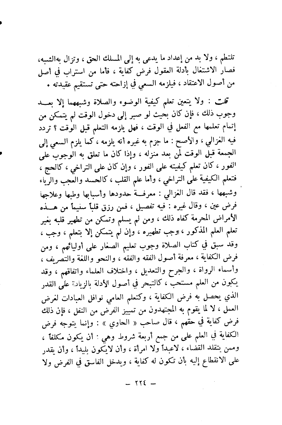 قُلْتُ: وَلَا يَتَعَيَّنُ تَعَلُّمُ كَيْفِيَّةِ الْوُضُوءِ وَالصَّلَاةِ وَشِبْهُهُمَا إِلَّا بَعْدَ وُجُوبِ ذَلِكَ، فَإِنْ كَانَ بِحَيْثُ لَوْ صَبَرَ إِلَى دُخُولِ الْوَقْتِ لَمْ يَتَمَكَّنْ مِنْ إِتْمَامِ تَعَلُّمِهَا مَعَ الْفِعْلِ فِي الْوَقْتِ، فَهَلْ يَلْزَمُهُ التَّعَلُّمُ قَبْلَ الْوَقْتِ؟ تَرَدَّدَ فِيهِ الْغَزَالِيُّ، وَالْأَصَحُّ: مَا جَزَمَ بِهِ غَيْرُهُ أَنَّهُ يَلْزَمُهُ، كَمَا يَلْزَمُ السَّعْيُ إِلَى الْجُمْعَةِ قَبْلَ الْوَقْتِ لِمَنْ بَعُدَ مَنْزِلُهُ، وَإِذَا كَانَ مَا تَعَلَّقَ بِهِ الْوُجُوبُ عَلَى الْفَوْرِ، كَانَ تَعَلُّمُ كَيْفِيَّتِهِ عَلَى الْفَوْرِ، وَإِنْ كَانَ عَلَى التَّرَاخِي، كَالْحَجِّ، فَتَعَلًّمُ الْكَيْفِيَّةِ عَلَى التَّرَاخِي، وَأَمَّا عِلْمُ الْقَلْبِ، كَالْحَسَدِ وَالْعُجْبِ وَالرِّيَاءِ وَشِبْهِهَا، فَقَدْ قَالَ الْغَزَالِيُّ: مَعْرِفَةُ حُدُودِهَا وَأَسْبَابِهَا وَطِبِّهَا وَعِلَاجِهَا فَرْضُ عَيْنٍ، وَقَالَ غَيْرُهُ: فِيهِ تَفْصِيلٌ، فَمْنَ رُزِقَ قَلْبًا سَلِيمًا مِنْ هَذِهِ الْأَمْرَاضِ الْمُحَرَّمَةِ كَفَاهُ ذَلِكَ، وَمَنْ لَمْ يَسَلَمْ وَتَمَكَّنَ مِنْ تَطْهِيرِ قَلْبِهِ بِغَيْرِ تَعَلُّمِ الْعِلْمِ الْمَذْكُورِ، وَجَبَ تَطْهِيرُهُ، وَإِنْ لَمْ يَتَمَكَّنْ إِلَّا بِتَعَلُّمٍ، وَجَبَ، وَقَدْ سَبَقَ فِي كِتَابِ الصَّلَاةِ وُجُوبُ تَعْلِيمِ الصِّغَارِ عَلَى أَوْلِيَائِهِمْ، وَمِنْ فَرْضِ الْكِفَايَةِ، مَعْرِفَةُ أُصُولِ الْفِقْهِ وَالْفِقْهِ، وَالنَّحْوِ وَاللُّغَةِ وَالتَّصْرِيفِ، وَأَسْمَاءِ الرُّوَاةِ، وَالْجَرْحِ وَالتَّعْدِيلِ، وَاخْتِلَافِ الْعُلَمَاءِ وَاتِّفَاقِهِمْ، وَقَدْ يَكُونُ مِنَ الْعِلْمِ مُسْتَحَبٌّ، كَالتَّبَحُّرِ فِي أُصُولِ الْأَدِلَّةِ بِالزِّيَادَةِ عَلَى الْقَدْرِ الَّذِي يَحْصُلُ بِهِ فَرْضُ الْكِفَايَةِ، وَكَتَعَلُّمِ الْعَامِّيِّ نَوَافِلَ الْعِبَادَاتِ لِغَرَضِ الْعَمَلِ، لَا لِمَا يَقُومُ بِهِ الْمُجْتَهِدُونَ مِنْ تَمْيِيزِ الْفَرْضِ مِنَ النَّفْلِ، فَإِنَّ ذَلِكَ فَرْضُ كِفَايَةٍ فِي حَقِّهِمْ، قَالَ صَاحِبُ «الْحَاوِي» : وَإِنَّمَا يَتَوَجَّهُ فَرْضُ الْكِفَايَةِ فِي الْعِلْمِ عَلَى مَنْ جَمَعَ أَرْبَعَةَ شُرُوطٍ وَهِيَ: أَنْ يَكُونَ مُكَلَّفًا، وَمِمَّنْ يَتَقَلَّدُ الْقَضَاءَ، لَا عَبْدًا وَلَا امْرَأَةً، وَأَنْ يَكُونَ بَلِيدًا، وَأَنْ يَقْدِرَ عَلَى الِانْقِطَاعِ إِلَيْهِ بِأَنْ تَكُونَ لَهُ كِفَايَةٌ، وَيَدْخُلُ الْفَاسِقُ فِي الْفَرْضِ وَلَا