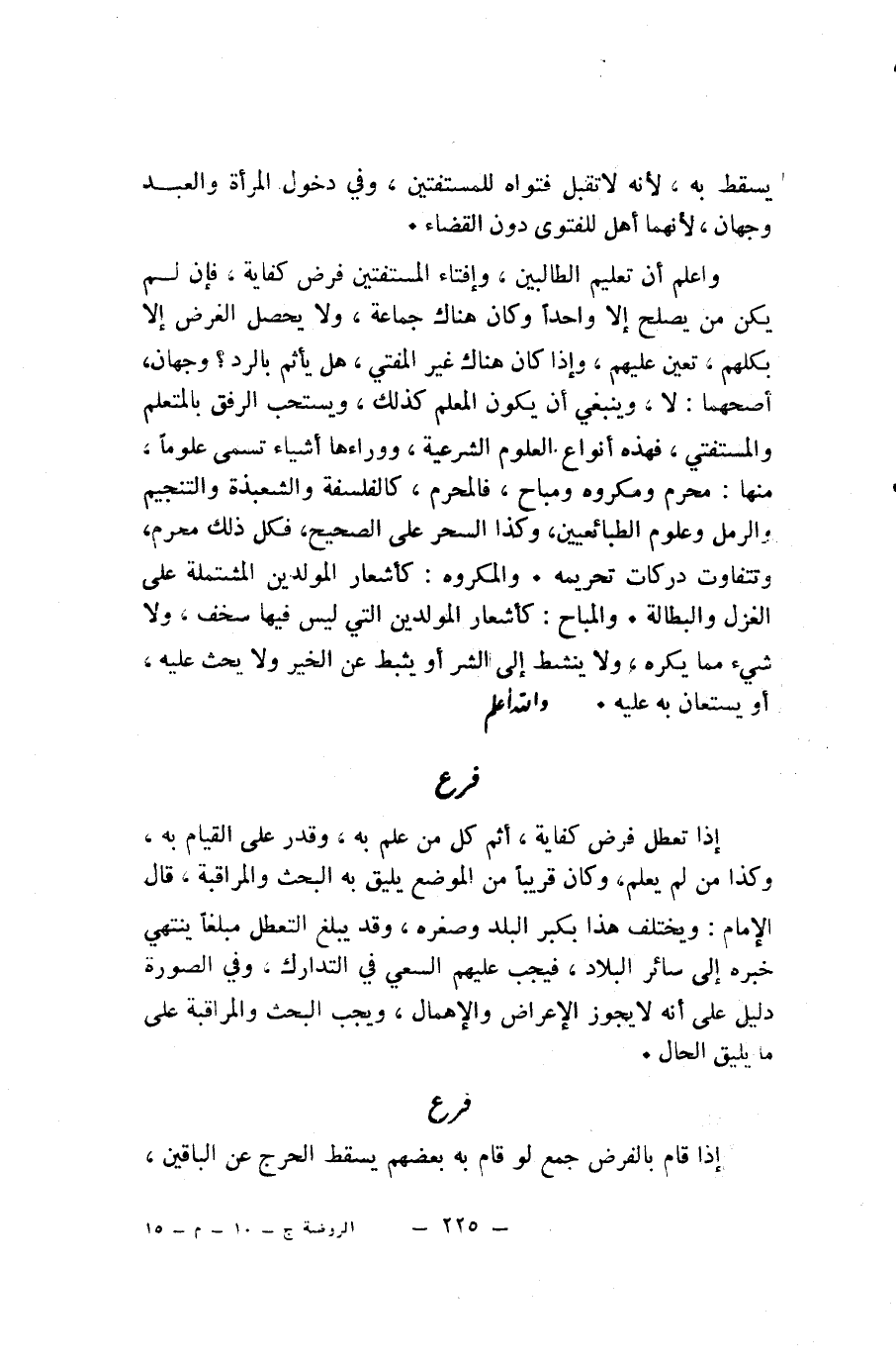 يَسْقُطُ بِهِ؛ لِأَنَّهُ لَا تُقْبَلُ فَتْوَاهُ لِلْمُسْتَفْتِينَ، وَفِي دُخُولِ الْمَرْأَةِ وَالْعَبْدِ وَجْهَانِ؛ لِأَنَّهُمَا أَهْلٌ لِلْفَتْوَى دُونَ الْقَضَاءِ. وَاعْلَمْ أَنَّ تَعْلِيمَ الطَّالِبِينَ، وَإِفْتَاءَ الْمُسْتَفْتِينَ فَرْضُ كِفَايَةٍ، فَإِنْ لَمْ يَكُنْ مَنْ يَصْلُحُ إِلَّا وَاحِدًا وَكَانَ هُنَاكَ جَمَاعَةٌ، وَلَا يَحْصُلُ الْغَرَضُ إِلَّا بِكُلِّهِمْ، تَعَيَّنَ عَلَيْهِمْ، وَإِذَا كَانَ هُنَاكَ غَيْرُ الْمُفْتِي، هَلْ يَأْثَمُ بِالرَّدِّ؟ وَجْهَانِ، أَصَحُّهُمَا: لَا، وَيَنْبَغِي أَنْ يَكُونَ الْمُعَلِّمُ كَذَلِكَ، وَيُسْتَحَبُّ الرِّفْقَ بِالْمُتَعَلِّمِ وَالْمُسْتَفْتِي، فَهَذِهِ أَنْوَاعُ الْعُلُومِ الشَّرْعِيَّةِ، وَوَرَاءُهَا أَشْيَاءٌ تُسَمَّى عُلُومًا، مِنْهَا: مُحَرَّمٌ وَمَكْرُوهٌ وَمُبَاحٌ، فَالْمُحَرَّمُ، كَالْفَلْسَفَةِ وَالشَّعْبَذَةِ وَالتَّنْجِيمِ وَالرَّمْلِ وَعُلُومِ الطَّبَائِعِيِّينَ، وَكَذَا السِّحْرُ عَلَى الصَّحِيحِ، فَكُلُّ ذَلِكَ مُحَرَّمٌ، وَتَتَفَاوَتُ دَرَكَاتُ تَحْرِيمِهِ. وَالْمَكْرُوهُ: كَأَشْعَارِ الْمُوَلَّدِينَ الْمُشْتَمِلَةِ عَلَى الْغَزَلِ وَالْبَطَالَةِ. وَالْمُبَاحُ: كَأَشْعَارِ الْمُوَلَّدِينَ الَّتِي لَيْسَ فِيهَا سُخْفٌ، وَلَا شَيْءَ مِمَّا يُكَرَهُ، وَلَا يُنْشَطُ إِلَى الشَّرِّ أَوْ يُثَبَّطُ عَنِ الْخَيْرِ وَلَا يُحَثُّ عَلَيْهِ، أَوْ يُسْتَعَانُ بِهِ عَلَيْهِ. وَاللَّهُ أَعْلَمُ.