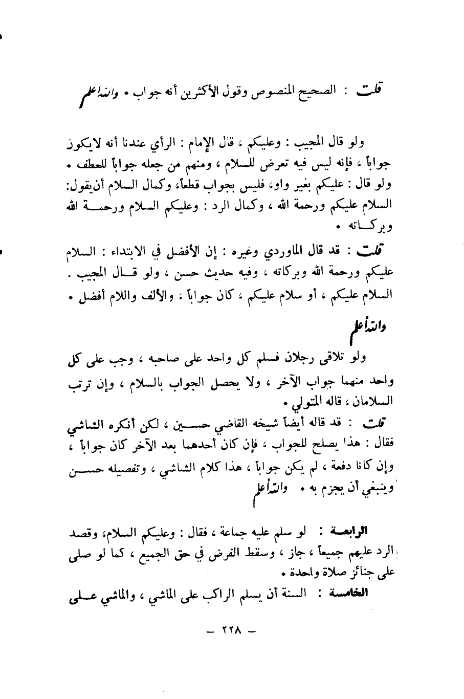 وَلَوْ قَالَ الْمُجِيبُ: وَعَلَيْكُمْ، قَالَ الْإِمَامُ: الرَّأْيُ عِنْدَنَا أَنَّهُ لَا يَكُونُ جَوَابًا، فَإِنَّهُ لَيْسَ فِيهِ تَعَرُّضٌ لِلسَّلَامِ، وَمِنْهُمْ مَنْ جَعَلَهُ جَوَابًا لِلْعَطْفِ. وَلَوْ قَالَ: عَلَيْكُمْ بِغَيْرِ وَاوٍ، فَلَيْسَ بِجَوَابٍ قَطْعًا، وَكَمَالُ السَّلَامِ أَنْ يَقُولَ: السَّلَامُ عَلَيْكُمْ وَرَحْمَةُ اللَّهِ، وَكَمَالُ الرَّدِّ: وَعَلَيْكُمُ السَّلَامُ وَرَحْمَةُ اللَّهِ وَبَرَكَاتُهُ.