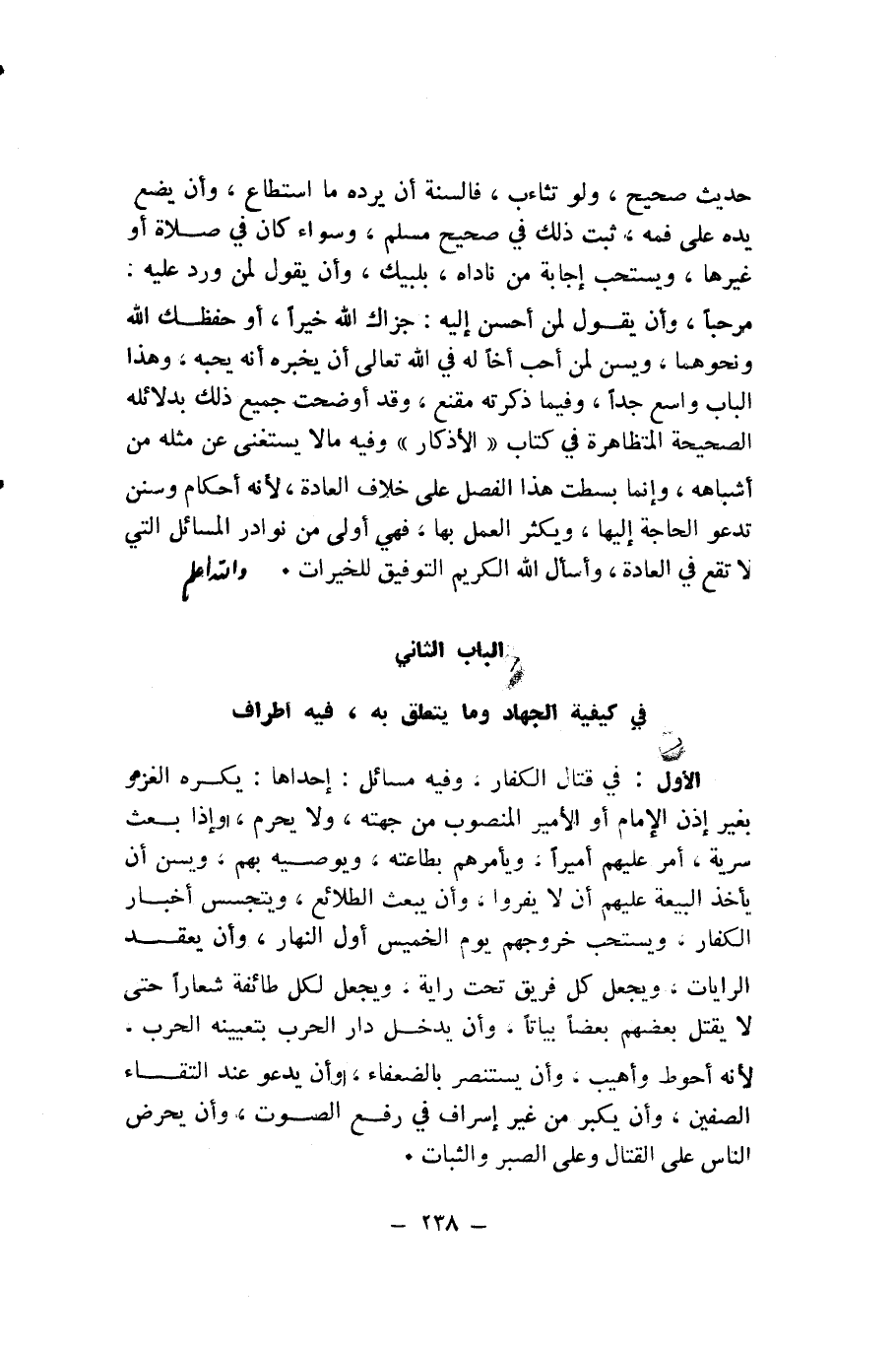 الْأَوَّلُ: فِي قِتَالِ الْكُفَّارِ، وَفِيهِ مَسَائِلُ: إِحْدَاهَا: يُكْرَهُ الْغَزْوُ بِغَيْرِ إِذْنِ الْإِمَامِ أَوِ الْأَمِيرِ الْمَنْصُوبِ مِنْ جِهَتِهِ، وَلَا يَحْرُمُ، وَإِذَا بَعَثَ سَرِّيَّةً، أَمَّرَ عَلَيْهِمْ أَمِيرًا، وَيَأْمُرُهُمْ بِطَاعَتِهِ، وَيُوصِيهِ بِهِمْ، وَيُسَنُّ أَنْ يَأْخُذَ الْبَيْعَةَ عَلَيْهِمْ أَنْ لَا يَفِرُّوا، وَأَنْ يَبْعَثَ الطَّلَائِعَ، وَيَتَجَسَّسَ أَخْبَارَ الْكُفَّارِ، وَيُسْتَحَبُّ خُرُوجُهُمْ يَوْمَ الْخَمِيسِ أَوَّلَ النَّهَارِ، وَأَنْ يَعْقِدَ الرَّايَاتِ، وَيَجْعَلَ كُلَّ فَرِيقٍ تَحْتَ رَايَةٍ، وَيَجْعَلَ لِكُلِّ طَائِفَةٍ شِعَارًا حَتَّى لَا يَقْتُلَ بَعْضُهُمْ بَعْضًا بَيَاتًا، وَأَنْ يَدْخُلَ دَارَ الْحَرْبِ بِتَعْيِينِهِ الْحَرْبَ؛ لِأَنَّهُ أَحْوَطُ وَأَهْيَبُ، وَأَنْ يَسْتَنْصِرَ بِالضُّعَفَاءِ، وَأَنْ يَدْعُوَ عِنْدَ الْتِقَاءِ الصَّفَّيْنِ، وَأَنْ يُكِبِّرَ مِنْ غَيْرِ إِسْرَافٍ فِي رَفْعِ الصَّوْتِ، وَأَنْ يُحَرِّضَ النَّاسَ عَلَى الْقِتَالِ وَعَلَى الصَّبْرِ وَالثَّبَاتِ.