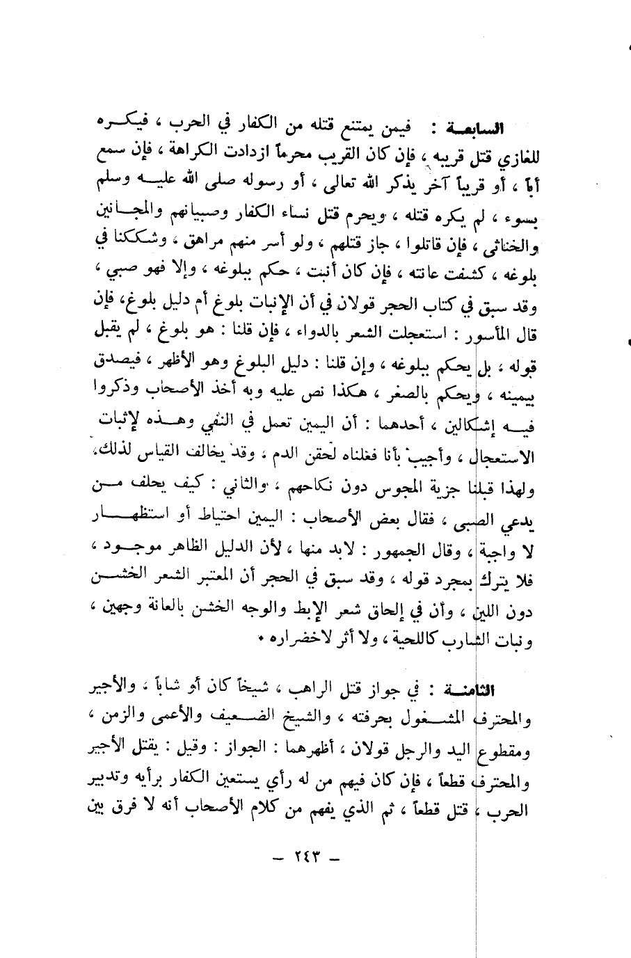 الثَّامِنَةُ: فِي جَوَازِ قَتْلِ الرَّاهِبِ، شَيْخًا كَانَ أَوْ شَابًّا، وَالْأَجِيرِ وَالْمُحْتَرِفِ الْمَشْغُولِ بِحِرْفَتِهِ، وَالشَّيْخِ الضَّعِيفِ وَالْأَعْمَى وَالزَّمِنِ، وَمَقْطُوعِ الْيَدِ وَالرِّجْلِ قَوْلَانِ، أَظْهَرُهُمَا: الْجَوَازُ. وَقِيلَ: يُقْتَلُ الْأَجِيرُ وَالْمُحْتَرِفُ قَطْعًا، فَإِنْ كَانَ فِيهِمْ مَنْ لَهُ رَأْيٌ يَسْتَعِينُ الْكُفَّارُ بِرَأْيِهِ وَتَدْبِيرِ الْحَرْبِ، قُتِلَ قَطْعًا، ثُمَّ الَّذِي يُفْهَمُ مِنْ كَلَامِ الْأَصْحَابِ أَنَّهُ لَا فَرْقَ بَيْنَ