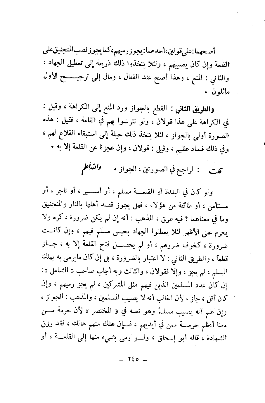 وَلَوْ كَانَ فِي الْبَلْدَةِ أَوِ الْقَلْعَةِ مُسْلِمٌ، أَوْ أَسِيرٌ، أَوْ تَاجِرٌ، أَوْ مُسْتَأْمَنٌ، أَوْ طَائِفَةٌ مِنْ هَؤُلَاءِ، فَهَلْ يَجُوزُ قَصْدُ أَهْلِهَا بِالنَّارِ وَالْمَنْجَنِيقِ وَمَا فِي مَعْنَاهُمَا؟ فِيهِ طُرُقٌ، الْمَذْهَبُ: أَنَّهُ إِنْ لَمْ يَكُنْ ضَرُورَةٌ، كُرِهَ وَلَا يَحْرُمُ عَلَى الْأَظْهَرِ لِئَلَّا يُعَطِّلُوا الْجِهَادَ بِحَبْسِ مُسْلِمٍ فِيهِمْ، وَإِنْ كَانَتْ ضَرُورَةٌ، كَخَوْفِ ضَرَرِهِمْ، أَوْ لَمْ يَحْصُلْ فَتْحُ الْقَلْعَةِ إِلَّا بِهِ، جَازَ قَطْعًا، وَالطَّرِيقُ الثَّانِي: لَا اعْتِبَارَ بِالضَّرُورَةِ، بَلْ إِنْ كَانَ مَا يُرْمَى بِهِ يُهْلِكُ الْمُسْلِمَ، لَمْ يَجُزْ، وَإِلَّا فَقَوْلَانِ، وَالثَّالِثُ وَبِهِ أَجَابَ صَاحِبُ «الشَّامِلِ» : إِنْ كَانَ عَدَدُ الْمُسْلِمِينَ الَّذِينَ فِيهِمْ مِثْلَ الْمُشْرِكِينَ، لَمْ يَجُزْ رَمْيُهُمْ، وَإِنْ كَانَ أَقَلَّ، جَازَ؛ لِأَنَّ الْغَالِبَ أَنَّهُ لَا يُصِيبُ الْمُسْلِمِينَ، وَالْمَذْهَبُ: الْجَوَازُ، وَإِنْ عَلِمَ أَنَّهُ يُصِيبُ مُسْلِمًا وَهُوَ نَصُّهُ فِي «الْمُخْتَصَرِ» لِأَنَّ حُرْمَةَ مَنْ مَعَنَا أَعْظَمُ حُرْمَةً مِمَّنْ فِي أَيْدِيهِمْ، فَإِنْ هَلَكَ مِنْهُمْ هَالِكٌ، فَقَدْ رُزِقَ الشَّهَادَةَ، قَالَهُ أَبُو إِسْحَاقَ، وَلَوْ رَمَى بِشَيْءٍ مِنْهَا إِلَى الْقَلْعَةِ، أَوْ
