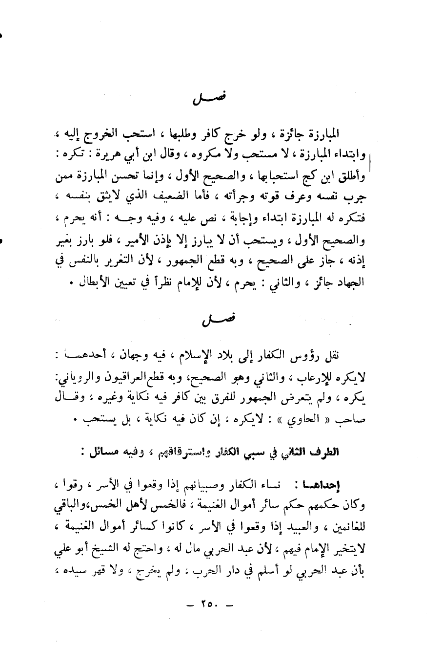 الْمُبَارَزَةُ جَائِزَةٌ، وَلَوْ خَرَجَ كَافِرٌ وَطَلَبَهَا، اسْتُحِبَّ الْخُرُوجُ إِلَيْهِ، وَابْتِدَاءُ الْمُبَارَزَةِ لَا مُسْتَحَبٌّ وَلَا مَكْرُوهٌ، وَقَالَ ابْنُ أَبِي هُرَيْرَةَ: تُكْرَهُ، وَأَطْلَقَ ابْنُ كَجٍّ اسْتِحْبَابَهَا، وَالصَّحِيحُ الْأَوَّلُ، وَإِنَّمَا تَحْسُنُ الْمُبَارَزَةُ مِمَّنْ جَرَّبَ نَفْسَهُ وَعَرَفَ قُوَّتَهُ وَجُرْأَتَهُ، فَأَمَّا الضَّعِيفُ الَّذِي لَا يَثِقُ بِنَفْسِهِ، فَتُكْرَهُ لَهُ الْمُبَارَزَةُ ابْتِدَاءً وَإِجَابَةً، نُصَّ عَلَيْهِ، وَفِيهِ وَجْهٌ: أَنَّهُ يَحْرُمُ، وَالصَّحِيحُ الْأَوَّلُ، وَيُسْتَحَبُّ أَنْ لَا يُبَارِزَ إِلَّا بِإِذْنِ الْأَمِيرِ، فَلَوْ بَارَزَ بِغَيْرِ إِذْنِهِ، جَازَ عَلَى الصَّحِيحِ، وَبِهِ قَطَعَ الْجُمْهُورُ؛ لِأَنَّ التَّغْرِيرَ بِالنَّفْسِ فِي الْجِهَادِ جَائِزٌ، وَالثَّانِي: يَحْرُمُ؛ لِأَنَّ لِلْإِمَامِ نَظَرًا فِي تَعْيِينِ الْأَبْطَالِ.