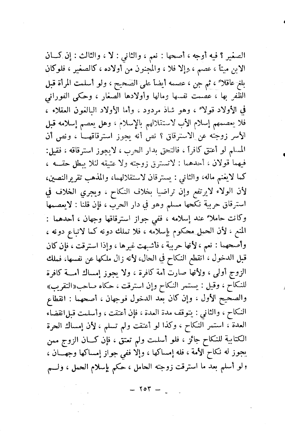 الصَّغِيرَ؟ فِيهِ أَوْجُهٌ، أَصَحُّهَا: نَعَمْ، وَالثَّانِي: لَا، وَالثَّالِثُ: إِنْ كَانَ الِابْنُ مَيِّتًا، عَصَمَ، وَإِلَّا فَلَا، وَالْمَجْنُونُ مِنْ أَوْلَادِهِ، كَالصَّغِيرِ، فَلَوْ كَانَ بَلَغَ عَاقِلًا، ثُمَّ جُنَّ، عَصَمَهُ أَيْضًا عَلَى الصَّحِيحِ، وَلَوْ أَسْلَمَتِ الْمَرْأَةُ قَبْلَ الظَّفَرِ بِهَا، عَصَمَتْ نَفْسَهَا وَمَالَهَا وَأَوْلَادَهَا الصِّغَارَ، وَحَكَى الْفُورَانِيُّ فِي الْأَوْلَادِ قَوْلًا، وَهُوَ شَاذٌّ مَرْدُودٌ، وَأَمَّا الْأَوْلَادُ الْبَالِغُونَ الْعُقَلَاءُ، فَلَا يَعْصِمُهُمْ إِسْلَامُ الْأَبِ لِاسْتِقْلَالِهِمْ بِالْإِسْلَامِ، وَهَلْ يَعْصِمُ إِسْلَامُهُ قَبْلَ الْأَسْرِ زَوْجَتَهُ عَنِ الِاسْتِرْقَاقِ؟ نُصَّ أَنَّهُ يَجُوزُ اسْتِرْقَاقُهَا، وَنُصَّ أَنَّ الْمُسْلِمَ لَوْ أَعْتَقَ كَافِرًا، فَالْتَحَقَ بِدَارِ الْحَرْبِ، لَا يَجُوزُ اسْتِرْقَاقُهُ، فَقِيلَ: فِيهِمَا قَوْلَانِ، أَحَدُهُمَا: لَا تُسْتَرَقُّ زَوْجَتُهُ وَلَا عَتِيقُهُ لِئَلَّا يُبْطَلَ حَقُّهُ، كَمَا لَا يُغْنَمُ مَالُهُ، وَالثَّانِي: يُسْتَرَقَّانِ لِاسْتِقْلَالِهِمَا، وَالْمَذْهَبُ تَقْرِيرُ النَّصَّيْنِ؛ لِأَنَّ الْوَلَاءَ لَا يَرْتَفِعُ وَإِنْ تَرَاضَيَا بِخِلَافِ النِّكَاحِ، وَيَجْرِي الْخِلَافُ فِي اسْتِرْقَاقِ حَرْبِيَّةٍ نَكَحَهَا مُسْلِمٌ وَهُوَ فِي دَارِ الْحَرْبِ، فَإِنْ قُلْنَا: لَا يَعْصِمُهَا وَكَانَتْ حَامِلًا عِنْدَ إِسْلَامِهِ، فَفِي جَوَازِ اسْتِرْقَاقِهَا وَجْهَانِ، أَحَدُهُمَا: الْمَنْعُ؛ لِأَنَّ الْحَمْلَ مَحْكُومٌ بِإِسْلَامِهِ، فَلَا تُمْلَكُ دُونَهُ كَمَا لَا تُبَاعُ دُونَهُ، وَأَصَحُّهُمَا: نَعَمْ؛ لِأَنَّهَا حَرْبِيَّةٌ، فَأَشْبَهَتْ غَيْرَهَا، وَإِذَا اسْتُرِقَّتْ، فَإِنْ كَانَ قَبْلَ الدُّخُولِ، انْقَطَعَ النِّكَاحُ فِي الْحَالِ؛ لِأَنَّهُ زَالَ مِلْكُهَا عَنْ نَفْسِهَا، فَمِلْكُ الزَّوْجِ أَوْلَى، وَلِأَنَّهَا صَارَتْ أَمَةً كَافِرَةً، وَلَا يَجُوزُ إِمْسَاكُ أَمَةٍ كَافِرَةٍ لِلنِّكَاحِ، وَقِيلَ: يَسْتَمِرُّ النِّكَاحُ وَإِنِ اسْتُرِقَّتْ، حَكَاهُ صَاحِبُ «التَّقْرِيبِ» وَالصَّحِيحُ الْأَوَّلُ، وَإِنْ كَانَ بَعْدَ الدُّخُولِ فَوَجْهَانِ، أَصَحُّهُمَا: انْقِطَاعُ النِّكَاحِ، وَالثَّانِي: يُتَوَقَّفُ مُدَّةَ الْعِدَّةِ، فَإِنْ أُعْتِقَتْ، وَأَسْلَمَتْ قَبْلَ انْقِضَاءِ الْعِدَّةِ، اسْتَمَرَّ النِّكَاحُ، وَكَذَا لَوْ أُعْتِقَتْ وَلَمْ تُسْلِمْ؛ لِأَنَّ إِمْسَاكَ الْحُرَّةِ الْكِتَابِيَّةِ لِلنِّكَاحِ جَائِزٌ، فَلَوْ أَسْلَمَتْ وَلَمْ تُعْتَقْ، فَإِنْ كَانَ الزَّوْجُ مِمَّنْ يَجُوزُ لَهُ نِكَاحُ الْأَمَةِ، فَلَهُ إِمْسَاكُهَا، وَإِلَّا فَفِي جَوَازِ إِمْسَاكِهَا وَجْهَانِ، وَلَوْ أَسْلَمَ بَعْدَمَا اسْتُرِقَّتْ زَوْجَتُهُ الْحَامِلُ، حُكِمَ بِإِسْلَامِ الْحَمْلِ، وَلَمْ