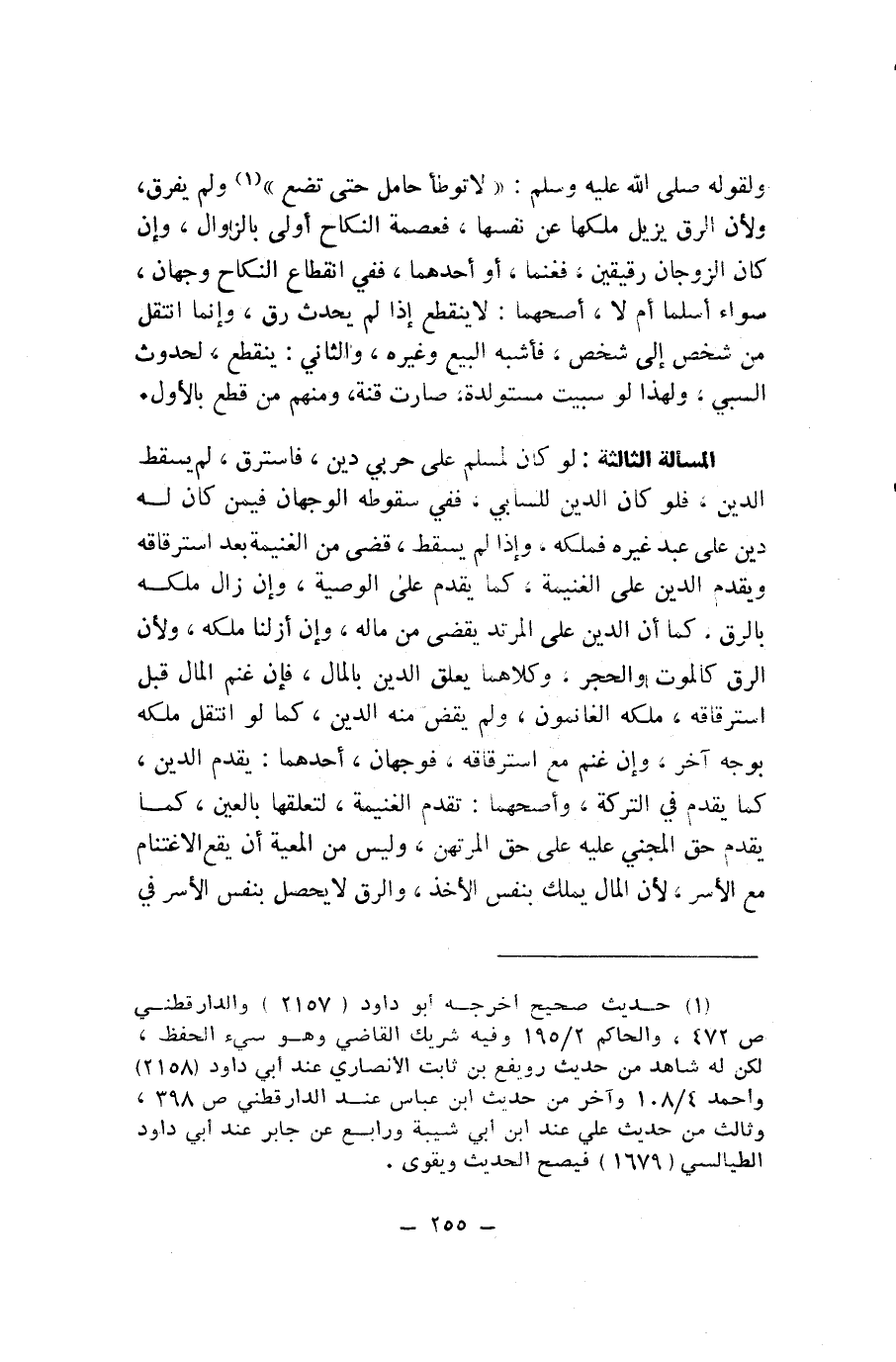 وَلِقَوْلِهِ - صَلَّى اللَّهُ عَلَيْهِ وَسَلَّمَ -: «لَا تُوطَأُ حَامِلٌ حَتَّى تَضَعَ» وَلَمْ يُفَرِّقْ، وَلِأَنَّ الرِّقَّ يُزِيلُ مِلْكَهَا عَنْ نَفْسِهَا، فَعِصْمَةُ النِّكَاحِ أَوْلَى بِالزَّوَالِ، وَإِنْ كَانَ الزَّوْجَانِ رَقِيقَيْنِ، فَغُنِمَا، أَوْ أَحَدُهُمَا، فَفِي انْقِطَاعِ النِّكَاحِ وَجْهَانِ، سَوَاءٌ أَسْلَمَا أَمْ لَا، أَصَحُّهُمَا: لَا يَنْقَطِعُ إِذَا لَمْ يَحْدُثْ رِقٌّ، وَإِنَّمَا انْتَقَلَ مِنْ شَخْصٍ إِلَى شَخْصٍ، فَأَشْبَهَ الْبَيْعَ وَغَيْرَهُ، وَالثَّانِي: يَنْقَطِعُ، لِحُدُوثِ السَّبْيِ، وَلِهَذَا لَوْ سُبِيَتْ مُسْتَوْلَدَةٌ، صَارَتْ قِنَّةً، وَمِنْهُمْ مَنْ قَطَعَ بِالْأَوَّلِ.