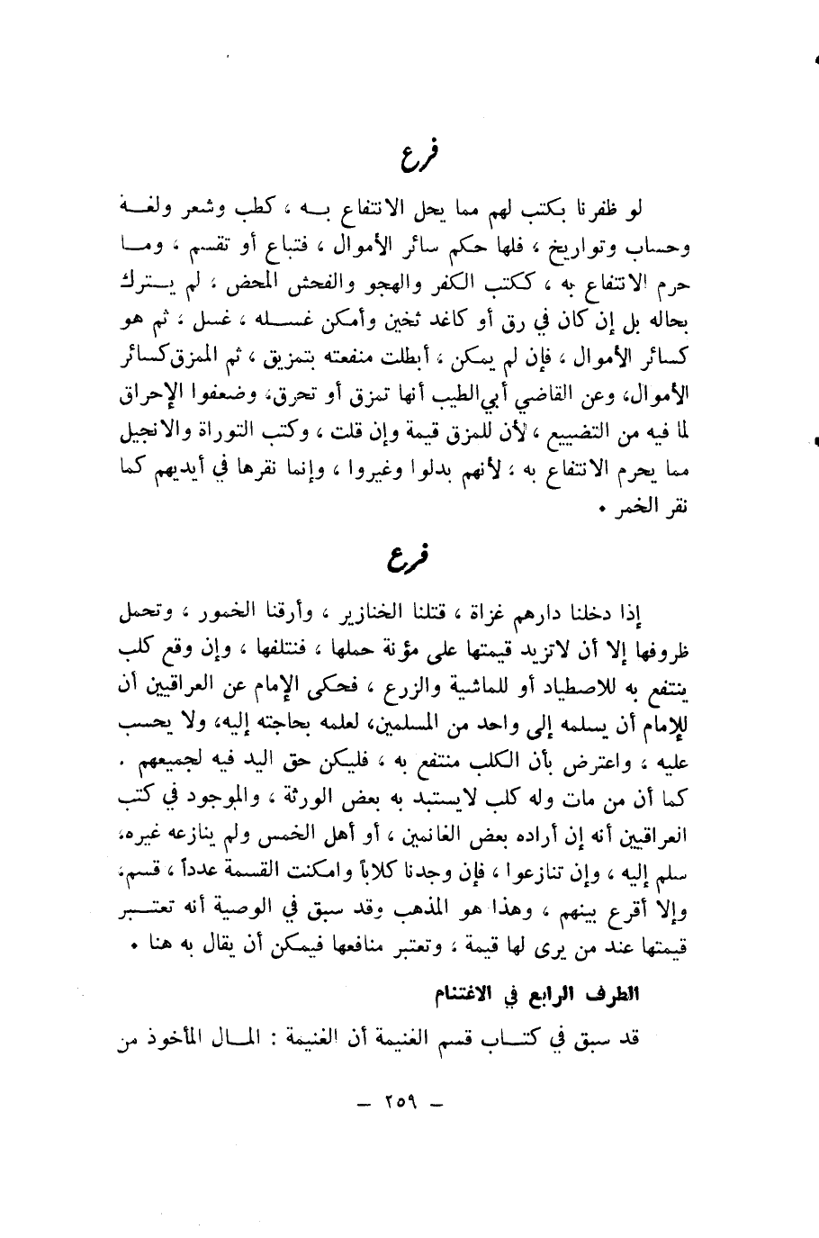 لَوْ ظَفَرْنَا بِكُتُبٍ لَهُمْ مِمَّا يَحِلُّ الِانْتِفَاعُ بِهِ، كَطِبٍّ وَشِعْرٍ وَلُغَةٍ وَحِسَابٍ وَتَوَارِيخَ، فَلَهَا حُكْمُ سَائِرِ الْأَمْوَالِ، فَتُبَاعُ أَوْ تُقَسَّمُ، وَمَا حَرُمَ الِانْتِفَاعُ بِهِ، كَكُتُبِ الْكُفْرِ وَالْهَجْوِ وَالْفُحْشِ الْمَحْضِ، لَمْ يُتْرَكْ بِحَالِهِ بَلْ إِنْ كَانَ فِي رَقٍّ أَوْ كَاغِدٍ ثَخِينٍ وَأَمْكَنَ غَسْلُهُ، غُسِلَ، ثُمَّ هُوَ كَسَائِرِ الْأَمْوَالِ، فَإِنْ لَمْ يُمْكِنْ، أُبْطِلَتْ مَنْفَعَتُهُ بِتَمْزِيقٍ، ثُمَّ الْمُمَزَّقُ كَسَائِرِ الْأَمْوَالِ، وَعَنِ الْقَاضِي أَبِي الطَّيِّبِ أَنَّهَا تُمَزَّقُ أَوْ تُحْرَقُ، وَضَعَّفُوا الْإِحْرَاقَ لِمَا فِيهِ مِنَ التَّضْيِيعِ، لِأَنَّ لِلْمُمَزَّقِ قِيمَةً وَإِنْ قَلَّتْ، وَكُتُبُ التَّوْرَاةِ وَالْإِنْجِيلِ مِمَّا يَحْرُمُ الِانْتِفَاعُ بِهِ، لِأَنَّهُمْ بَدَّلُوا وَغَيَّرُوا، وَإِنَّمَا نُقِرُّهَا فِي أَيْدِيهِمْ كَمَا نُقِرُّ الْخَمْرَ.