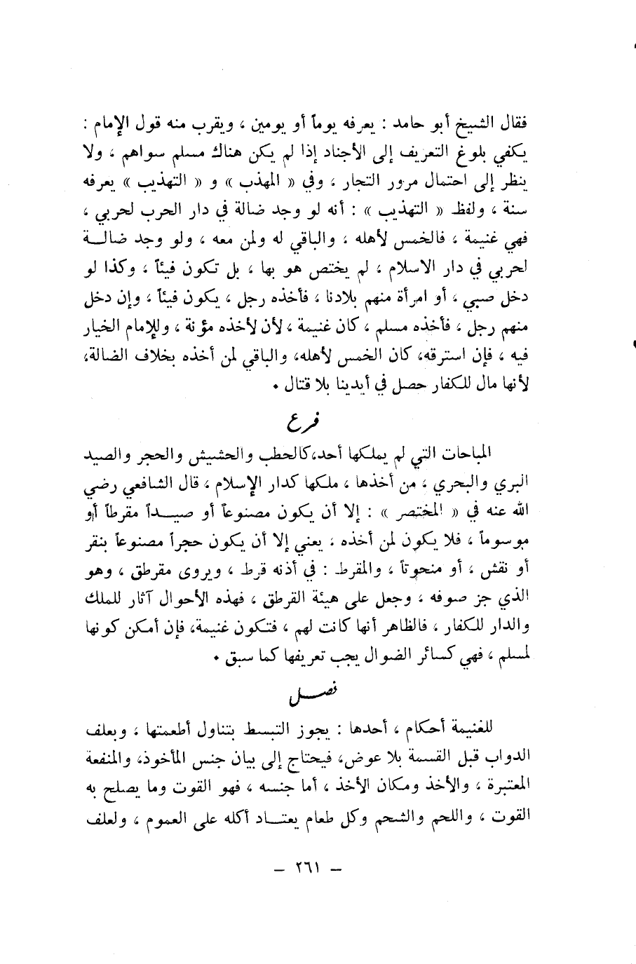 فَقَالَ الشَّيْخُ أَبُو حَامِدٍ: يُعَرِّفُهُ يَوْمًا أَوْ يَوْمَيْنِ، وَيَقْرُبُ مِنْهُ قَوْلُ الْإِمَامِ: يَكْفِي بُلُوغُ التَّعْرِيفِ إِلَى الْأَجْنَادِ إِذَا لَمْ يَكُنْ هُنَاكَ مُسْلِمٌ سِوَاهُمْ، وَلَا يُنْظَرُ إِلَى احْتِمَالِ مُرُورِ التُّجَّارِ، وَفِي الْمُهَذَّبِ وَالتَّهْذِيبِ يُعَرِّفُهُ سَنَةً، وَلَفْظُ التَّهْذِيبِ: أَنَّهُ لَوْ وَجَدَ ضَالَّةً فِي دَارِ الْحَرْبِ لِحَرْبِيٍّ، فَهِيَ غَنِيمَةٌ، فَالْخُمُسُ لِأَهْلِهِ، وَالْبَاقِي لَهُ وَلِمَنْ مَعَهُ، وَلَوْ وَجَدَ ضَالَّةً لِحَرْبِيٍّ فِي دَارِ الْإِسْلَامِ، لَمْ يَخْتَصَّ هُوَ بِهَا، بَلْ تَكُونُ فَيْئًا، وَكَذَا لَوْ دَخَلَ صَبِيٌّ، أَوِ امْرَأَةٌ مِنْهُمْ بِلَادَنَا، فَأَخَذَهُ رَجُلٌ، يَكُونُ فَيْئًا، وَإِنْ دَخَلَ مِنْهُمْ رَجُلٌ، فَأَخَذَهُ مُسْلِمٌ، كَانَ غَنِيمَةً، لِأَنَّ لِأَخْذِهِ مُؤْنَةً، وَلِلْإِمَامِ الْخِيَارُ فِيهِ، فَإِنِ اسْتَرَقَّهُ، كَانَ الْخُمُسُ لِأَهْلِهِ، وَالْبَاقِي لِمَنْ أَخَذَهُ بِخِلَافِ الضَّالَّةِ، لِأَنَّهَا مَالٌ لِلْكُفَّارِ حَصَلَ فِي أَيْدِينَا بِلَا قِتَالٍ.