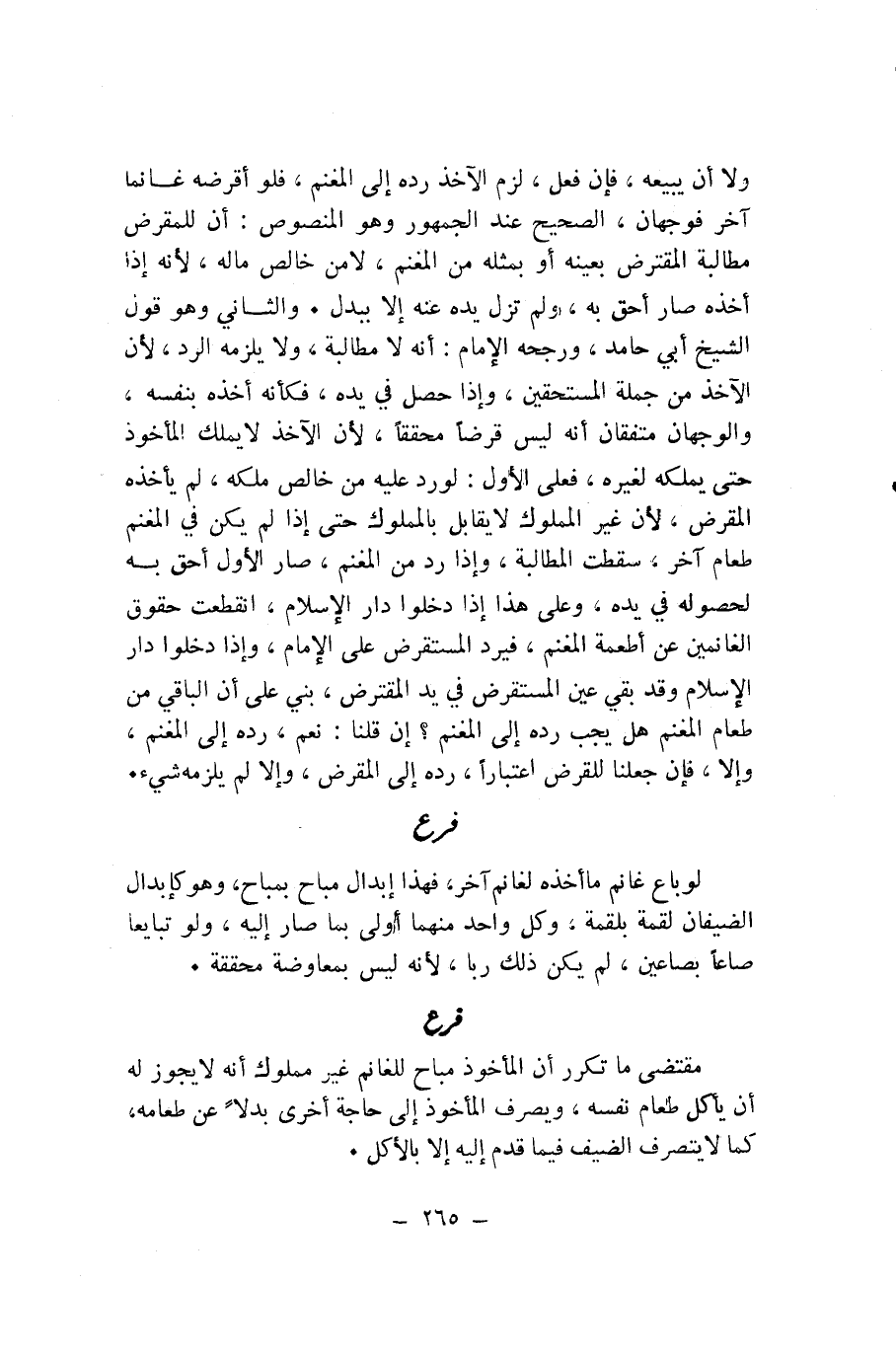 وَلَا أَنْ يَبِيعَهُ، فَإِنْ فَعَلَ، لَزِمَ الْآخِذَ رَدُّهُ إِلَى الْمَغْنَمِ، فَلَوْ أَقْرَضَهُ غَانِمًا آخَرَ فَوَجْهَانِ، الصَّحِيحُ عِنْدَ الْجُمْهُورِ وَهُوَ الْمَنْصُوصُ: أَنَّ لِلْمُقْرِضِ مُطَالَبَةَ الْمُقْتَرِضِ بِعَيْنِهِ أَوْ بِمِثْلِهِ مِنَ الْمَغْنَمِ، لَا مِنْ خَالِصِ مَالِهِ، لِأَنَّهُ إِذَا أَخَذَهُ صَارَ أَحَقَّ بِهِ، وَلَمْ تَزُلْ يَدُهُ عَنْهُ إِلَّا بِبَدَلٍ. وَالثَّانِي وَهُوَ قَوْلُ الشَّيْخِ أَبِي حَامِدٍ، وَرَجَّحَهُ الْإِمَامُ: أَنَّهُ لَا مُطَالَبَةَ، وَلَا يَلْزَمُهُ الرَّدُّ، لِأَنَّ الْآخِذَ مِنْ جُمْلَةِ الْمُسْتَحِقِّينَ، وَإِذَا حَصَلَ فِي يَدِهِ، فَكَأَنَّهُ أَخَذَهُ بِنَفْسِهِ، وَالْوَجْهَانِ مُتَّفِقَانِ أَنَّهُ لَيْسَ قَرْضًا مُحَقَّقًا، لِأَنَّ الْآخِذَ لَا يَمْلِكُ الْمَأْخُوذَ حَتَّى يَمْلِكُهُ لِغَيْرِهِ، فَعَلَى الْأَوَّلِ: لَوْ رَدَّ عَلَيْهِ مِنْ خَالِصِ مِلْكِهِ، لَمْ يَأْخُذْهُ الْمُقْرِضُ، لَأَنَّ غَيْرَ الْمَمْلُوكِ لَا يُقَابَلُ بِالْمَمْلُوكِ حَتَّى إِذَا لَمْ يَكُنْ فِي الْمَغْنَمِ طَعَامٌ آخَرُ، سَقَطَتِ الْمُطَالَبَةُ، وَإِذَا رُدَّ مِنَ الْمَغْنَمِ، الْأَوَّلُ أَحَقُّ بِهِ لِحُصُولِهِ فِي يَدِهِ، وَعَلَى هَذَا إِذَا دَخَلُوا دَارَ الْإِسْلَامِ، انْقَطَعَتْ حُقُوقُ الْغَانِمِينَ عَنْ أَطْعِمَةِ الْمَغْنَمِ، فَيُرَدُّ الْمُسْتَقْرَضُ عَلَى الْإِمَامِ، وَإِذَا دَخَلُوا دَارَ الْإِسْلَامِ وَقَدْ بَقِيَ عَيْنُ الْمُسْتَقْرَضِ فِي يَدِ الْمُقْتَرِضِ، بُنِيَ عَلَى أَنَّ الْبَاقِيَ مِنْ طَعَامِ الْمَغْنَمِ هَلْ يَجِبُ رَدُّهُ إِلَى الْمَغْنَمِ؟ إِنْ قُلْنَا: نَعَمْ، رَدَّهُ إِلَى الْمَغْنَمِ، وَإِلَّا، فَإِنْ جَعَلْنَا لِلْقَرْضِ اعْتِبَارًا، رَدَّهُ إِلَى الْمُقْرِضِ، وَإِلَّا لَمْ يَلْزَمْهُ شَيْءٌ.