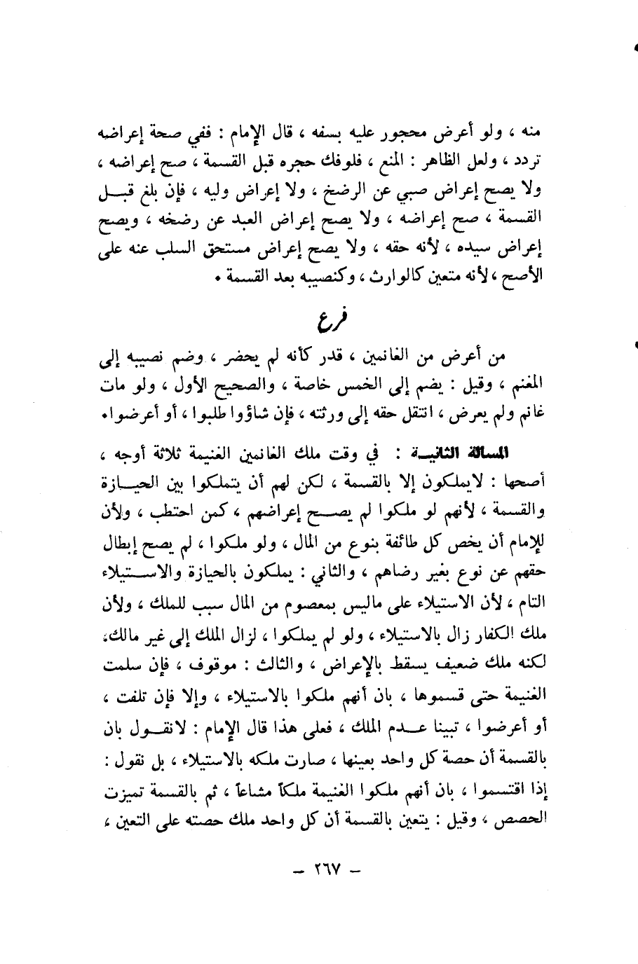 مِنْهُ، وَلَوْ أَعْرَضَ مَحْجُورٌ عَلَيْهِ بِسَفَهٍ، قَالَ الْإِمَامُ: فَفِي صِحَّةِ إِعْرَاضِهِ تَرَدُّدٌ، وَلَعَلَّ الظَّاهِرَ: الْمَنْعُ، فَلَوْ فُكَّ حَجْرُهُ قَبْلَ الْقِسْمَةِ، صَحَّ إِعْرَاضُهُ، وَلَا يَصِحُّ إِعْرَاضُ صَبِيٍّ عَنِ الرَّضْخِ، وَلَا إِعْرَاضُ وَلِيِّهِ، فَإِنْ بَلَغَ قَبْلَ الْقِسْمَةِ، صَحَّ إِعْرَاضُهُ، وَلَا يَصِحُّ إِعْرَاضُ الْعَبْدِ عَنْ رَضْخِهِ، وَيَصِحُّ إِعْرَاضُ سَيِّدِهِ، لِأَنَّهُ حَقُّهُ، وَلَا يَصِحُّ إِعْرَاضُ مُسْتَحِقِّ السَّلَبِ عَنْهُ عَلَى الْأَصَحِّ، لِأَنَّهُ مُتَعَيَّنٌ كَالْوَارِثِ، وَكَنَصِيبِهِ بَعْدَ الْقِسْمَةِ.