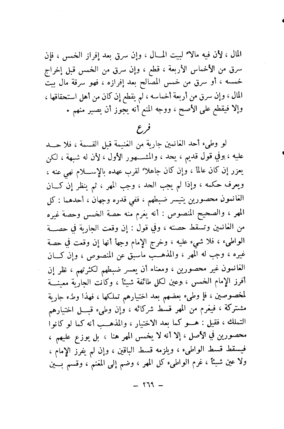 لَوْ وَطِئَ أَحَدُ الْغَانِمِينَ جَارِيَةً مِنَ الْغَنِيمَةِ قَبْلَ الْقِسْمَةِ، فَلَا حَدَّ عَلَيْهِ، وَفِي قَوْلٍ قَدِيمٍ، يُحَدُّ، وَالْمَشْهُورُ الْأَوَّلُ، لِأَنَّ لَهُ شُبْهَةً، لَكِنْ يُعَزَّرُ إِنْ كَانَ عَالِمًا، وَإِنْ كَانَ جَاهِلًا لِقُرْبِ عَهْدِهِ بِالْإِسْلَامِ نُهِيَ عَنْهُ، وَيُعَرَّفُ حُكْمُهُ، وَإِذَا لَمْ يَجِبِ الْحَدُّ، وَجَبَ الْمَهْرُ، ثُمَّ يُنْظَرُ إِنْ كَانَ الْغَانِمُونُ مَحْصُورِينَ يَتَيَسَّرُ ضَبْطُهُمْ، فَفِي قَدْرِهِ وَجْهَانِ، أَحَدُهُمَا: كُلُّ الْمَهْرِ، وَالصَّحِيحُ الْمَنْصُوصُ: أَنَّهُ يَغْرَمُ مِنْهُ حِصَّةَ الْخُمُسِ وَحِصَّةَ غَيْرِهِ مِنَ الْغَانِمِينَ وَتَسْقُطُ حِصَّتُهُ، وَفِي قَوْلٍ: إِنْ وَقَعَتِ الْجَارِيَةُ فِي حِصَّةِ الْوَاطِئِ، فَلَا شَيْءَ عَلَيْهِ، وَخَرَّجَ الْإِمَامُ وَجْهًا أَنَّهَا إِنْ وَقَعَتْ فِي حِصَّةِ غَيْرِهِ، وَجَبَ لَهُ الْمَهْرُ، وَالْمَذْهَبُ مَا سَبَقَ عَنِ الْمَنْصُوصِ، وَإِنْ كَانَ الْغَانِمُونَ غَيْرَ مَحْصُورِينَ، وَمَعْنَاهُ أَنْ يَعْسُرَ ضَبْطُهُمْ لِكَثْرَتِهِمْ، نُظِرَ إِنْ أَفْرَزَ الْإِمَامُ الْخُمُسَ، وَعَيَّنَ لِكُلِّ طَائِفَةٍ شَيْئًا، وَكَانَتِ الْجَارِيَةُ مُعَيَّنَةً لِمَخْصُوصِينَ، فَإِنْ وَطِئَ بَعْضُهُمْ بَعْدَ اخْتِيَارِهِمْ تَمَلُّكِهَا، فَهَذَا وَطْءُ جَارِيَةٍ مُشْتَرَكَةٍ، فَيَغْرَمُ مِنَ الْمَهْرِ قِسْطَ شُرَكَائِهِ، وَإِنْ وَطِئَ قَبْلَ اخْتِيَارِهِمُ التَّمَلُّكَ، فَقِيلَ: هُوَ كَمَا بَعْدَ الِاخْتِيَارِ، وَالْمَذْهَبُ أَنَّهُ كَمَا لَوْ كَانُوا مَحْصُورِينَ فِي الْأَصْلِ، إِلَّا أَنَّهُ لَا يُخَمَّسُ الْمَهْرُ هُنَا، بَلْ يُوَزَّعُ عَلَيْهِمْ، فَيَسْقُطُ قِسْطُ الْوَاطِئِ، وَيَلْزَمُهُ قِسْطُ الْبَاقِينَ، وَإِنْ لَمْ يَفْرِزِ الْإِمَامُ، وَلَا عَيَّنَ شَيْئًا، غَرِمَ الْوَاطِئُ كُلَّ الْمَهْرِ، وَضُمَّ إِلَى الْمَغْنَمِ، وَقُسِّمَ بَيْنَ