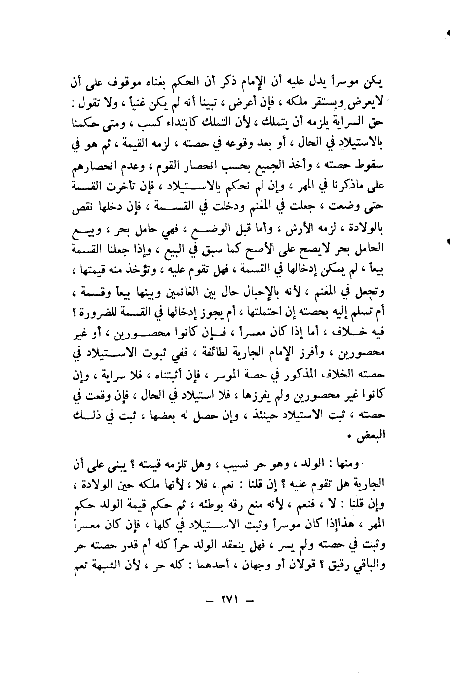 يَكُنْ مُوسِرًا يَدُلُّ عَلَيْهِ أَنَّ الْإِمَامَ ذَكَرَ أَنَّ الْحُكْمَ بِغِنَاهُ مَوْقُوفٌ عَلَى أَنْ لَا يَعْرِضَ وَيَسْتَقِرَّ مِلْكُهُ، فَإِنْ أَعْرَضَ، تَبَيَّنَّا أَنَّهُ لَمْ يَكُنْ غَنِيًّا، وَلَا تَقُولَ: حَقُّ السِّرَايَةِ يَلْزَمُهُ أَنْ يَتَمَلَّكَ، لِأَنَّ التَّمَلُّكَ كَابْتِدَاءِ كَسْبٍ، وَمَتَى حَكَمْنَا بِالِاسْتِيلَادِ فِي الْحَالِ، أَوْ بَعْدَ وُقُوعِهِ فِي حِصَّتِهِ، لَزِمَهُ الْقِيمَةُ، ثُمَّ هُوَ فِي سُقُوطِ حِصَّتِهِ، وَأَخْذِ الْجَمِيعِ بِحَسَبِ انْحِصَارِ الْقَوْمِ، وَعَدَمِ انْحِصَارِهِمْ عَلَى مَا ذَكَرْنَا فِي الْمَهْرِ، وَإِنْ لَمْ نَحْكُمْ بِالِاسْتِيلَادِ، فَإِنْ تَأَخَّرَتِ الْقِسْمَةُ حَتَّى وَضَعَتْ، جُعِلَتْ فِي الْمَغْنَمِ وَدَخَلَتْ فِي الْقِسْمَةِ فَإِنْ دَخَلَهَا نَقْصٌ بِالْوِلَادَةِ لَزِمَهُ الْأَرْشُ، وَأَمَّا قَبْلَ الْوَضْعِ، فَهِيَ حَامِلٌ بِحُرٍّ وَبَيْعُ الْحَامِلِ بِحُرٍّ لَا يَصِحُّ عَلَى الْأَصَحِّ كَمَا سَبَقَ فِي الْبَيْعِ، وَإِذَا جَعَلْنَا الْقِسْمَةَ بَيْعًا، لَمْ يَكُنْ إِدْخَالُهَا فِي الْقِسْمَةِ فَهَلْ تُقَوَّمُ عَلَيْهِ وَتُؤْخَذُ مِنْهُ قِيمَتُهَا وَتُجْعَلُ فِي الْمَغْنَمِ لِأَنَّهُ بِالْإِحْبَالِ حَالَ بَيْنَ الْغَانِمِينَ وَبَيْنَهَا بَيْعًا وَقِسْمَةً أَمْ تُسَلَّمُ إِلَيْهِ بِحِصَّتِهِ إِنِ احْتَمَلَتْهَا أَمْ يَجُوزُ إِدْخَالُهَا فِي الْقِسْمَةِ لِلضَّرُورَةِ؟ فِيهِ خِلَافٌ، أَمَّا إِذَا كَانَ مُعْسِرًا، فَإِنْ كَانُوا مَحْصُورِينَ أَوْ غَيْرَ مَحْصُورِينَ وَأَفْرَزَ الْإِمَامُ الْجَارِيَةَ لِطَائِفَةٍ فَفِي ثُبُوتِ الِاسْتِيلَادِ فِي حِصَّتِهِ الْخِلَافُ الْمَذْكُورُ فِي حِصَّةِ الْمُوسِرِ فَإِنْ أَثْبَتْنَاهُ فَلَا سِرَايَةَ وَإِنْ كَانُوا غَيْرَ مَحْصُورِينَ وَلَمْ يُفْرِزْهَا فَلَا اسْتِيلَادَ فِي الْحَالِ فَإِنْ وَقَعَتْ فِي حِصَّتِهِ، ثَبَتَ الِاسْتِيلَادُ حِينَئِذٍ، وَإِنْ حَصَلَ لَهُ بَعْضُهَا، ثَبَتَ فِي ذَلِكَ الْبَعْضِ.