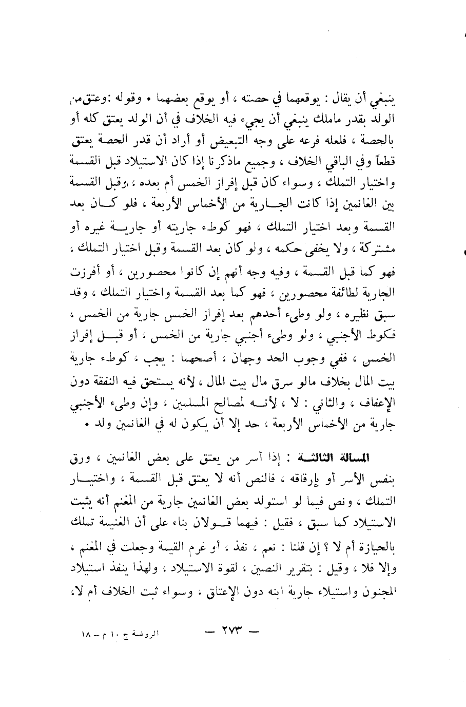 يَنْبَغِي أَنْ يُقَالَ: يُوقِعُهُمَا فِي حِصَّتِهِ، أَوْ يُوقِعُ بَعْضَهُمَا. وَقَوْلُهُ: وَعَتَقَ مِنَ الْوَلَدِ بِقَدْرِ مَا مَلَكَ يَنْبَغِي أَنْ يَجِيءَ فِيهِ الْخِلَافُ فِي أَنَّ الْوَلَدَ يُعْتَقُ كُلَّهُ أَوْ بِالْحِصَّةِ، فَلَعَلَّهُ فَرَّعَهُ عَلَى وَجْهِ التَّبْعِيضِ أَوْ أَرَادَ أَنَّ قَدْرَ الْحِصَّةِ يُعْتَقُ قَطْعًا، وَفِي الْبَاقِي الْخِلَافُ، وَجَمِيعُ مَا ذَكَرْنَا إِذَا كَانَ الِاسْتِيلَادُ قَبْلَ الْقِسْمَةِ وَاخْتِيَارِ التَّمَلُّكِ، وَسَوَاءً كَانَ قَبْلَ إِفْرَازِ الْخُمُسِ أَمْ بَعْدَهُ، وَقَبْلَ الْقِسْمَةِ بَيْنَ الْغَانِمِينَ إِذَا كَانَتِ الْجَارِيَةُ مِنَ الْأَخْمَاسِ الْأَرْبَعَةِ، فَلَوْ كَانَ بَعْدَ الْقِسْمَةِ وَبَعْدَ اخْتِيَارِ التَّمَلُّكِ، فَهُوَ كَوَطْءِ جَارِيَتِهِ أَوْ جَارِيَةِ غَيْرِهِ أَوْ مُشْتَرَكَةٍ، وَلَا يَخْفَى حُكْمُهُ، وَلَوْ كَانَ بَعْدَ الْقِسْمَةِ وَقَبْلَ اخْتِيَارِ التَّمَلُّكِ، فَهُوَ كَمَا قَبْلَ الْقِسْمَةِ، وَفِيهِ وَجْهٌ أَنَّهُمْ إِنْ كَانُوا مَحْصُورِينَ، أَوْ أُفْرِزَتِ الْجَارِيَةُ لِطَائِفَةٍ مَحْصُورِينَ، فَهُوَ كَمَا بَعَدَ الْقِسْمَةِ وَاخْتِيَارِ التَّمَلُّكِ، وَقَدْ سَبَقَ نَظِيرُهُ، وَلَوْ وَطِئَ أَحَدُهُمْ بَعْدَ إِفْرَازِ الْخُمُسِ جَارِيَةً مِنَ الْخُمُسِ، فَكَوَطْءِ الْأَجْنَبِيِّ، وَلَوْ وَطِئَ أَجْنَبِيٌّ جَارِيَةً مِنَ الْخُمُسِ، أَوْ قَبْلَ إِفْرَازِ الْخُمُسِ، فَفِي وُجُوبِ الْحَدِّ وَجْهَانِ، أَصَحُّهُمَا: يَجِبُ، كَوَطْءِ جَارِيَةِ بَيْتِ الْمَالِ بِخِلَافِ مَا لَوْ سَرَقَ مَالَ بَيْتِ الْمَالِ، لِأَنَّهُ يَسْتَحِقُّ فِيهِ النَّفَقَةَ دُونَ الْإِعْفَافِ، وَالثَّانِي: لَا، لِأَنَّهُ لِمَصَالِحِ الْمُسْلِمِينَ، وَإِنْ وَطِئَ الْأَجْنَبِيُّ جَارِيَةً مِنَ الْأَخْمَاسِ الْأَرْبَعَةِ، حُدَّ إِلَّا أَنْ يَكُونَ لَهُ فِي الْغَانِمِينَ وَلَدٌ.