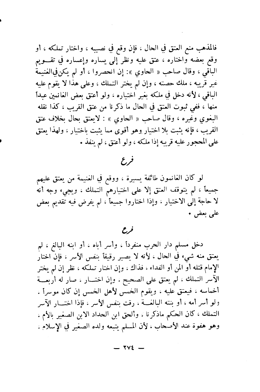 فَالْمَذْهَبُ مَنْعُ الْعِتْقِ فِي الْحَالِ، فَإِنْ وَقَعَ فِي نَصِيبِهِ، وَاخْتَارَ تَمَلُّكَهُ، أَوْ وَقَعَ بَعْضُهُ وَاخْتَارَهُ، عَتَقَ عَلَيْهِ وَنُظِرَ إِلَى يَسَارِهِ وَإِعْسَارِهِ فِي تَقْوِيمِ الْبَاقِي، وَقَالَ صَاحِبُ «الْحَاوِي» : إِنِ انْحَصَرُوا، أَوْ لَمْ يَكُنْ فِي الْغَنِيمَةِ غَيْرُ قَرِيبِهِ، مَلَكَ حِصَّتَهُ، وَإِنْ لَمْ يَخْتَرِ التَّمَلُّكَ، وَعَلَى هَذَا لَا يُقَوَّمُ عَلَيْهِ الْبَاقِي، لِأَنَّهُ دَخَلَ فِي مِلْكِهِ بِغَيْرِ اخْتِيَارِهِ، وَلَوْ أَعْتَقَ بَعْضُ الْغَانِمِينَ عَبْدًا مِنْهَا، فَفِي ثُبُوتِ الْعِتْقِ فِي الْحَالِ مَا ذَكَرْنَا مِنْ عِتْقِ الْقَرِيبِ، كَذَا نَقَلَهُ الْبَغَوِيُّ وَغَيْرُهُ، وَقَالَ صَاحِبُ الْحَاوِي: لَا يُعْتَقُ بِحَالٍ بِخِلَافِ عِتْقِ الْقَرِيبِ، فَإِنَّهُ يَثْبُتُ بِلَا اخْتِيَارٍ وَهُوَ أَقْوَى مِمَّا يَثْبُتُ بِاخْتِيَارٍ، وَلِهَذَا يُعْتَقُ عَلَى الْمَحْجُورِ عَلَيْهِ قَرِيبُهُ إِذَا مَلَكَهُ، وَلَوْ أَعْتَقَ، لَمْ يُنَفَّذْ.