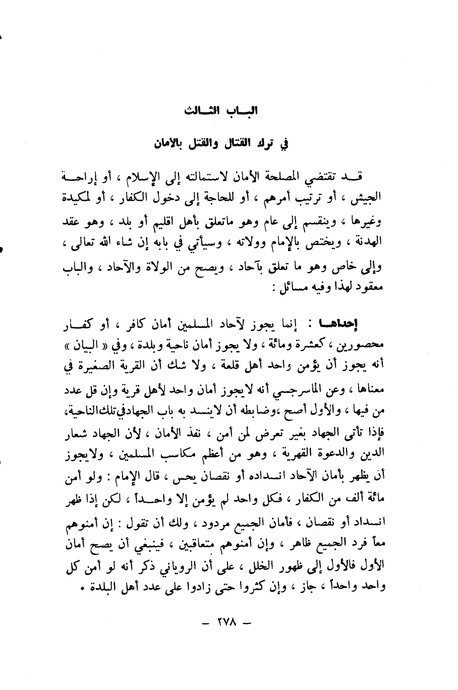 الْبَابُ الثَّالِثُ فِي تَرْكِ الْقِتَالِ وَالْقَتْلِ بِالْأَمَانِ