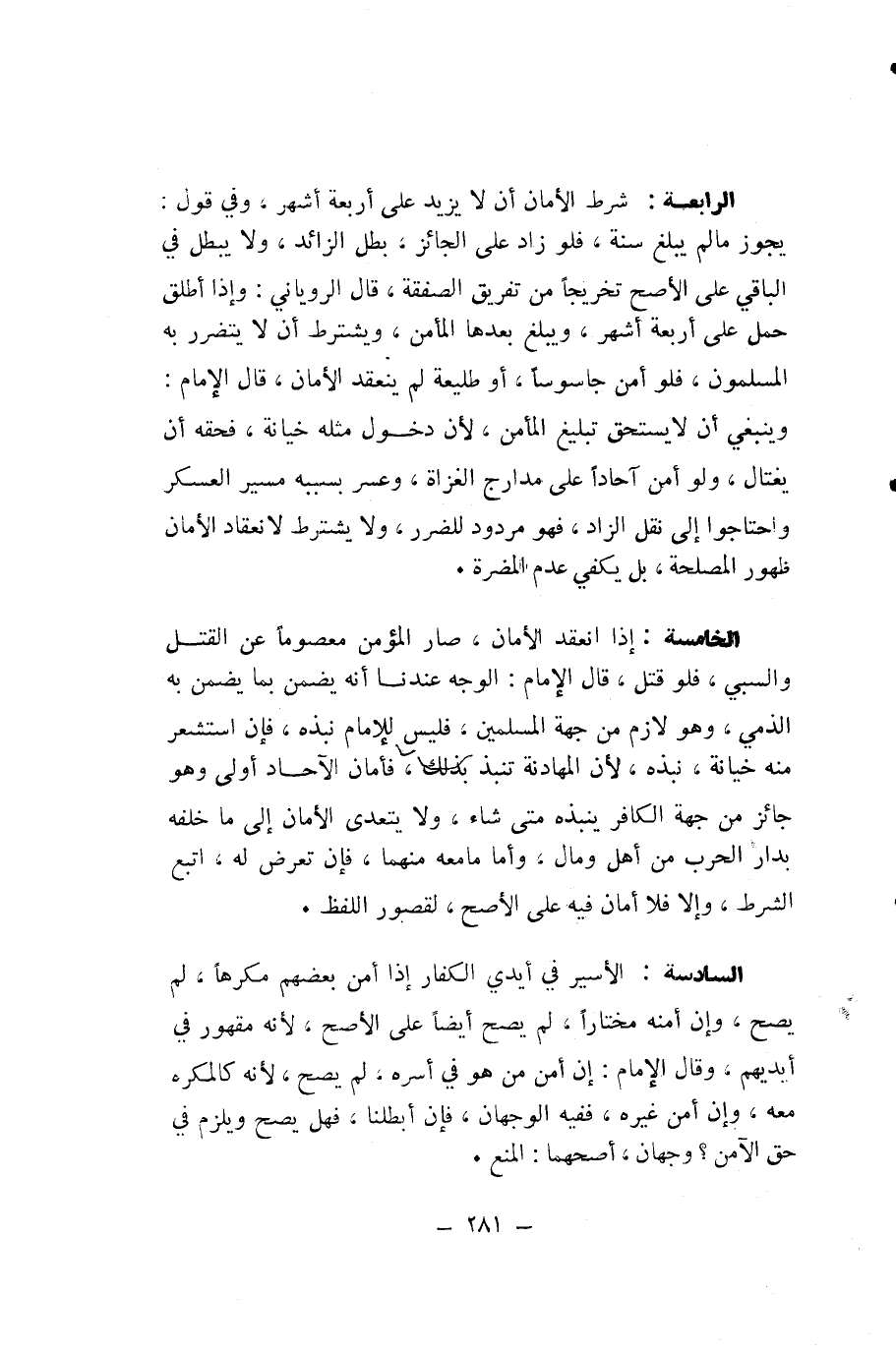 الرَّابِعَةُ: شَرْطُ الْأَمَانِ أَنْ لَا يَزِيدَ عَلَى أَرْبَعَةِ أَشْهُرٍ، وَفِي قَوْلٍ: يَجُوزُ مَا لَمْ يَبْلُغْ سَنَةً، فَلَوْ زَادَ عَلَى الْجَائِزِ، بَطَلَ الزَّائِدُ، وَلَا يَبْطُلُ فِي الْبَاقِي عَلَى الْأَصَحِّ تَخْرِيجًا مِنْ تَفْرِيقِ الصَّفْقَةِ، قَالَ الرُّويَانِيُّ: وَإِذَا أُطْلِقَ حُمِلَ عَلَى أَرْبَعَةِ أَشْهُرٍ، وَيَبْلُغُ بَعْدَهَا الْمَأْمَنَ، وَيُشْتَرَطُ أَنْ لَا يَتَضَرَّرَ بِهِ الْمُسْلِمُونَ، فَلَوْ أَمَّنَ جَاسُوسًا، أَوْ طَلِيعَةً لَمْ يَنْعَقِدِ الْأَمَانُ، قَالَ الْإِمَامُ: وَيَنْبَغِي أَنْ لَا يَسْتَحِقَّ تَبْلِيغَ الْمَأْمَنِ، لِأَنَّ دُخُولَ مِثْلِهِ خِيَانَةً، فَحَقُّهُ أَنْ يُغْتَالَ، وَلَوْ أَمَّنَ آحَادًا عَلَى مَدَارِجِ الْغُزَاةِ، وَعَسِرَ بِسَبَبِهِ مَسِيرُ الْعَسْكَرِ وَاحْتَاجُوا إِلَى نَقْلِ الزَّادِ، فَهُوَ مَرْدُودٌ لِلضَّرَرِ، وَلَا يُشْتَرَطُ لِانْعِقَادِ الْأَمَانِ ظُهُورُ الْمَصْلَحَةِ، بَلْ يَكْفِي عَدَمُ الْمُضِرَّةِ. الْخَامِسَةُ: إِذَا انْعَقَدَ الْأَمَانُ، صَارَ الْمُؤَمَّنُ مَعْصُومًا عَنِ الْقَتْلِ وَالسَّبْيِ، فَلَوْ قُتِلَ، قَالَ الْإِمَامُ: الْوَجْهُ عِنْدَنَا أَنَّهُ يُضْمَنُ بِمَا يُضْمَنُ بِهِ الذِّمِّيُّ، وَهُوَ لَازِمٌ مِنْ جِهَةِ الْمُسْلِمِينَ، فَلَيْسَ لِلْإِمَامِ نَبْذُهُ، فَإِنِ اسْتَشْعَرَ مِنْهُ خِيَانَةً، نَبَذَهَ، لِأَنَّ الْمُهَادَنَةَ تُنْبَذُ بِذَلِكَ، فَأَمَانُ الْآحَادِ أَوْلَى وَهُوَ جَائِزٌ مِنْ جِهَةِ الْكَافِرِ يَنْبِذُهُ مَتَى شَاءَ، وَلَا يَتَعَدَّى الْأَمَانُ إِلَى مَا خَلَّفَهُ بِدَارِ الْحَرْبِ مِنْ أَهْلٍ وَمَالٍ، وَأَمَّا مَا مَعَهُ مِنْهُمَا، فَإِنْ تَعَرَّضَ لَهُ، اتْبَعِ الشَّرْطَ، وَإِلَّا فَلَا أَمَانَ فِيهِ عَلَى الْأَصَحِّ، لِقُصُورِ اللَّفْظِ.