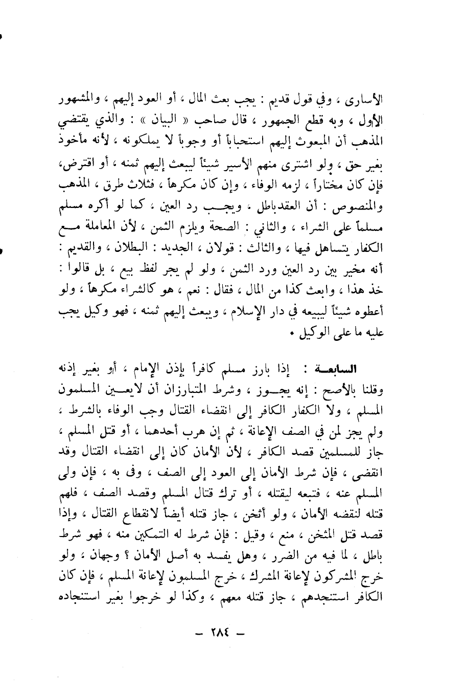 الْأَسَارَى، وَفِي قَوْلٍ قَدِيمٍ: يَجِبُ بَعْثُ الْمَالِ، أَوِ الْعَوْدُ إِلَيْهِمْ، وَالْمَشْهُورُ الْأَوَّلُ، وَبِهِ قَطَعَ الْجُمْهُورُ، قَالَ صَاحِبُ الْبَيَانِ: وَالَّذِي يَقْتَضِي الْمَذْهَبُ أَنَّ الْمَبْعُوثَ إِلَيْهِمِ اسْتِحْبَابًا أَوْ وُجُوبًا لَا يَمْلِكُونَهُ، لِأَنَّهُ مَأْخُوذٌ بِغَيْرِ حَقٍّ، وَلَوِ اشْتَرَى مِنْهُمُ الْأَسِيرُ شَيْئًا لِيَبْعَثَ إِلَيْهِمْ ثَمَنَهُ، أَوِ اقْتَرَضَ، فَإِنْ كَانَ مُخْتَارًا، لَزِمَهُ الْوَفَاءُ، وَإِنْ كَانَ مُكْرَهًا، فَثَلَاثُ طُرُقٍ، الْمُذَهَبُ وَالْمَنْصُوصُ: أَنَّ الْعَقْدَ بَاطِلٌ، وَيَجِبُ رَدُّ الْعَيْنِ، كَمَا لَوْ أَكْرَهَ مُسْلِمٌ مُسْلِمًا عَلَى الشِّرَاءِ، وَالثَّانِي: الصِّحَّةُ وَيَلْزَمُ الثَّمَنُ، لِأَنَّ الْمُعَامَلَةَ مَعَ الْكُفَّارِ يَتَسَاهَلُ فِيهَا، وَالثَّالِثُ: قَوْلَانِ، الْجَدِيدُ: الْبُطْلَانُ، وَالْقَدِيمُ: أَنَّهُ مُخَيَّرٌ بَيْنَ رَدِّ الْعَيْنِ وَرَدِّ الثَّمَنِ، وَلَوْ لَمْ يَجُرْ لَفْظُ بَيْعٍ، بَلْ قَالُوا: خُذْ هَذَا، وَابْعَثْ كَذَا مِنَ الْمَالِ، فَقَالَ: نَعَمْ، هُوَ كَالشِّرَاءِ مُكْرَهًا، وَلَوْ أَعْطَوْهُ شَيْئًا لِيَبِيعَهُ فِي دَارِ الْإِسْلَامِ، وَيَبْعَثَ إِلَيْهِمْ ثَمَنَهُ، فَهُوَ وَكِيلٌ يَجِبُ عَلَيْهِ مَا عَلَى الْوَكِيلِ.
