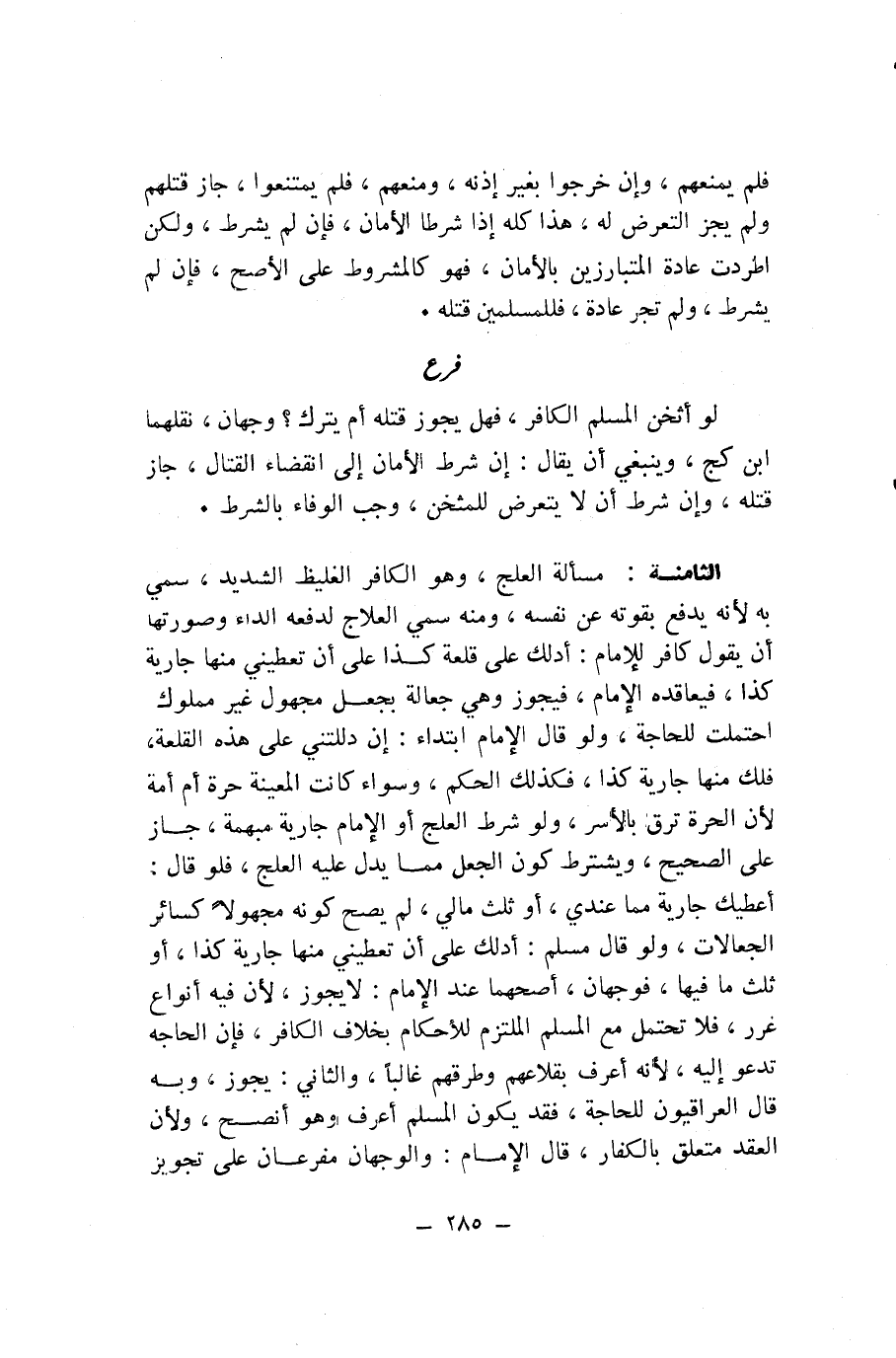 لَوْ أَثْخَنَ الْمُسْلِمُ الْكَافِرَ، فَهَلْ يَجُوزُ قَتْلُهُ أَمْ يُتْرَكُ؟ وَجْهَانِ، نَقَلَهُمَا ابْنُ كَجٍّ، وَيَنْبَغِي أَنْ يُقَالَ: إِنَّ شَرَطَ الْأَمَانَ إِلَى انْقِضَاءِ الْقِتَالِ، جَازَ قَتْلُهُ، وَإِنْ شَرَطَ أَنْ لَا يُتَعَرَّضَ لِلْمُثْخَنِ، وَجَبَ الْوَفَاءُ بِالشَّرْطِ. الثَّامِنَةُ: مَسْأَلَةُ الْعِلْجِ، وَهُوَ الْكَافِرُ الْغَلِيظُ الشَّدِيدُ، سُمِّيَ بِهِ لِأَنَّهُ يَدْفَعُ بِقُوَّتِهِ عَنْ نَفْسِهِ، وَمِنْهُ سُمِّي الْعِلَاجُ لِدَفْعِهِ الدَّاءَ وَصُورَتُهَا أَنْ يَقُولَ كَافِرٌ لِلْإِمَامِ: أَدُلُّكَ عَلَى قَلْعَةِ كَذَا عَلَى أَنْ تُعْطِيَنِي مِنْهَا جَارِيَةً كَذَا، فَيُعَاقِدُهُ الْإِمَامُ، فَيَجُوزُ وَهِيَ جَعَالَةٌ بِجَعْلٍ مَجْهُولٍ غَيْرِ مَمْلُوكٍ احْتُمِلَتْ لِلْحَاجَةِ، وَلَوْ قَالَ الْإِمَامُ ابْتِدَاءً: إِنْ دَلَلْتِنِي عَلَى هَذِهِ الْقَلْعَةِ، فَلَكَ مِنْهَا جَارِيَةٌ كَذَا، فَكَذَلِكَ الْحُكْمُ، وَسَوَاءً كَانَتِ الْمُعَيَّنَةُ حُرَّةً أَمْ أَمَةً لِأَنَّ الْحُرَّةَ تَرِقُّ بِالْأَسْرِ، وَلَوْ شَرَطَ الْعَلْجُ أَوِ الْإِمَامُ جَارِيَةً مُبْهَمَةً، جَازَ عَلَى الصَّحِيحِ، وَيُشْتَرَطُ كَوْنُ الْجَعْلِ مِمَّا يَدُلُّ عَلَيْهِ الْعِلْجُ، فَلَوْ قَالَ: أُعْطِيكَ جَارِيَةً مِمَّا عِنْدِي، أَوْ ثُلُثَ مَالِي، لَمْ يَصِحَّ كَوْنُهُ مَجْهُولًا كَسَائِرِ الْجَعَالَاتِ، وَلَوْ قَالَ مُسْلِمٌ: أَدُلُّكَ عَلَى أَنْ تُعْطِيَنِي مِنْهَا جَارِيَةً كَذَا، أَوْ ثُلُثَ مَا فِيهَا، فَوَجْهَانِ، أَصَحُّهُمَا عِنْدَ الْإِمَامِ: لَا يَجُوزُ، لِأَنَّ فِيهِ أَنْوَاع غَرَرٍ، فَلَا تُحْتَمَلُ مَعَ الْمُسْلِمِ الْمُلْتَزِمِ لِلْأَحْكَامِ بِخِلَافِ الْكَافِرِ، فَإِنَّ الْحَاجَةَ تَدْعُو إِلَيْهِ، لِأَنَّهُ أَعْرَفُ بِقِلَاعِهِمْ وَطُرُقِهِمْ غَالِبًا، وَالثَّانِي: يَجُوزُ، وَبِهِ قَالَ الْعِرَاقِيُّونَ لِلْحَاجَةِ، فَقَدْ يَكُونُ الْمُسْلِمُ أَعْرَفَ وَهُوَ أَنْصَحُ، وَلِأَنَّ الْعَقْدَ مُتَعَلِّقٌ بِالْكُفَّارِ، قَالَ الْإِمَامُ: وَالْوَجْهَانِ مُفَرَّعَانِ عَلَى تَجْوِيزِ