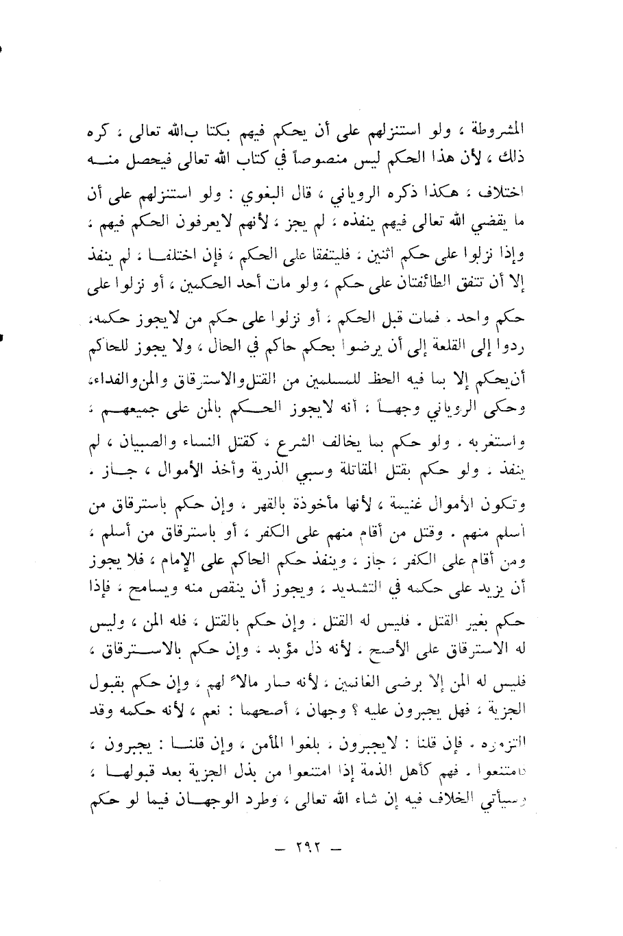 الْمَشْرُوطَةَ، وَلَوِ اسْتَنْزَلَهُمْ عَلَى أَنْ يَحْكُمَ فِيهِمْ بِكِتَابِ اللَّهِ تَعَالَى، كُرِهَ ذَلِكَ، لِأَنَّ هَذَا الْحُكْمَ لَيْسَ مَنْصُوصًا فِي كِتَابِ اللَّهِ تَعَالَى فَيَحْصُلُ مِنْهُ اخْتِلَافٌ، هَكَذَا ذَكَرَهُ الرُّويَانِيُّ، قَالَ الْبَغَوِيُّ: وَلَوِ اسْتَنْزَلَهُمْ عَلَى أَنَّ مَا يَقْضِي اللَّهُ تَعَالَى فِيهِمْ يُنَفِّذُهُ، لَمْ يَجُزْ، لِأَنَّهُمْ لَا يَعْرِفُونَ الْحُكْمَ فِيهِمْ وَإِذَا نَزَلُوا عَلَى حُكْمِ اثْنَيْنِ، فَلْيَتَّفِقَا عَلَى الْحُكْمِ، فَإِنِ اخْتَلَفَا، لَمْ يُنَفَّذْ إِلَّا أَنْ تَتَّفِقَ الطَّائِفَتَانِ عَلَى حُكْمٍ، وَلَوْ مَاتَ أَحَدُ الْحَكَمَيْنِ، أَوْ نَزَلُوا عَلَى حَكَمٍ وَاحِدٍ، فَمَاتَ قَبْلَ الْحُكْمِ، أَوْ نَزَلُوا عَلَى حُكْمِ مَنْ لَا يَجُوزُ حُكْمُهُ، رُدُّوا إِلَى الْقَلْعَةِ إِلَى أَنْ يَرْضَوْا بِحُكْمِ حَاكِمٍ فِي الْحَالِ، وَلَا يَجُوزُ لِلْحَاكِمِ أَنْ يَحْكُمَ إِلَّا بِمَا فِيهِ الْحَظُّ لِلْمُسْلِمِينَ مِنَ الْقَتْلِ وَالِاسْتِرْقَاقِ وَالْمَنِّ وَالْفِدَاءِ، وَحَكَى الرُّويَانِيُّ وَجْهًا، أَنَّهُ لَا يَجُوزُ الْحُكْمُ بِالْمَنِّ عَلَى جَمِيعِهِمْ، وَاسْتَغْرَبَهُ، وَلَوْ حَكَمَ بِمَا يُخَالِفُ الشَّرْعَ، كَقَتْلِ النِّسَاءِ وَالصِّبْيَانِ، لَمْ يُنَفَّذْ، وَلَوْ حَكَمَ بِقَتْلِ الْمُقَاتِلَةِ وَسَبْيِ الذُّرِّيَّةِ وَأَخْذِ الْأَمْوَالِ، جَازَ. وَتَكُونُ الْأَمْوَالُ غَنِيمَةً، لِأَنَّهَا مَأْخُوذَةٌ بِالْقَهْرِ، وَإِنْ حَكَمَ بِاسْتِرْقَاقِ مَنْ أَسْلَمَ مِنْهُمْ، وَقَتْلِ مَنْ أَقَامَ مِنْهُمْ عَلَى الْكُفْرِ، أَوْ بِاسْتِرْقَاقِ مَنْ أَسْلَمَ، وَمَنْ أَقَامَ عَلَى الْكُفْرِ، جَازَ، وَيُنَفَّذُ حُكْمُ الْحَاكِمِ عَلَى الْإِمَامِ، فَلَا يَجُوزُ أَنْ يَزِيدَ عَلَى حُكْمِهِ فِي التَّشْدِيدِ، وَيَجُوزُ أَنْ يُنْقِصَ مِنْهُ وَيُسَامِحَ، فَإِذَا حَكَمَ بِغَيْرِ الْقَتْلِ، فَلَيْسَ لَهُ الْقَتْلُ، وَإِنْ حَكَمَ بِالْقَتْلِ، فَلَهُ الْمَنُّ، وَلَيْسَ لَهُ الِاسْتِرْقَاقُ عَلَى الْأَصَحِّ، لِأَنَّهُ ذُلٌّ مُؤَبَّدٌ، وَإِنْ حَكَمَ بِالِاسْتِرْقَاقِ، فَلَيْسَ لَهُ الْمَنُّ إِلَّا بِرِضَى الْغَانِمِينَ، لِأَنَّهُ صَارَ مَالًا لَهُمْ، وَإِنْ حَكَمَ بِقَبُولِ الْجِزْيَةِ، فَهَلْ يُجْبَرُونَ عَلَيْهِ؟ وَجْهَانِ، أَصَحُّهُمَا: نَعَمْ، لِأَنَّهُ حُكْمُهُ وَقَدِ الْتَزَمُوهُ، فَإِنْ قُلْنَا: لَا يُجْبَرُونَ، بُلِّغُوا الْمَأْمَنَ، وَإِنْ قُلْنَا: يُجْبَرُونَ، فَامْتَنَعُوا، فَهُمْ كَأَهْلِ الذِّمَّةِ إِذَا امْتَنَعُوا مِنْ بَذْلِ الْجِزْيَةِ بَعْدَ قَبُولِهَا، وَسَيَأْتِي الْخِلَافُ فِيهِ إِنْ شَاءَ اللَّهُ تَعَالَى، وَطُرِدَ الْوَجْهَانِ فِيمَا لَوْ حَكَمَ