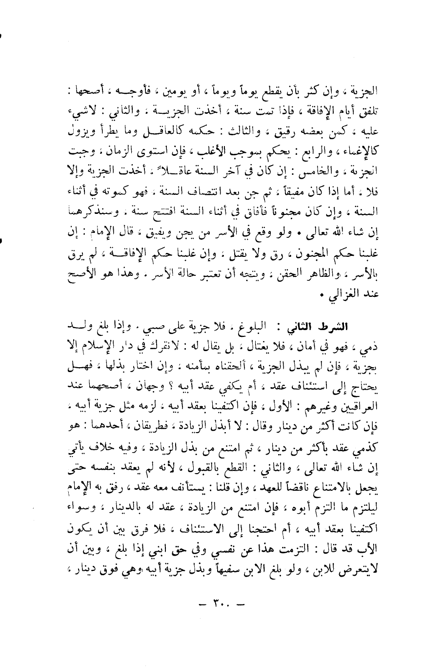 الشَّرْطُ الثَّانِي: الْبُلُوغُ، فَلَا جِزْيَةَ عَلَى صَبِيٍّ، وَإِذَا بَلَغَ وَلَدُ ذِمِّيٍّ، فَهُوَ فِي أَمَانٍ، فَلَا يُغْتَالُ، بَلْ يُقَالُ لَهُ: لَا نُقِرُّكَ فِي دَارِ الْإِسْلَامِ إِلَّا بِجِزْيَةٍ، فَإِنْ لَمْ يَبْذُلِ الْجِزْيَةَ، أَلْحَقْنَاهُ بِمَأْمَنِهِ، وَإِنِ اخْتَارَ بَذْلَهَا، فَهَلْ يَحْتَاجُ إِلَى اسْتِئْنَافِ عَقْدٍ، أَمْ يَكْفِي عَقْدُ أَبِيهِ؟ وَجْهَانِ، أَصَحُّهُمَا عِنْدَ الْعِرَاقِيِّينَ وَغَيْرِهِمْ: الْأَوَّلُ، فَإِنِ اكْتَفَيْنَا بِعَقْدِ أَبِيهِ، لَزِمَهُ مِثْلُ جِزْيَةِ أَبِيهِ، فَإِنْ كَانَتْ أَكْثَرَ مِنْ دِينَارٍ وَقَالَ: لَا أَبْذُلُ الزِّيَادَةَ، فَطَرِيقَانِ، أَحَدُهُمَا: هُوَ كَذِمِّيٍّ عَقَدَ بِأَكْثَرَ مِنْ دِينَارٍ، ثُمَّ امْتَنَعَ مِنْ بَذْلِ الزِّيَادَةِ، وَفِيهِ خِلَافٌ يَأْتِي - إِنْ شَاءَ اللَّهُ تَعَالَى - وَالثَّانِي: الْقَطْعُ بِالْقَبُولِ، لِأَنَّهُ لَمْ يَعْقِدْ بِنَفْسِهِ حَتَّى يُجْعَلَ بِالِامْتِنَاعِ نَاقِضًا لِلْعَهْدِ، وَإِنْ قُلْنَا: يُسْتَأْنَفُ مَعَهُ عَقْدٌ، رَفَقَ بِهِ الْإِمَامُ لِيَلْتَزِمَ مَا الْتَزَمَ أَبُوهُ، فَإِنِ امْتَنَعَ مِنَ الزِّيَادَةِ، عُقِدَ لَهُ بِالدِّينَارِ، وَسَوَاءً اكْتَفَيْنَا بِعَقْدِ أَبِيهِ، أَمِ احْتَجْنَا إِلَى الِاسْتِئْنَافِ، فَلَا فَرْقَ بَيْنَ أَنْ يَكُونَ الْأَبُ قَدْ قَالَ: الْتَزَمْتُ هَذَا عَنْ نَفْسِي وَفِي حَقِّ ابْنِي إِذَا بَلَغَ، وَبَيْنَ أَنْ لَا يَتَعَرَّضَ لِلِابْنِ، وَلَوْ بَلَغَ الِابْنُ سَفِيهًا وَبَذَلَ جِزْيَةَ أَبِيهِ وَهِيَ فَوْقَ دِينَارٍ