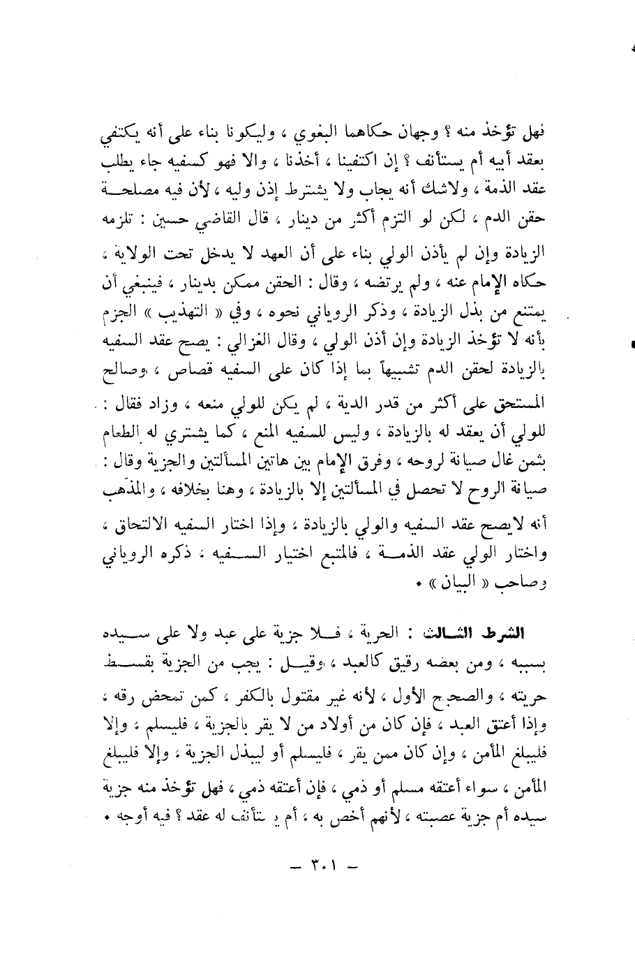 الشَّرْطُ الثَّالِثُ: الْحَرِيَّةُ، فَلَا جِزْيَةَ عَلَى عَبْدٍ وَلَا عَلَى سَيِّدِهِ بِسَبَبِهِ، وَمَنْ بَعْضُهُ رَقِيقٌ كَالْعَبْدِ، وَقِيلَ: يَجِبُ مِنَ الْجِزْيَةِ بِقِسْطِ حُرِّيَّتِهِ، وَالصَّحِيحُ الْأَوَّلُ، لِأَنَّهُ غَيْرُ مَقْتُولٍ بِالْكُفْرِ، كَمَنْ تَمَحَّضَ رِقُّهُ، وَإِذَا أُعْتِقَ الْعَبْدُ، فَإِنْ كَانَ مِنْ أَوْلَادِ مَنْ لَا يُقِرُّ بِالْجِزْيَةِ، فَلْيُسْلِمْ، وَإِلَّا فَلْيُبَلَّغِ الْمَأْمَنَ، وَإِنْ كَانَ مِمَّنْ يُقِرُّ، فَلْيُسْلِمْ أَوْ لِيَبْذُلِ الْجِزْيَةَ، وَإِلَّا فَلْيُبَلَّغِ الْمَأْمَنَ، سَوَاءً أَعْتَقَهُ مُسْلِمٌ أَوْ ذِمِّيٌّ، فَإِنْ أَعْتَقَهُ ذِمِّيٌّ، فَهَلْ تُؤْخَذُ مِنْهُ جِزْيَةُ سَيِّدِهِ أَمْ جِزْيَةُ عُصْبَتِهِ، لِأَنَّهُمْ أَخَصُّ بِهِ، أَمْ يُسْتَأْنَفُ لَهُ عَقْدٌ؟ فِيهِ أَوْجُهٌ.