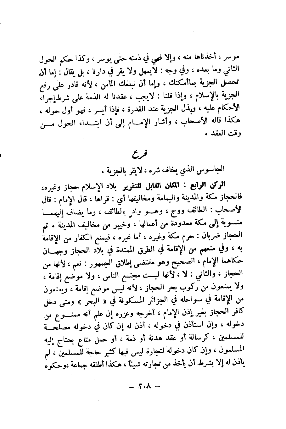 الرُّكْنُ الرَّابِعُ: الْمَكَانُ الْقَابِلُ لِلتَّقْرِيرِ بِلَادُ الْإِسْلَامِ حِجَازٌ وَغَيْرُهُ، فَالْحِجَازُ مَكَّةُ وَالْمَدِينَةُ وَالْيَمَامَةُ وَمَخَالِيفُهَا أَيْ: قُرَاهَا، قَالَ الْإِمَامُ: قَالَ الْأَصْحَابُ: الطَّائِفُ وَوَجٌّ، وَهُوَ وَادٍ بِالطَّائِفِ، وَمَا يُضَافُ إِلَيْهِمَا مَنْسُوبَةٌ إِلَى مَكَّةَ مَعْدُودَةٌ مِنْ أَعْمَالِهَا، وَخَيْبَرُ مِنْ مَخَالِيفِ الْمَدِينَةِ. ثُمَّ الْحِجَازُ ضَرْبَانِ: حَرُمُ مَكَّةَ وَغَيْرُهُ، أَمَّا غَيْرُهُ، فَيُمْنَعُ الْكُفَّارُ مِنَ الْإِقَامَةِ بِهِ، وَفِي مَنْعِهِمْ مِنَ الْإِقَامَةِ فِي الطُّرُقِ الْمُمْتَدَّةِ فِي بِلَادِ الْحِجَازِ وَجْهَانِ حَكَاهُمَا الْإِمَامُ، الصَّحِيحُ وَهُوَ مُقْتَضَى إِطْلَاقِ الْجُمْهُورِ: نَعَمْ، لِأَنَّهَا مِنَ الْحِجَازِ، وَالثَّانِي: لَا، لِأَنَّهَا لَيْسَتْ مُجْتَمَعَ النَّاسِ، وَلَا مَوْضِعَ إِقَامَةٍ، وَلَا يُمْنَعُونَ مِنْ رُكُوبِ بَحْرِ الْحِجَازِ، لِأَنَّهُ لَيْسَ مَوْضِعَ إِقَامَةٍ، وَيُمْنَعُونَ مِنَ الْإِقَامَةِ فِي سَوَاحِلِهِ فِي الْجَزَائِرِ الْمَسْكُونَةِ فِي الْبَحْرِ وَمَتَى دَخَلَ كَافِرٌ الْحِجَازَ بِغَيْرِ إِذْنِ الْإِمَامِ، أَخْرَجَهُ وَعَزَّرَهُ إِنْ عَلِمَ أَنَّهُ مَمْنُوعٌ مِنْ دُخُولِهِ، وَإِنِ اسْتَأْذَنَ فِي دُخُولِهِ، أُذِنَ لَهُ إِنْ كَانَ فِي دُخُولِهِ مَصْلَحَةٌ لِلْمُسْلِمِينَ، كَرِسَالَةٍ أَوْ عَقْدِ هُدْنَةٍ أَوْ ذِمَّةٍ، أَوْ حَمْلِ مَتَاعٍ يَحْتَاجُ إِلَيْهِ الْمُسْلِمُونَ، وَإِنْ كَانَ دُخُولُهُ لِتِجَارَةٍ لَيْسَ فِيهَا كَثِيرُ حَاجَةٍ لِلْمُسْلِمِينَ، لَمْ يَأْذَنْ لَهُ إِلَّا بِشَرْطِ أَنْ يَأْخُذَ مِنْ تِجَارَتِهِ شَيْئًا، هَكَذَا أَطْلَقَهُ جَمَاعَةٌ، وَحَكَوْهُ