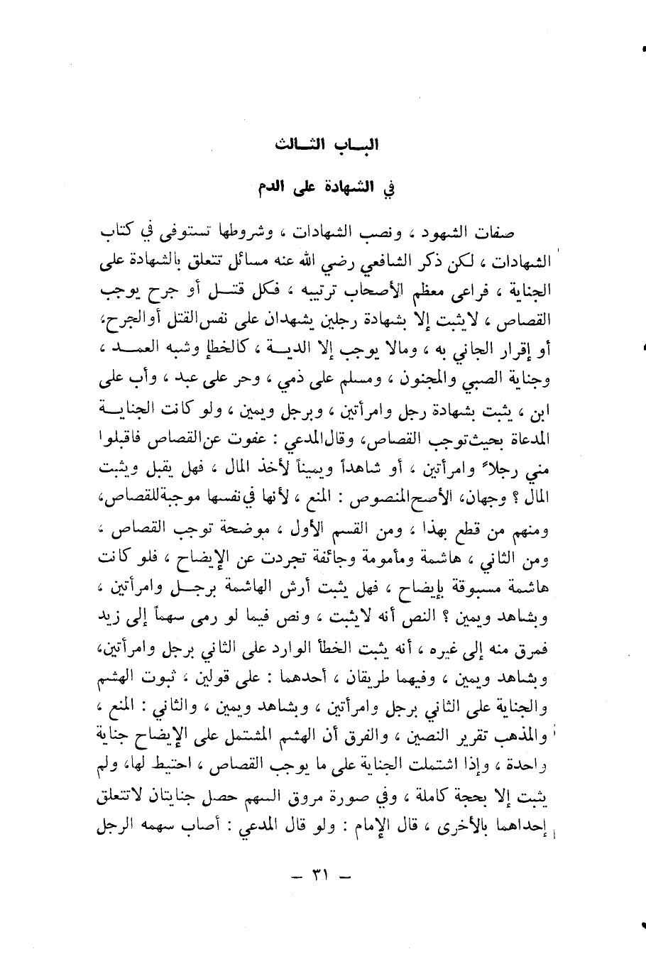 صِفَاتُ الشُّهُودِ، وَنَصْبُ الشَّهَادَاتِ، وَشُرُوطُهَا تُسْتَوْفَى فِي كِتَابِ الشَّهَادَاتِ، لَكِنْ ذَكَرَ الشَّافِعِيُّ رَضِيَ اللَّهُ عَنْهُ مَسَائِلَ تَتَعَلَّقُ بِالشَّهَادَةِ عَلَى الْجِنَايَةِ، فَرَاعَى مُعْظَمُ الْأَصْحَابِ تَرْتِيبَهُ، فَكُلُّ قَتْلٍ أَوْ جَرْحٍ يُوجِبُ الْقِصَاصَ، لَا يَثْبُتُ إِلَّا بِشَهَادَةِ رَجُلَيْنِ يَشْهَدَانِ عَلَى نَفْسِ الْقَتْلِ أَوِ الْجَرْحِ، أَوْ إِقْرَارِ الْجَانِي بِهِ، وَمَا لَا يُوجِبُ إِلَّا الدِّيَةَ، كَالْخَطَأِ وَشِبْهِ الْعَمْدِ، وَجِنَايَةِ الصَّبِيِّ وَالْمَجْنُونِ، وَمُسْلِمٍ عَلَى ذَمِّيٍ، وَحُرٍّ عَلَى عَبْدٍ، وَأَبٍ عَلَى ابْنٍ، يَثْبُتُ بِشَهَادَةِ رَجُلٍ وَامْرَأَتَيْنِ، وَبِرَجُلٍ وَيَمِينٍ، وَلَوْ كَانَتِ الْجِنَايَةُ الْمَدَّعَاةُ بِحَيْثُ تُوجِبُ الْقِصَاصَ، وَقَالَ الْمُدَّعِي: عَفَوْتُ عَنِ الْقِصَاصِ فَاقْبَلُوا مِنِّي رَجُلًا وَامْرَأَتَيْنِ، أَوْ شَاهِدًا وَيَمِينًا لِأَخْذِ الْمَالِ، فَهَلْ يُقْبَلُ وَيَثْبُتُ الْمَالُ؟ وَجْهَانِ، الْأَصَحُّ الْمَنْصُوصُ: الْمَنْعُ ; لِأَنَّهَا فِي نَفْسِهَا مُوجِبَةٌ لِلْقِصَاصِ، وَمِنْهُمْ مَنْ قَطَعَ بِهَذَا، وَمِنَ الْقِسْمِ الْأَوَّلِ، مُوضِحَةٌ تُوجِبُ الْقِصَاصَ، وَمِنَ الثَّانِي، هَاشِمَةٌ وَمَأْمُومَةٌ وَجَائِفَةٌ تَجَرَّدَتْ عَنِ الْإِيضَاحِ، فَلَوْ كَانَتْ هَاشِمَةٌ مَسْبُوقَةٌ بِإِيضَاحٍ، فَهَلْ يَثْبُتُ أَرْشُ الْهَاشِمَةِ بِرَجُلٍ وَامْرَأَتَيْنِ، وَبِشَاهِدٍ وَيَمِينٍ؟ النَّصُّ أَنَّهُ لَا يَثْبُتُ، وَنَصَّ فِيمَا لَوْ رَمَى سَهْمًا إِلَى زَيْدٍ، فَمَرَقَ مِنْهُ إِلَى غَيْرِهِ، أَنَّهُ يَثْبُتُ الْخَطَأُ الْوَارِدُ عَلَى الثَّانِي بِرَجُلٍ وَامْرَأَتَيْنِ، وَبِشَاهِدٍ وَيَمِينٍ.