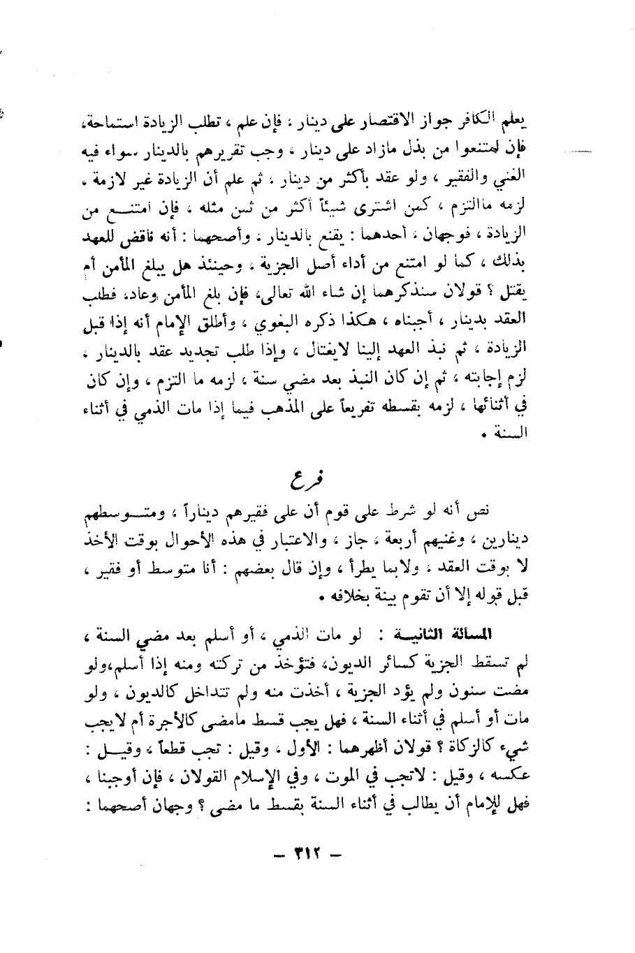 الْمَسْأَلَةُ الثَّانِيَةُ: لَوْ مَاتَ الذِّمِّيُّ، أَوْ أَسْلَمَ بَعْدَ مُضِيِّ السَّنَةِ، لَمْ تَسْقُطِ الْجِزْيَةُ كَسَائِرِ الدُّيُونِ، فَتُؤْخَذُ مِنْ تَرِكَتِهِ وَمِنْهُ إِذَا أَسْلَمَ، وَلَوْ مَضَتْ سُنُونَ وَلَمْ يُؤَدِّ الْجِزْيَةَ، أُخِذَتْ مِنْهُ وَلَمْ تَتَدَاخَلْ كَالدُّيُونِ، وَلَوْ مَاتَ أَوْ أَسْلَمَ فِي أَثْنَاءِ السَّنَةِ، فَهَلْ يَجِبُ قِسْطُ مَا مَضَى كَالْأُجْرَةِ أَمْ لَا يَجِبُ شَيْءٌ كَالزَّكَاةِ؟ قَوْلَانِ أَظْهَرُهُمَا: الْأَوَّلُ، وَقِيلَ: تَجِبُ قَطْعًا، وَقِيلَ: عَكْسُهُ، وَقِيلَ: لَا تَجِبُ فِي الْمَوْتِ، وَفِي الْإِسْلَامِ الْقَوْلَانِ، فَإِنْ أَوْجَبْنَا، فَهَلْ لِلْإِمَامِ أَنْ يُطَالِبَ فِي أَثْنَاءِ السَّنَةِ بِقِسْطِ مَا مَضَى؟ وَجْهَانِ أَصَحُّهُمَا: