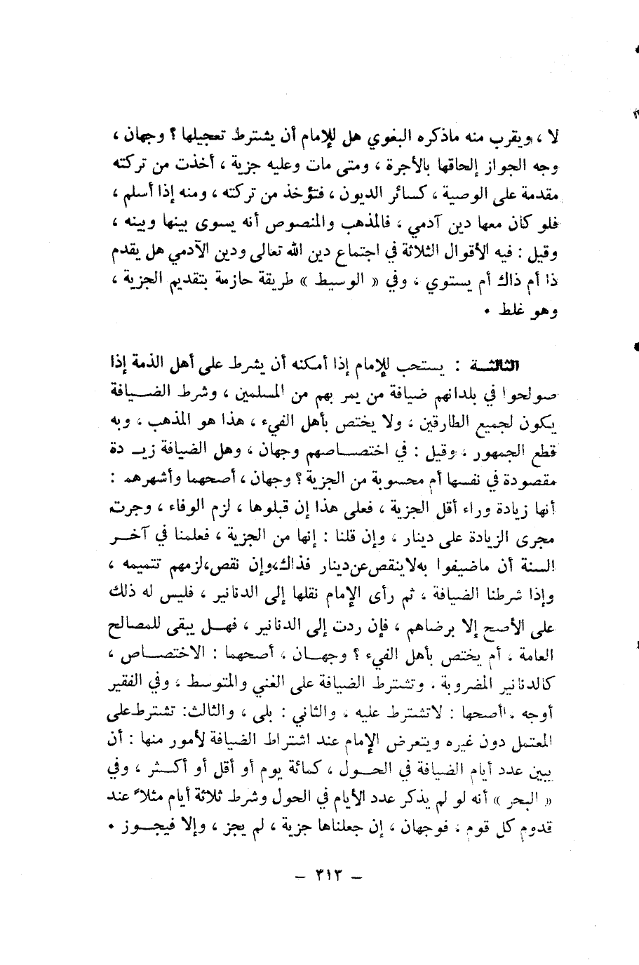 الثَّالِثَةُ: يُسْتَحَبُّ لِلْإِمَامِ إِذَا أَمْكَنَهُ أَنْ يَشْرُطَ عَلَى أَهْلِ الذِّمَّةِ إِذَا صُولِحُوا فِي بُلْدَانِهِمْ ضِيَافَةَ مَنْ يَمُرُّ بِهِمْ مِنَ الْمُسْلِمِينَ، وَشَرْطُ الضِّيَافَةِ يَكُونُ لِجَمِيعِ الطَّارِقِينَ، وَلَا يَخْتَصُّ بِأَهْلِ الْفَيْءِ، هَذَا هُوَ الْمَذْهَبُ، وَبِهِ قَطَعَ الْجُمْهُورُ، وَقِيلَ: فِي اخْتِصَاصِهِمْ وَجْهَانِ، وَهَلِ الضِّيَافَةُ زِيَادَةٌ مَقْصُودَةٌ فِي نَفْسِهَا أَمْ مَحْسُوبَةٌ مِنَ الْجِزْيَةِ؟ وَجْهَانِ أَصَحُّهُمَا وَأَشْهَرُهُمَا: أَنَّهَا زِيَادَةٌ وَرَاءَ أَقَلِّ الْجِزْيَةِ، فَعَلَى هَذَا إِنْ قَبِلُوهَا، لَزِمَ الْوَفَاءُ، وَجَرَتْ مَجْرَى الزِّيَادَةِ عَلَى دِينَارٍ، وَإِنْ قُلْنَا: إِنَّهَا مِنَ الْجِزْيَةِ فَعَلِمْنَا فِي آخِرِ السَّنَةِ أَنَّ مَا ضَيَّفُوا بِهِ لَا يَنْقُصُ عَنْ دِينَارٍ فَذَاكَ، وَإِنْ نَقَصَ، لَزِمَهُمْ تَتْمِيمُهُ، وَإِذَا شَرَطْنَا الضِّيَافَةَ، ثُمَّ رَأَى الْإِمَامُ نَقْلَهَا إِلَى الدَّنَانِيرِ، فَلَيْسَ لَهُ ذَلِكَ عَلَى الْأَصَحِّ إِلَّا بِرِضَاهُمْ، فَإِنْ رُدَّتْ إِلَى الدَّنَانِيرِ، فَهَلْ يَبْقَى لِلْمَصَالِحِ الْعَامَّةِ، أَمْ يَخْتَصُّ بِأَهْلِ الْفَيْءِ؟ وَجْهَانِ، أَصَحُّهُمَا: الِاخْتِصَاصُ، كَالدَّنَانِيرِ الْمَضْرُوبَةِ، وَتُشْتَرَطُ الضِّيَافَةُ عَلَى الْغَنِيِّ وَالْمُتَوَسِّطِ، وَفِي الْفَقِيرِ أَوْجُهٌ، أَصَحُّهَا: لَا تُشْتَرَطُ عَلَيْهِ، وَالثَّانِي: بَلَى، وَالثَّالِثُ: تُشْتَرَطُ عَلَى الْمُعْتَمِلِ دُونَ غَيْرِهِ وَيَتَعَرَّضُ الْإِمَامُ عِنْدَ اشْتِرَاطِ الضِّيَافَةِ لِأُمُورٍ مِنْهَا: أَنْ يُبَيِّنَ عَدَدَ أَيَّامِ الضِّيَافَةِ فِي الْحَوْلِ، كَمِائَةِ يَوْمٍ أَوْ أَقَلَّ أَوْ أَكْثَرَ، وَفِي «الْبَحْرِ» أَنَّهُ لَوْ لَمْ يَذْكُرْ عَدَدَ الْأَيَّامِ فِي الْحَوْلِ وَشَرَطَ ثَلَاثَةَ أَيَّامٍ مَثَلًا عِنْدَ قُدُومِ كُلِّ قَوْمٍ، فَوَجْهَانِ، إِنْ جَعَلْنَاهَا جِزْيَةً، لَمْ يَجُزْ، وَإِلَّا فَيَجُوزُ.