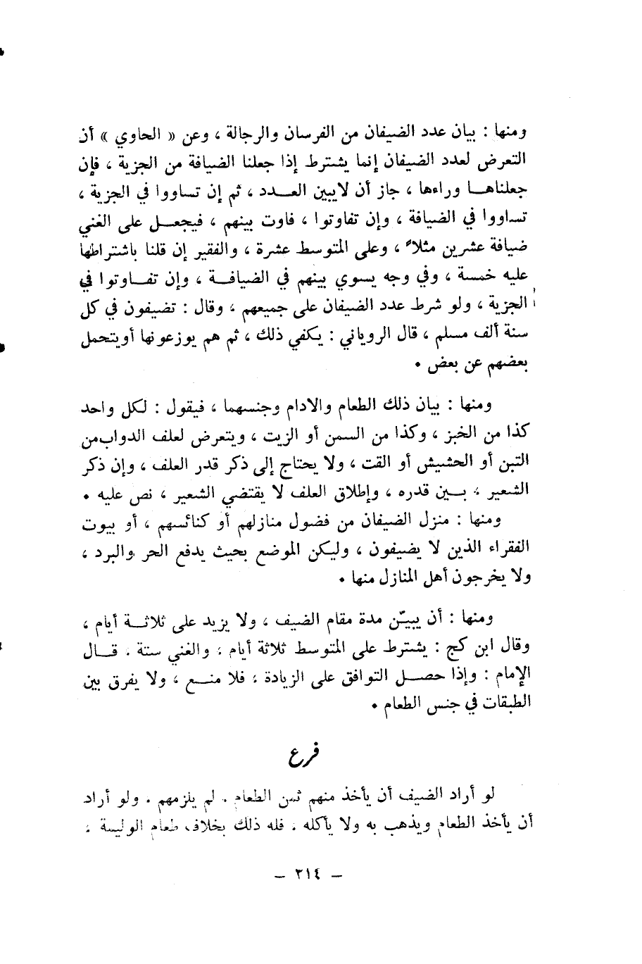 وَمِنْهَا: بَيَانُ عَدَدِ الضِّيفَانِ مِنَ الْفُرْسَانِ وَالرَّجَّالَةِ، وَعَنْ «الْحَاوِي» أَنَّ التَّعَرُّضَ لِعَدَدِ الضِّيفَانِ إِنَّمَا يُشْتَرَطُ إِذَا جَعَلَنَا الضِّيَافَةَ مِنَ الْجِزْيَةِ، فَإِنْ جَعَلْنَاهَا وَرَاءَهَا، جَازَ أَنْ لَا يُبَيِّنَ الْعَدَدَ، ثُمَّ إِنْ تَسَاوَوْا فِي الْجِزْيَةِ، تَسَاوَوْا فِي الضِّيَافَةِ، وَإِنْ تَفَاوَتُوا، فَاوَتَ بَيْنَهُمْ، فَيَجْعَلُ عَلَى الْغَنِيِّ ضِيَافَةَ عِشْرِينَ مَثَلًا، وَعَلَى الْمُتَوَسِّطِ عَشَرَةً، وَالْفَقِيرِ إِنْ قُلْنَا بِاشْتِرَاطِهَا عَلَيْهِ خَمْسَةً، وَفِي وَجْهٍ يُسَوِّي بَيْنَهُمْ فِي الضِّيَافَةِ، وَإِنْ تَفَاوَتُوا فِي الْجِزْيَةِ، وَلَوْ شَرَطَ عَدَدَ الضِّيفَانِ عَلَى جَمِيعِهِمْ، وَقَالَ: تُضَيِّفُونَ فِي كُلِّ سَنَةٍ أَلْفَ مُسْلِمٍ، قَالَ الرُّويَانِيُّ: يَكْفِي ذَلِكَ، ثُمَّ هُمْ يُوَزِّعُونَهَا أَوْ يَتَحَمَّلُ بَعْضُهُمْ عَنْ بَعْضٍ.