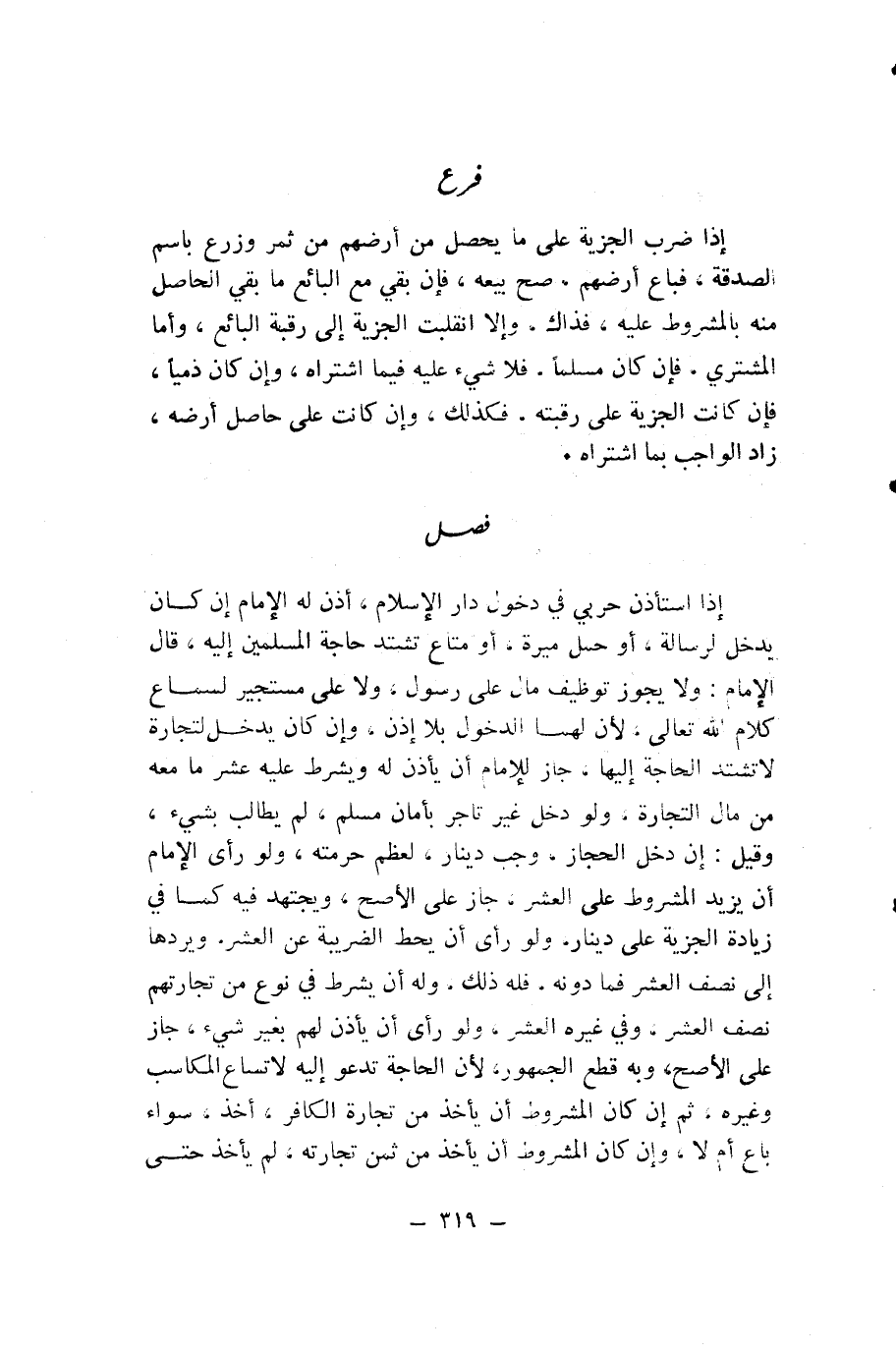 إِذَا اسْتَأْذَنَ حَرْبِيٌّ فِي دُخُولِ دَارِ الْإِسْلَامِ، أَذِنَ لَهُ الْإِمَامُ إِنْ كَانَ يَدْخُلُ لِرِسَالَةٍ، أَوْ حَمْلِ مِيرَةٍ، أَوْ مَتَاعٍ تَشْتَدُّ حَاجَةُ الْمُسْلِمِينَ إِلَيْهِ، قَالَ الْإِمَامُ: وَلَا يَجُوزُ تَوْظِيفُ مَالٍ عَلَى رَسُولٍ، وَلَا عَلَى مُسْتَجِيرٍ لِسَمَاعِ كَلَامِ اللَّهِ تَعَالَى، لِأَنَّ لَهُمَا الدُّخُولَ بِلَا إِذْنٍ، وَإِنْ كَانَ يَدْخُلُ لِتِجَارَةٍ لَا تَشْتَدُّ الْحَاجَةُ إِلَيْهَا، جَازَ لِلْإِمَامِ أَنْ يَأْذَنَ لَهُ وَيَشْرُطَ عَلَيْهِ عُشُرَ مَا مَعَهُ مِنْ مَالِ التِّجَارَةِ، وَلَوْ دَخَلَ غَيْرُ تَاجِرٍ بِأَمَانِ مُسْلِمٍ، لَمْ يُطَالَبْ بِشَيْءٍ، وَقِيلَ: إِنْ دَخَلَ الْحِجَازَ، وَجَبَ دِينَارٌ، لِعِظَمِ حُرْمَتِهِ، وَلَوْ رَأَى الْإِمَامُ أَنْ يَزِيدَ الْمَشْرُوطُ عَلَى الْعُشُرِ، جَازَ عَلَى الْأَصَحِّ، وَيَجْتَهِدُ فِيهِ كَمَا فِي زِيَادَةِ الْجِزْيَةِ عَلَى دِينَارٍ، وَلَوْ رَأَى أَنْ يَحُطَّ الضَّرِيبَةَ عَنِ الْعُشُرِ، وَيَرُدَّهَا إِلَى نِصْفِ الْعُشُرِ فَمَا دُونَهُ، فَلَهُ ذَلِكَ، وَلَهُ أَنْ يَشْرُطَ فِي نَوْعٍ مِنْ تِجَارَتِهِمْ نِصْفَ الْعُشُرِ، وَفِي غَيْرِهِ الْعُشُرَ، وَلَوْ رَأَى أَنْ يَأْذَنَ لَهُمْ بِغَيْرِ شَيْءٍ، جَازَ عَلَى الْأَصَحِّ، وَبِهِ قَطَعَ الْجُمْهُورُ، لِأَنَّ الْحَاجَةَ تَدْعُو إِلَيْهِ لِاتِّسَاعِ الْمَكَاسِبِ وَغَيْرِهِ، ثُمَّ إِنْ كَانَ الْمَشْرُوطُ أَنْ يَأْخُذَ مِنْ تِجَارَةِ الْكَافِرِ، أَخَذَ، سَوَاءً بَاعَ أَمْ لَا، وَإِنْ كَانَ الْمَشْرُوطُ أَنْ يَأْخُذَ مِنْ ثَمَنِ تِجَارَتِهِ، لَمْ يَأْخُذْ حَتَّى