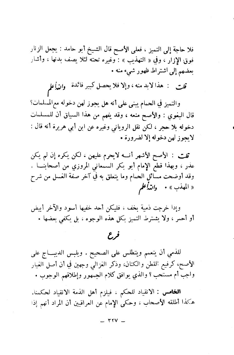 وَالتَّمَيُّزُ فِي الْحَمَّامِ يُبْنَى عَلَى أَنَّهُ هَلْ يَجُوزُ لَهُنَّ دُخُولُهُ مَعَ الْمُسَلَّمَاتِ؟ قَالَ الْبَغَوِيُّ: وَالْأَصَحُّ مَنْعُهُ، وَقَدْ يُفْهَمُ مِنْ هَذَا السِّيَاقِ أَنَّ لِلْمُسْلِمَاتِ دُخُولَهُ بِلَا حَجْرٍ، لَكِنْ نَقَلَ الرُّويَانِيُّ وَغَيْرُهُ عَنِ ابْنِ أَبِي هُرَيْرَةَ أَنَّهُ قَالَ: لَا يَجُوزُ لَهُنَّ دُخُولُهُ إِلَّا لِضَرُورَةٍ.