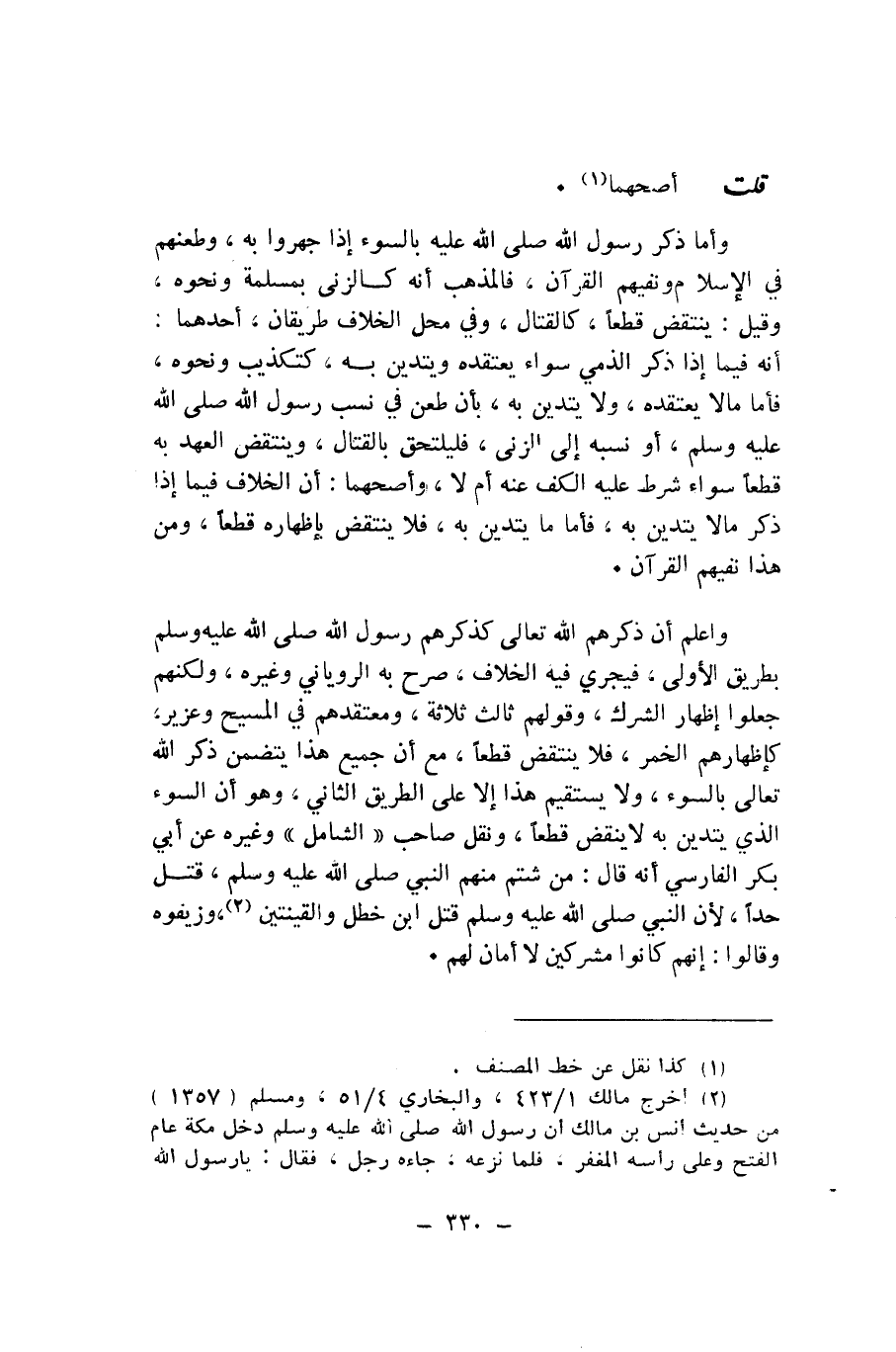 وَأَمَّا ذَكَرَ رَسُولُ اللَّهِ - صَلَّى اللَّهُ عَلَيْهِ وَسَلَّمَ - بِالسُّوءِ إِذَا جَهَرُوا بِهِ، وَطَعْنِهِمْ فِي الْإِسْلَامِ وَنَفْيِهِمُ الْقُرْآنَ، فَالْمَذْهَبُ أَنَّهُ كَالزِّنَى بِمُسْلِمَةٍ وَنَحْوِهِ، وَقِيلَ: يَنْتَقِضُ قَطْعًا، كَالْقِتَالِ، وَفِي مَحَلِّ الْخِلَافِ طَرِيقَانِ، أَحَدُهُمَا: أَنَّهُ فِيمَا إِذَا ذَكَرَ الذِّمِّيُّ سَوَاءً يَعْتَقِدُهُ وَيَتَدَيَّنُ بِهِ، كَتَكْذِيبٍ وَنَحْوِهِ، فَأَمَّا مَا لَا يَعْتَقِدُهُ، وَلَا يَتَدَيَّنُ بِهِ، بِأَنْ طَعَنَ فِي نَسَبِ رَسُولِ اللَّهِ - صَلَّى اللَّهُ عَلَيْهِ وَسَلَّمَ -، أَوْ نَسَبَهُ إِلَى الزِّنَى، فَلْيَلْتَحِقْ بِالْقِتَالِ، وَيَنْتَقِضُ الْعَهْدُ بِهِ قَطْعًا سَوَاءً شَرَطَ عَلَيْهِ الْكَفَّ عَنْهُ أَمْ لَا، وَأَصَحُّهُمَا: أَنَّ الْخِلَافَ فِيمَا إِذَا ذَكَرَ مَا لَا يَتَدَيَّنُ بِهِ، فَأَمَّا مَا يَتَدَيَّنُ بِهِ، فَلَا يَنْتَقِضُ بِإِظْهَارِهِ قَطْعًا، وَمِنْ هَذَا نَفْيُهُمُ الْقُرْآنَ.