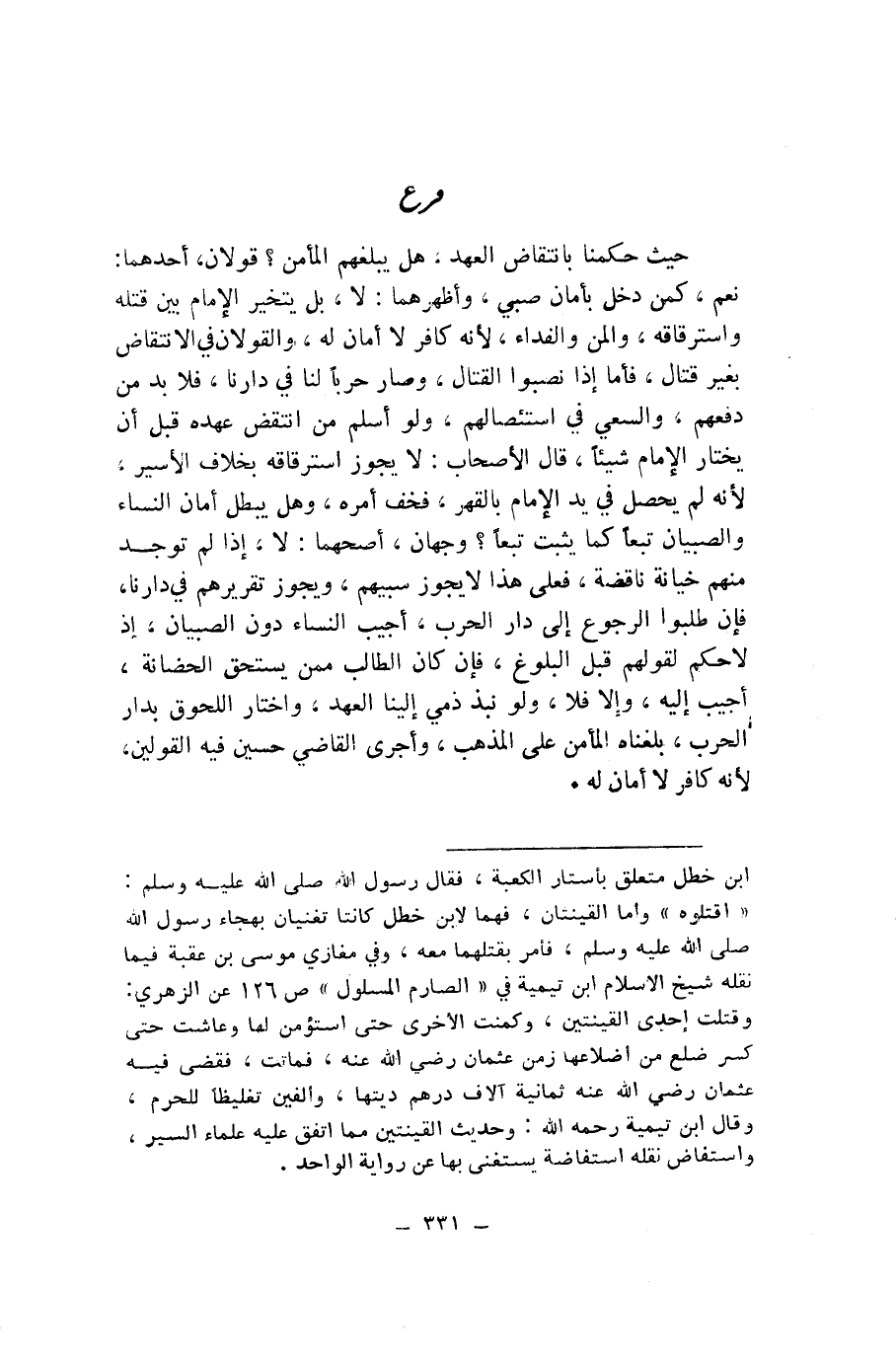 حَيْثُ حَكَمْنَا بِانْتِقَاضِ الْعَهْدِ، هَلْ يُبَلِّغُهُمُ الْمَأْمَنَ؟ قَوْلَانِ، أَحَدُهُمَا: نَعَمْ كَمَنْ دَخَلَ بِأَمَانِ صَبِيٍّ، وَأَظْهَرُهُمَا: لَا، بَلْ يَتَخَيَّرُ الْإِمَامُ بَيْنَ قَتْلِهِ وَاسْتِرْقَاقِهِ، وَالْمَنِّ وَالْفِدَاءِ، لِأَنَّهُ كَافِرٌ لَا أَمَانَ لَهُ، وَالْقَوْلَانِ فِي الِانْتِقَاضِ بِغَيْرِ قِتَالٍ، فَأَمَّا إِذَا نَصَبُوا الْقِتَالَ، وَصَارَ حَرْبًا لَنَا فِي دَارِنَا، فَلَا بُدَّ مِنْ دَفْعِهِمْ، وَالسَّعْيِ فِي اسْتِئْصَالِهِمْ، وَلَوْ أَسْلَمَ مَنِ انْتَقَضَ عَهْدُهُ قَبْلَ أَنْ يَخْتَارَ الْإِمَامُ شَيْئًا، قَالَ الْأَصْحَابُ: لَا يَجُوزُ اسْتِرْقَاقُهُ بِخِلَافِ الْأَسِيرِ، لِأَنَّهُ لَمْ يَحْصُلْ فِي يَدِ الْإِمَامِ بِالْقَهْرِ، فَخَفَّ أَمْرُهُ، وَهَلْ يَبْطُلُ أَمَانُ النِّسَاءِ وَالصِّبْيَانِ تَبَعًا كَمَا يَثْبُتُ تَبَعًا؟ وَجْهَانِ، أَصَحُّهُمَا: لَا، إِذَا لَمْ تُوجَدُ مِنْهُمْ خِيَانَةٌ نَاقِضَةٌ، فَعَلَى هَذَا لَا يَجُوزُ سَبْيُهُمْ، وَيَجُوزُ تَقْرِيرُهُمْ فِي دَارِنَا، فَإِنْ طَلَبُوا الرُّجُوعَ إِلَى دَارِ الْحَرْبِ، أُجِيبَ النِّسَاءُ دُونَ الصِّبْيَانِ، إِذْ لَا حُكْمَ لِقَوْلِهِمْ قَبْلَ الْبُلُوغِ، فَإِنْ كَانَ الطَّالِبُ مِمَّنْ يَسْتَحِقُّ الْحَضَانَةَ، أُجِيبَ إِلَيْهِ، وَإِلَّا فَلَا، وَلَوْ نَبَذَ ذِمِّيٌّ إِلَيْنَا الْعَهْدَ، وَاخْتَارَ اللُّحُوقَ بِدَارِ الْحَرْبِ، بَلَّغْنَاهُ الْمَأْمَنَ عَلَى الْمَذْهَبِ، وَأَجْرَى الْقَاضِي حُسَيْنٌ فِيهِ الْقَوْلَيْنِ، لِأَنَّهُ كَافِرٌ لَا أَمَانَ لَهُ.