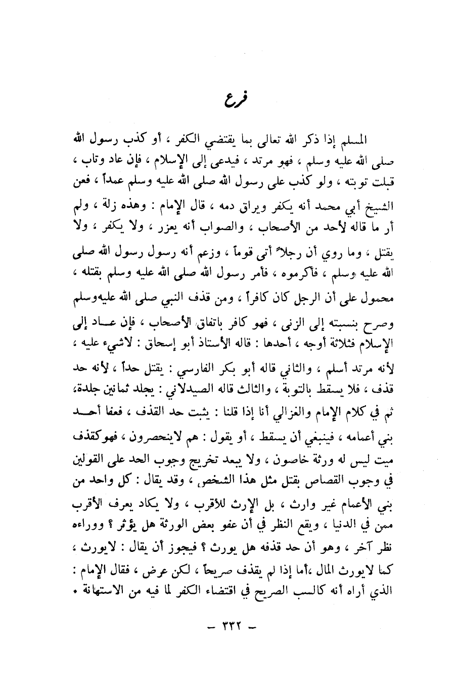 الْمُسْلِمُ إِذَا ذَكَرَ اللَّهَ تَعَالَى بِمَا يَقْتَضِي الْكُفْرَ، أَوْ كَذَّبَ رَسُولَ اللَّهِ - صَلَّى اللَّهُ عَلَيْهِ وَسَلَّمَ -، فَهُوَ مُرْتَدٌّ، فَيُدْعَى إِلَى الْإِسْلَامِ، فَإِنْ عَادَ وَتَابَ، قُبِلَتْ تَوْبَتُهُ، وَلَوْ كَذَبَ عَلَى رَسُولِ اللَّهِ - صَلَّى اللَّهُ عَلَيْهِ وَسَلَّمَ - عَمْدًا، فَعَنِ الشَّيْخِ أَبِي مُحَمَّدٍ أَنَّهُ يَكْفُرُ وَيُرَاقُ دَمُهُ، قَالَ الْإِمَامُ: وَهَذِهِ زَلَّةٌ، وَلَمْ أَرَ مَا قَالَهُ لِأَحَدٍ مِنَ الْأَصْحَابِ، وَالصَّوَابُ أَنَّهُ يُعَزَّرُ، وَلَا يَكْفُرُ، وَلَا يُقْتَلُ، وَمَا رُوِيَ أَنَّ رَجُلًا أَتَى قَوْمًا، وَزَعَمَ أَنَّهُ رَسُولُ رَسُولِ اللَّهِ - صَلَّى اللَّهُ عَلَيْهِ وَسَلَّمَ -، فَأَكْرَمُوهُ، فَأَمْرَ رَسُولُ اللَّهِ - صَلَّى اللَّهُ عَلَيْهِ وَسَلَّمَ -، بِقَتْلِهِ، مَحْمُولٌ عَلَى أَنَّ الرَّجُلَ كَانَ كَافِرًا، وَمَنْ قَذَفَ النَّبِيَّ - صَلَّى اللَّهُ عَلَيْهِ وَسَلَّمَ - وَصَرَّحَ بِنِسْبَتِهِ إِلَى الزِّنَى، فَهُوَ كَافِرٌ بِاتِّفَاقِ الْأَصْحَابِ، فَإِنْ عَادَ إِلَى الْإِسْلَامِ فَثَلَاثَةُ أَوْجُهٍ، أَحَدُهَا: قَالَ الْأُسْتَاذُ أَبُو إِسْحَاقَ: لَا شَيْءَ عَلَيْهِ، لِأَنَّهُ مُرْتَدٌّ أَسْلَمَ، وَالثَّانِي قَالَ أَبُو بَكْرٍ الْفَارِسِيُّ يُقْتَلُ حَدًّا، لِأَنَّهُ حَدُّ قَذْفٍ، فَلَا يَسْقُطُ بِالتَّوْبَةِ، وَالثَّالِثُ قَالَ الصَّيْدَلَانِيُّ: يُجْلَدُ ثَمَانِينَ جَلْدَةً، ثُمَّ فِي كَلَامِ الْإِمَامِ وَالْغَزَالِيِّ أَنَّا إِذَا قُلْنَا: يَثْبُتُ حَدُّ الْقَذْفِ، فَعَفَا أَحَدُ بَنِي أَعْمَامِهِ، فَيَنْبَغِي أَنْ يَسْقُطَ، أَوْ يَقُولَ: هُمْ لَا يَنْحَصِرُونَ، فَهُوَ كَقَذْفِ مَيِّتٍ لَيْسَ لَهُ وَرَثَةٌ خَاصُّونَ، وَلَا يَبْعُدُ تَخْرِيجُ وُجُوبِ الْحَدِّ عَلَى الْقَوْلَيْنِ فِي وُجُوبِ الْقِصَاصِ بِقَتْلِ مِثْلِ هَذَا الشَّخْصِ، وَقَدْ يُقَالُ: كُلُّ وَاحِدٍ مِنْ بَنِي الْأَعْمَامِ غَيْرُ وَارِثٍ، بَلِ الْإِرْثُ لِلْأَقْرَبِ، وَلَا يَكَادُ يُعْرَفُ الْأَقْرَب مِمَّنْ فِي الدُّنْيَا، وَيَقَعُ النَّظَرُ فِي أَنَّ عَفْوَ بَعْضِ الْوَرَثَةِ هَلْ يُؤَثِّرُ؟ وَوَرَاءَهُ نَظَرٌ آخَرُ، وَهُوَ حَدُّ قَذْفِهِ هَلْ يُوَرَّثُ؟ فَيَجُوزُ أَنْ يُقَالَ: لَا يُوَرَّثُ، كَمَا لَا يُوَرَّثُ الْمَالُ، أَمَّا إِذَا لَمْ يَقْذِفْ صَرِيحًا، لَكِنْ عَرَّضَ، فَقَالَ الْإِمَامُ: الَّذِي أَرَاهُ أَنَّهُ كَالسَّبِّ الصَّرِيحِ فِي اقْتِضَاءِ الْكُفْرِ لِمَا فِيهِ مِنَ الِاسْتِهَانَةِ.
