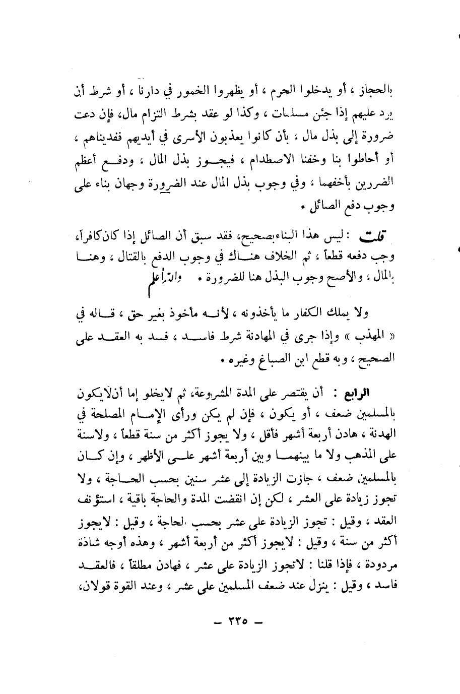 الرَّابِعُ: أَنْ يَقْتَصِرَ عَلَى الْمُدَّةِ الْمَشْرُوعَةِ، ثُمَّ لَا يَخْلُو إِمَّا أَنْ لَا يَكُونَ بِالْمُسْلِمِينَ ضَعْفٌ، أَوْ يَكُونَ، فَإِنْ لَمْ يَكُنْ وَرَأَى الْإِمَامُ الْمَصْلَحَةَ فِي الْهُدْنَةِ، هَادَنَ أَرْبَعَةَ أَشْهُرٍ فَأَقَلَّ، وَلَا يَجُوزُ أَكْثَرَ مِنْ سَنَةٍ قَطْعًا، وَلَا سَنَةً عَلَى الْمَذْهَبِ وَلَا مَا بَيْنَهُمَا وَبَيْنَ أَرْبَعَةِ أَشْهُرٍ عَلَى الْأَظْهَرِ وَإِنْ كَانَ بِالْمُسْلِمِينَ ضَعْفٌ جَازَتِ الزِّيَادَةُ إِلَى عَشْرِ سِنِينَ بِحَسَبِ الْحَاجَةِ، وَلَا تَجُوزُ زِيَادَةٌ عَلَى الْعَشْرِ، لَكِنْ إِنِ انْقَضَتِ الْمُدَّةُ وَالْحَاجَةُ بَاقِيَةٌ، اسْتُؤْنِفَ الْعَقْدُ، وَقِيلَ: تَجُوزُ الزِّيَادَةُ عَلَى عَشْرٍ بِحَسَبِ الْحَاجَةِ، وَقِيلَ: لَا يَجُوزُ أَكْثَرُ مِنْ سَنَةٍ، وَقِيلَ: لَا يَجُوزُ أَكْثَرُ مِنْ أَرْبَعَةِ أَشْهُرٍ، وَهَذِهِ أَوْجُهٌ شَاذَّةٌ مَرْدُودَةٌ، فَإِذَا قُلْنَا لَا تَجُوزُ الزِّيَادَةُ عَلَى عَشْرٍ، فَهَادَنَ مُطْلَقًا، فَالْعَقْدُ فَاسِدٌ، وَقِيلَ: يَنْزِلُ عِنْدَ ضَعْفِ الْمُسْلِمِينَ عَلَى عَشْرٍ، وَعِنْدَ الْقُوَّةِ قَوْلَانِ،