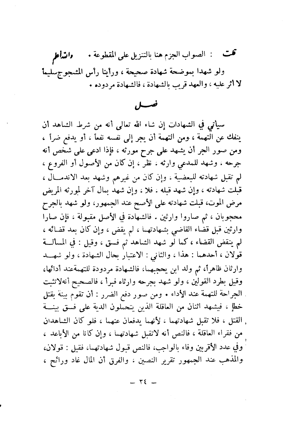 سَيَأْتِي فِي الشَّهَادَاتِ إِنْ شَاءَ اللَّهُ تَعَالَى أَنَّهُ مِنْ شَرْطِ الشَّاهِدِ أَنْ يَنْفَكَّ عَنِ التُّهْمَةِ، وَمِنَ التُّهْمَةِ أَنْ يَجُرَّ إِلَى نَفْسِهِ نَفْعًا، أَوْ يَدْفَعَ ضُرًّا، وَمِنْ صُوَرِ الْجَرِّ أَنْ يَشْهَدَ عَلَى جُرْحِ مُورِثِهِ، فَإِذَا ادَّعَى عَلَى شَخْصٍ أَنَّهُ جَرَحَهُ، وَشَهِدَ لِلْمُدَّعِي وَإِرْثِهِ، نُظِرَ، إِنْ كَانَ مِنَ الْأُصُولِ أَوِ الْفُرُوعِ، لَمْ تُقْبَلْ شَهَادَتُهُ لِلْبَعْضِيَّةِ، وَإِنْ كَانَ مِنْ غَيْرِهِمْ وَشَهِدَ بَعْدَ الِانْدِمَالِ، قُبِلَتْ شَهَادَتُهُ، وَإِنْ شَهِدَ قَبْلَهُ، فَلَا، وَإِنْ شَهِدَ بِمَالٍ آخَرَ لِمُورِثِهِ الْمَرِيضِ مَرَضَ الْمَوْتِ، قُبِلَتْ شَهَادَتُهُ عَلَى الْأَصَحِّ عِنْدَ الْجُمْهُورِ، وَلَوْ شَهِدَ بِالْجُرْحِ مَحْجُوبَانِ، ثُمَّ صَارَا وَارِثَيْنِ، فَالشَّهَادَةُ فِي الْأَصْلِ مَقْبُولَةٌ، فَإِنْ صَارَا وَارِثَيْنِ قَبْلَ قَضَاءِ الْقَاضِي بِشَهَادَتِهِمَا، لَمْ يُقْضَ، وَإِنْ كَانَ بَعْدَ قَضَائِهِ، لَمْ يَنْقَضِ الْقَضَاءُ، كَمَا لَوْ شَهِدَ الشَّاهِدُ ثُمَّ فَسَقَ، وَقِيلَ: فِي الْمَسْأَلَةِ قَوْلَانِ، أحَدُهُمَا: هَذَا، وَالثَّانِي: الِاعْتِبَارُ بِحَالِ الشَّهَادَةِ، وَلَوْ شَهِدَ وَارِثَانِ ظَاهِرًا، ثُمَّ وُلِدَ ابْنٌ يَحْجُبُهُمَا، فَالشَّهَادَةُ مَرْدُودَةٌ لِلتُّهْمَةِ عِنْدَ أَدَائِهَا، وَقِيلَ بِطَرْدِ الْقَوْلَيْنِ، وَلَوْ شَهِدَ بِجُرْحِهِ وَارِثَاهُ فَبَرَأَ، فَالصَّحِيحُ أَنَّهُ لَا تَثْبُتُ الْجِرَاحَةُ لِلتُّهْمَةِ عِنْدَ الْأَدَاءِ.
